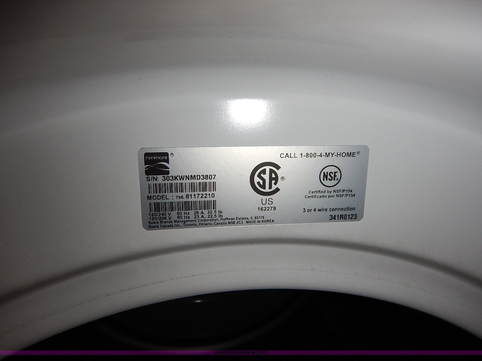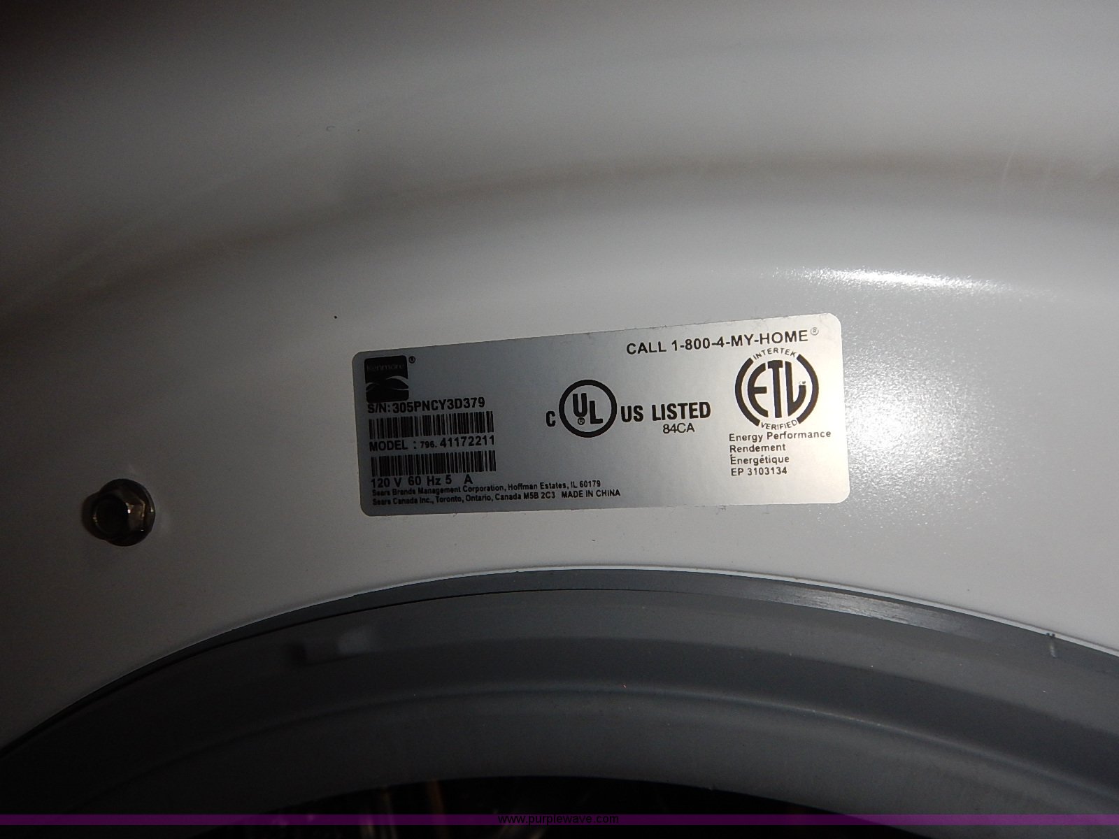 Purple Wave is selling a used Appliances in Kansas. This item is a Assorted appliances with the following: Kenmore 81172210 dryer, Power cord, Serial 303KWNMD3807, Kenmore 41172211 front load washer, Stainless steel drum, Drain hose, Power cord, Serial 305PNCY3P379, Manuals, Unknown operating condition