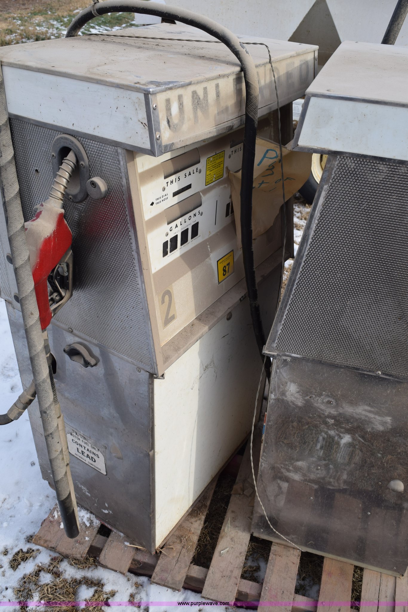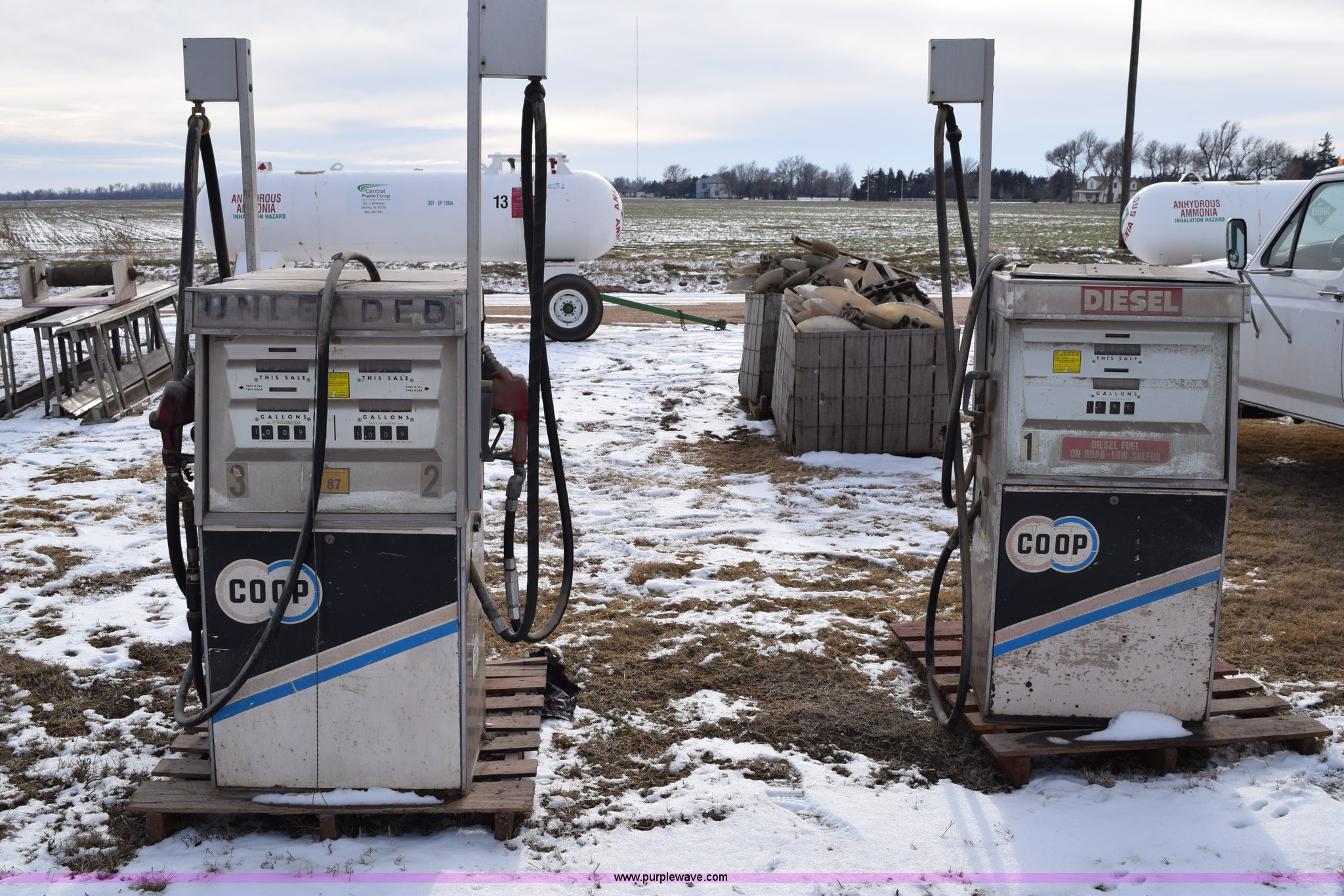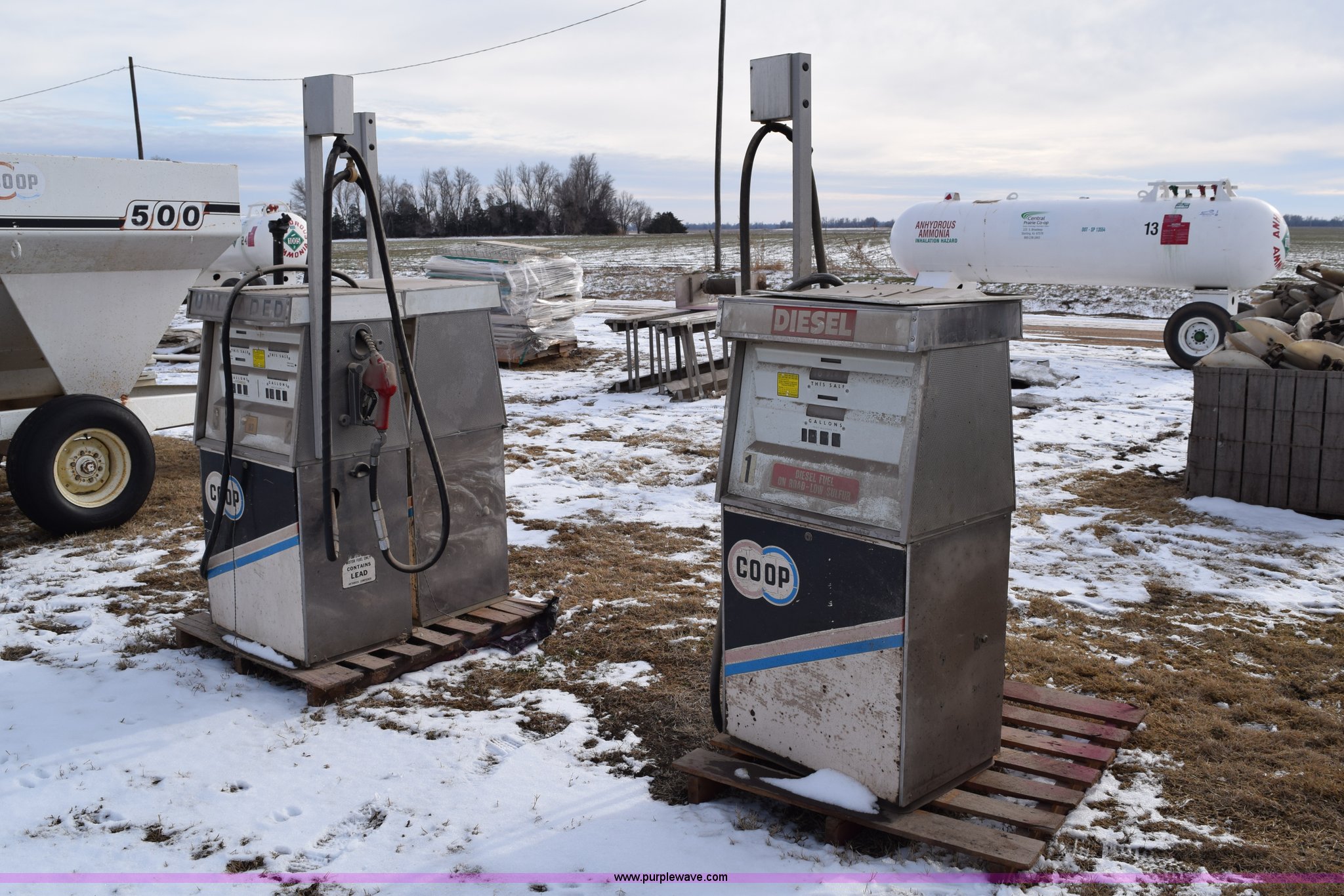 (3) gas pumps. 25"W x 50"H, Face has been removed on one side of one pump, One pump has two nozzles, One pump has one nozzles, One pump has no nozzles. Central Prairie Coop. 100 S Pioneer St. Alden, KS 67512