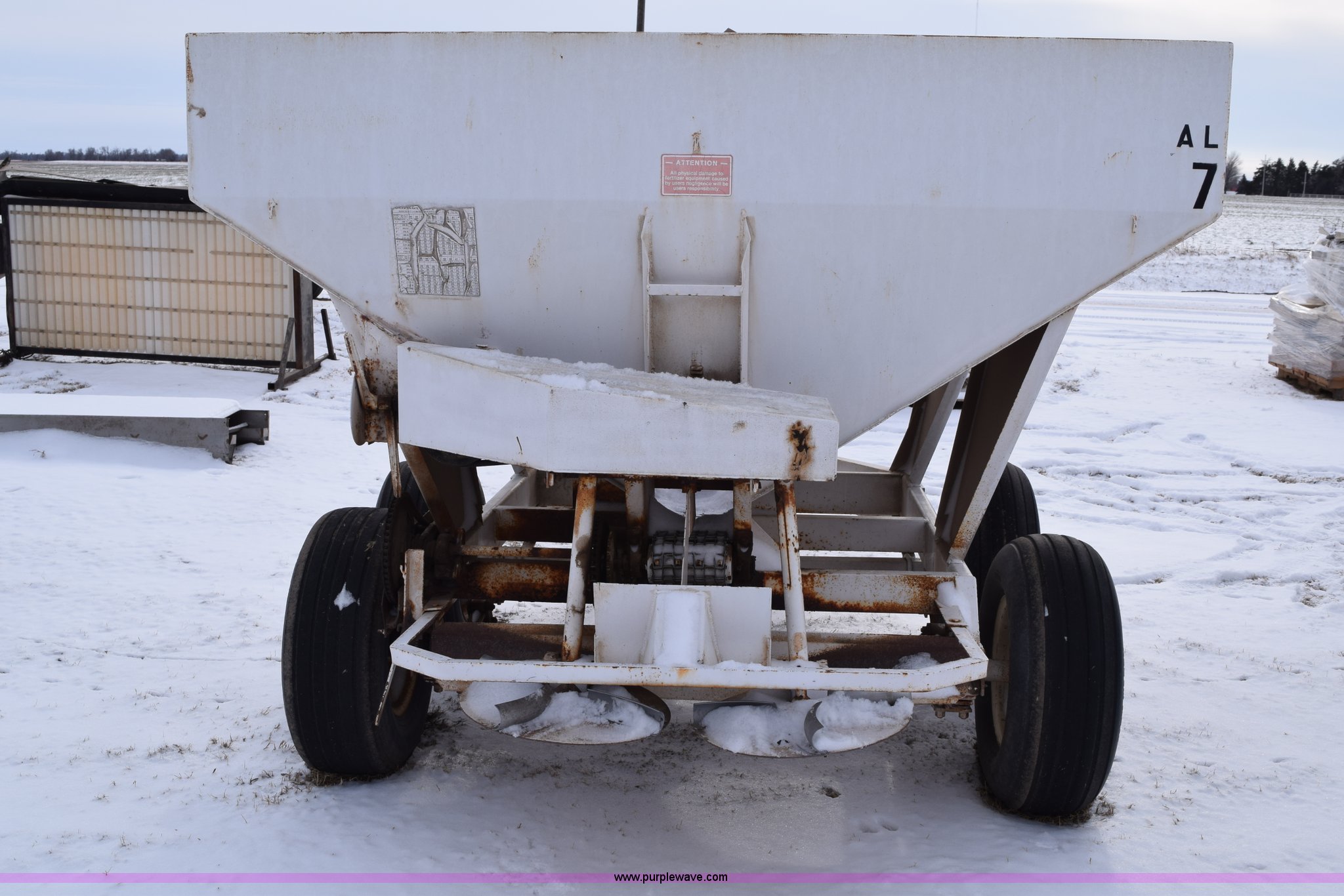 Purple Wave is selling a used Applicator Pull Type in Kansas. This item is a Fertilizer spreader buggy with the following: 8'L x 7.5'W, Twin disk spinners, PTO driven, Ground driven conveyor, Pin hitch, Jack stand, 11L-15SL tires, Rust, Unit# AL7