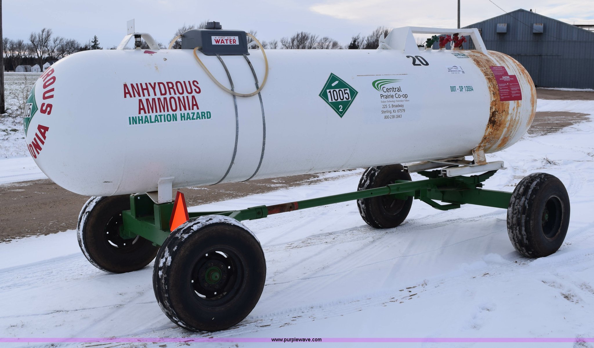 Purple Wave is selling a used Applicator Pull Type in Kansas. This item is a Anhydrous ammonia nurse tank with the following: 1,000 gallon capacity, Approx. 16'L, Pin hitch, 11L-15L tires, Unit# 20