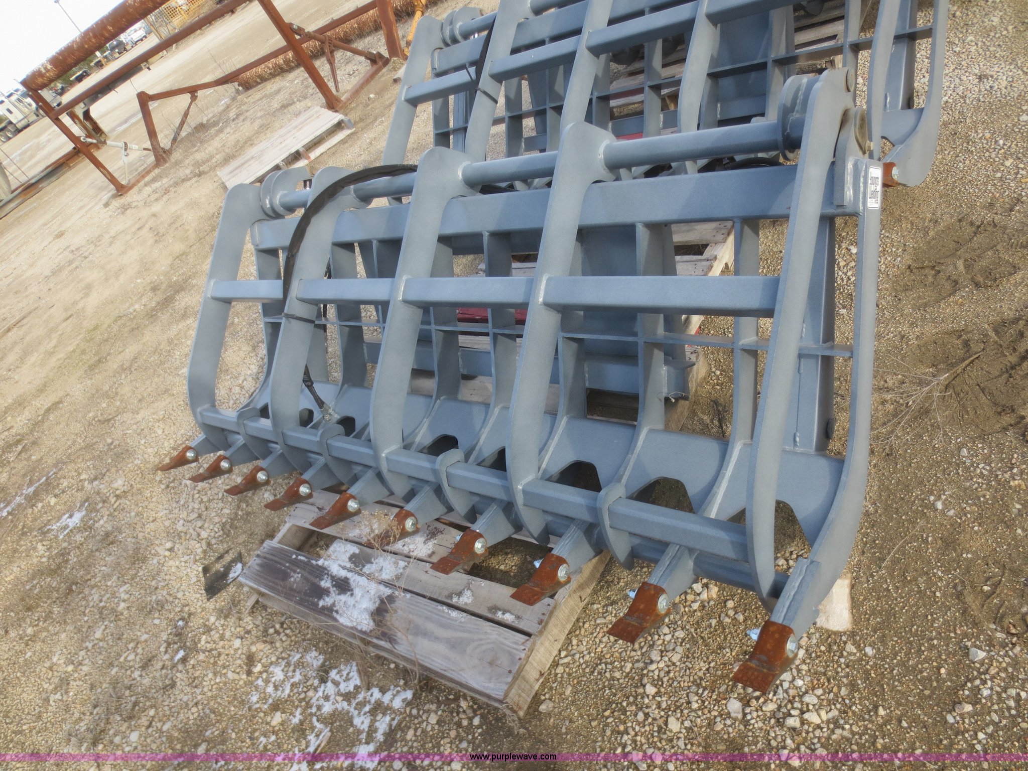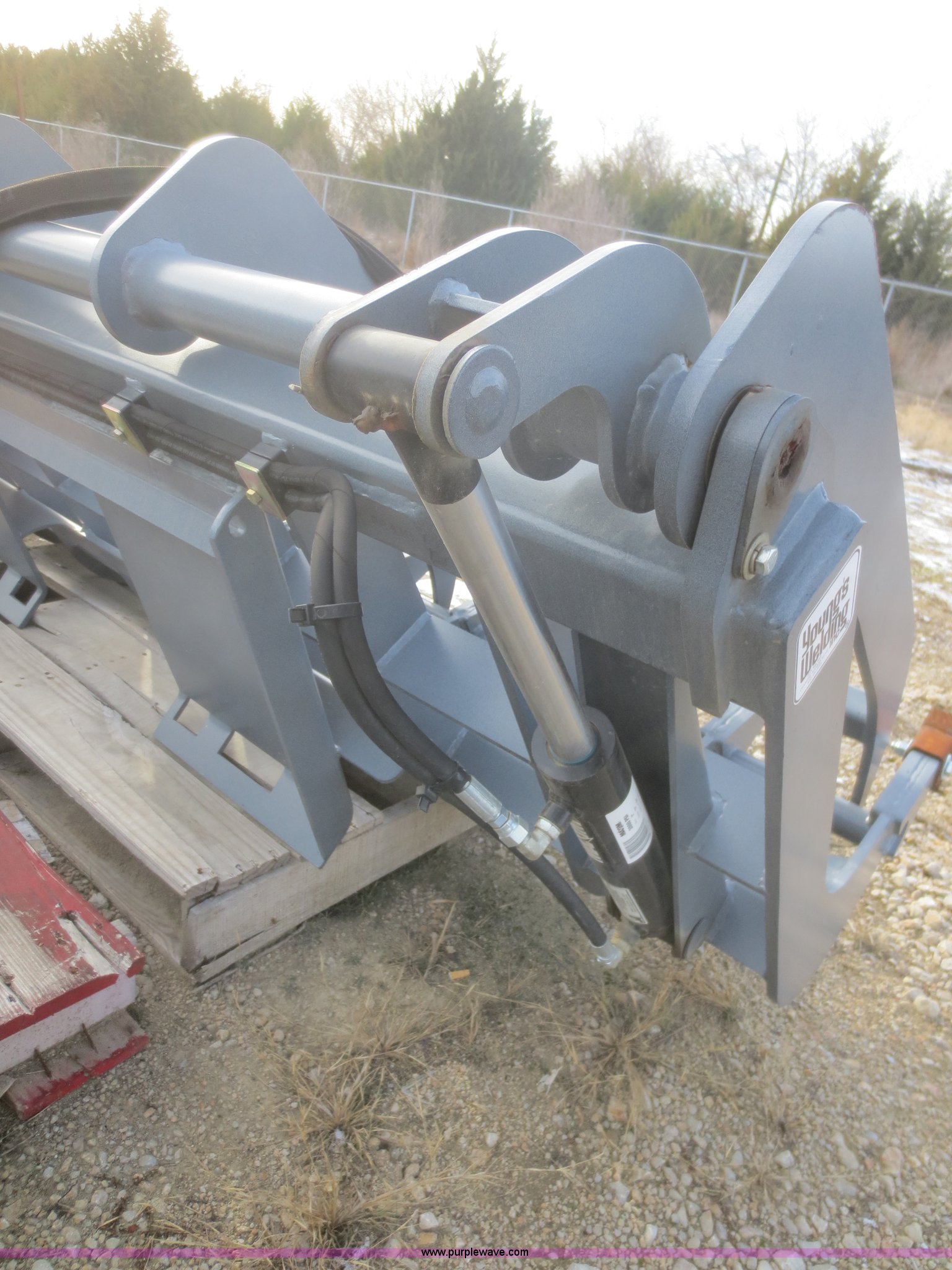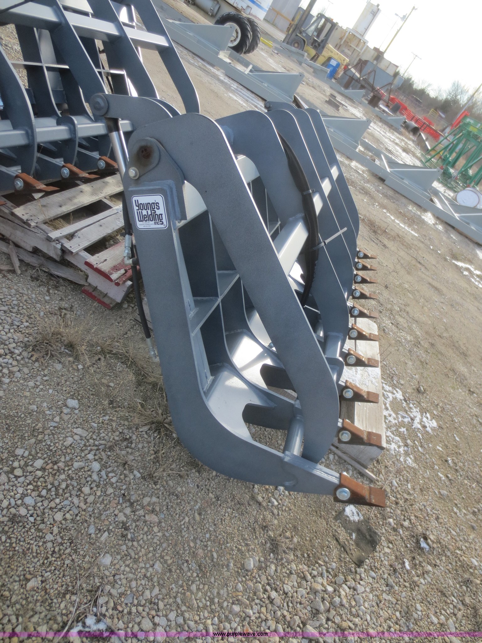 Purple Wave is selling a used Skid Steer Attach. in Kansas. This item is a Youngs Welding 84" root grapple with the following: Twin hydraulic cylinders, 10" stroke, 3,000 psi, 1/2" thick tines, Grade 50 steel construction, 9" tine spread, Bolt-on teeth, 55" opening, Horizontal pass through cross member, Powder coat, Hydraulic hoses, 8" dig ability