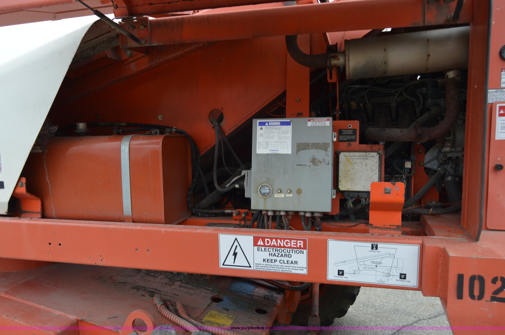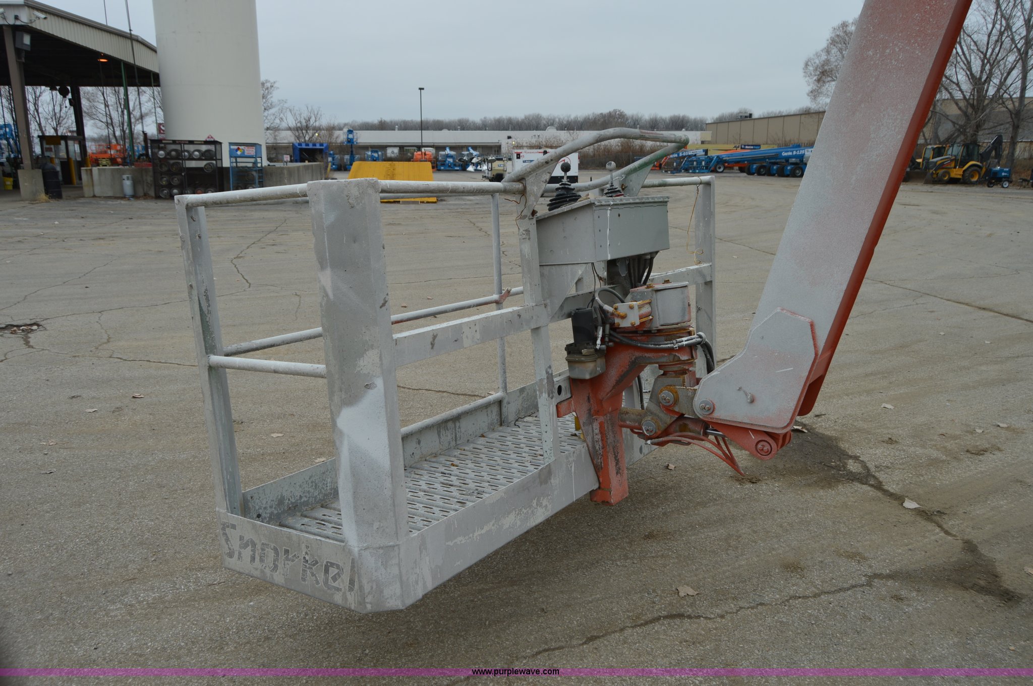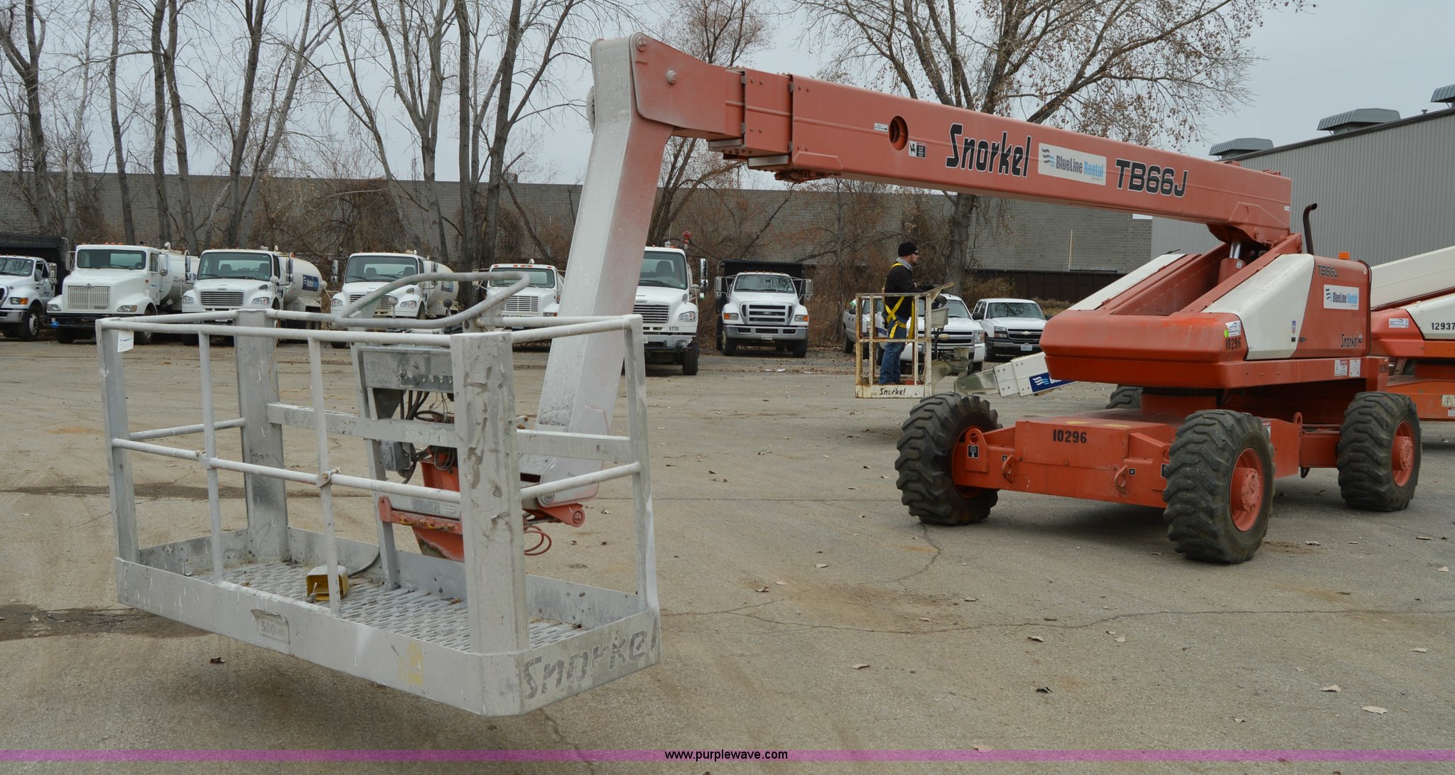 2001 Snorkel TB66J boom lift. 4,778 hours on meter, Four cylinder gas engine, Four wheel drive, 500 lbs maximum lift capacity, 65.9' maximum platform height, 65.1' maximum platform reach, 8'L x 32" platform, Ground and platform controls, Power to platform, Three mile per hour maximum travel speed, 13" ground clearance, 8.8' wheelbase, 15-19.5 foam filled tires, 25,000 lbs. base operating weight, Serial AG01205, Unit # 10296. Blueline Rental. 4120 East Front Street. Kansas City, MO 64120