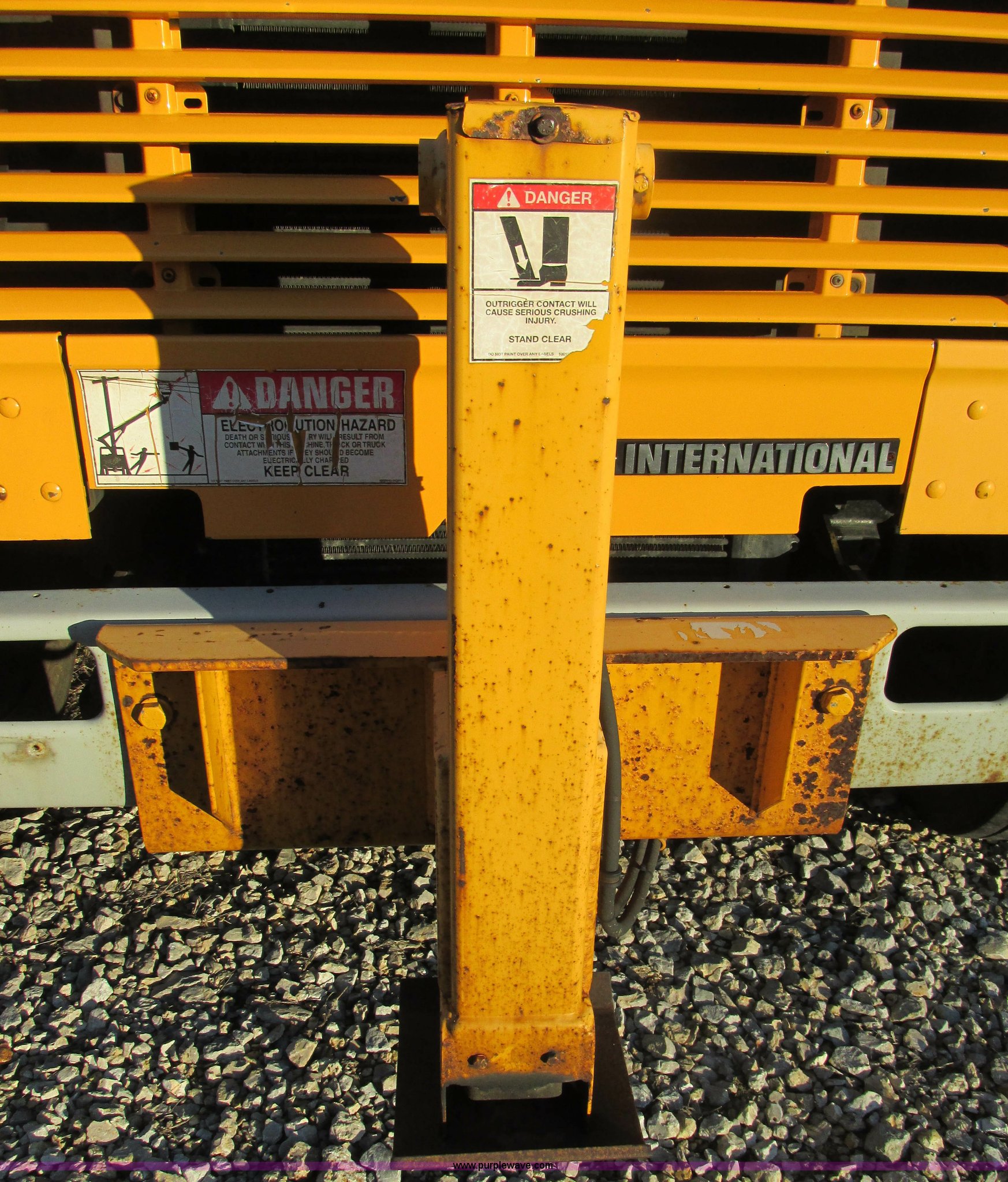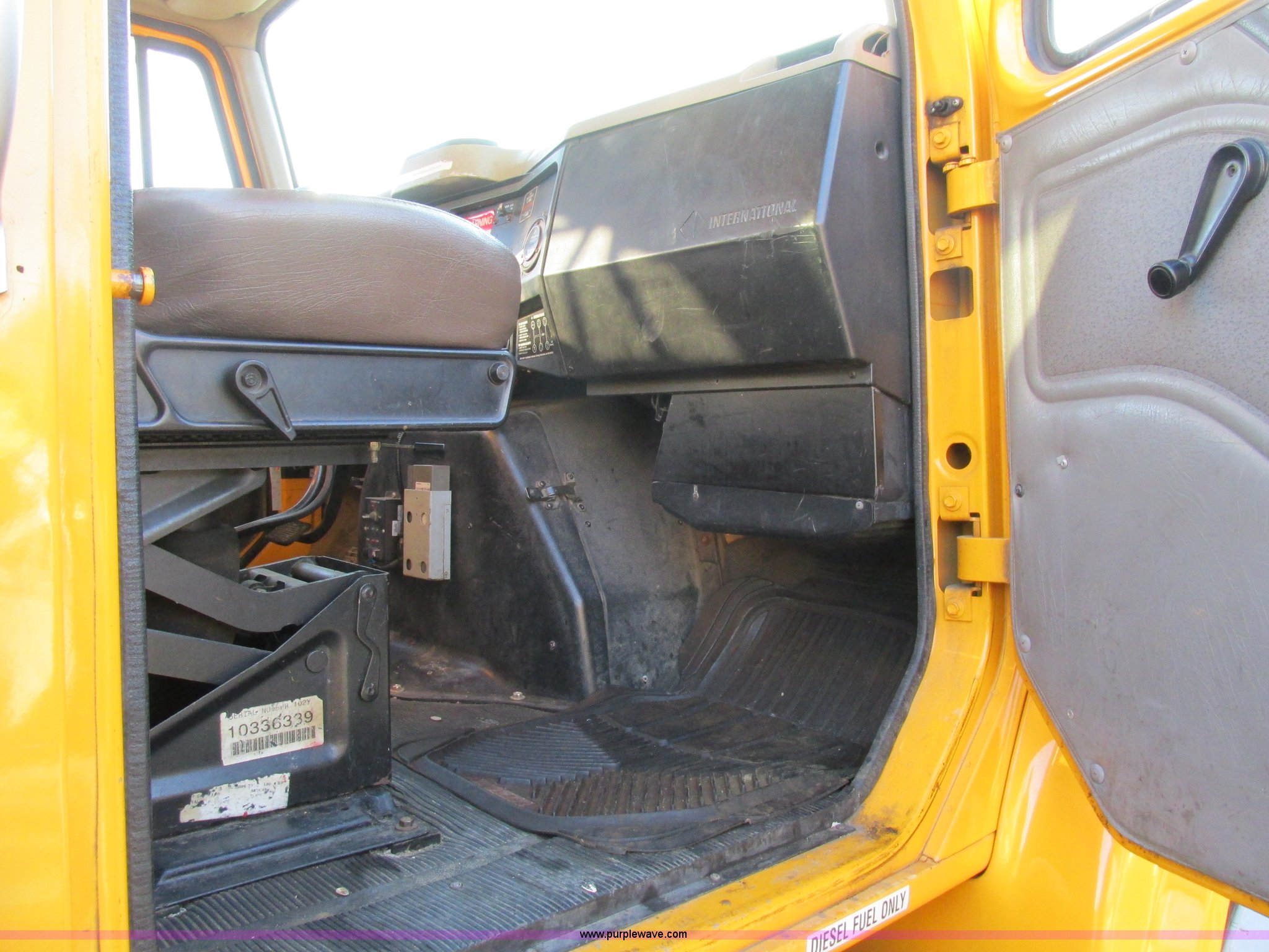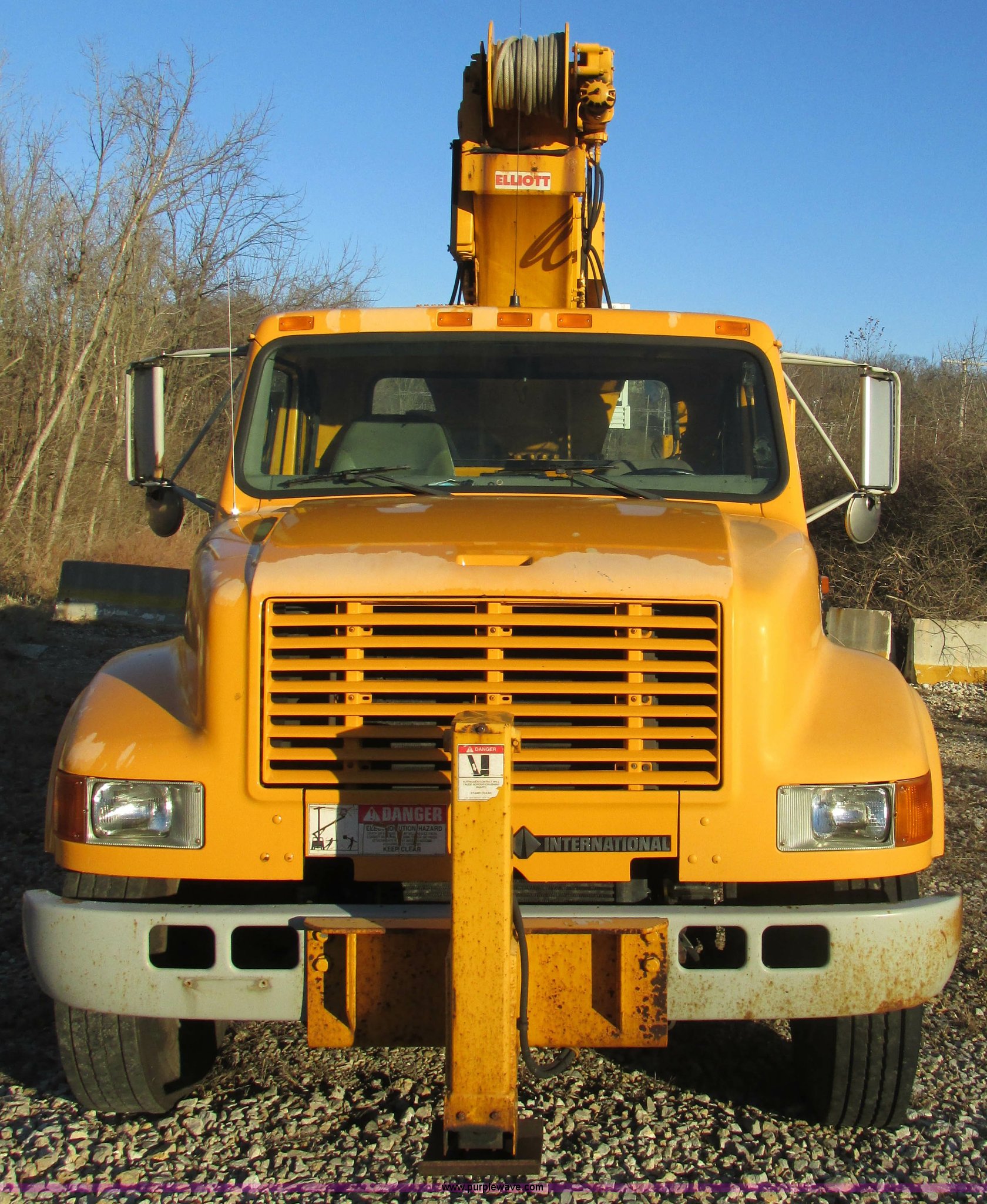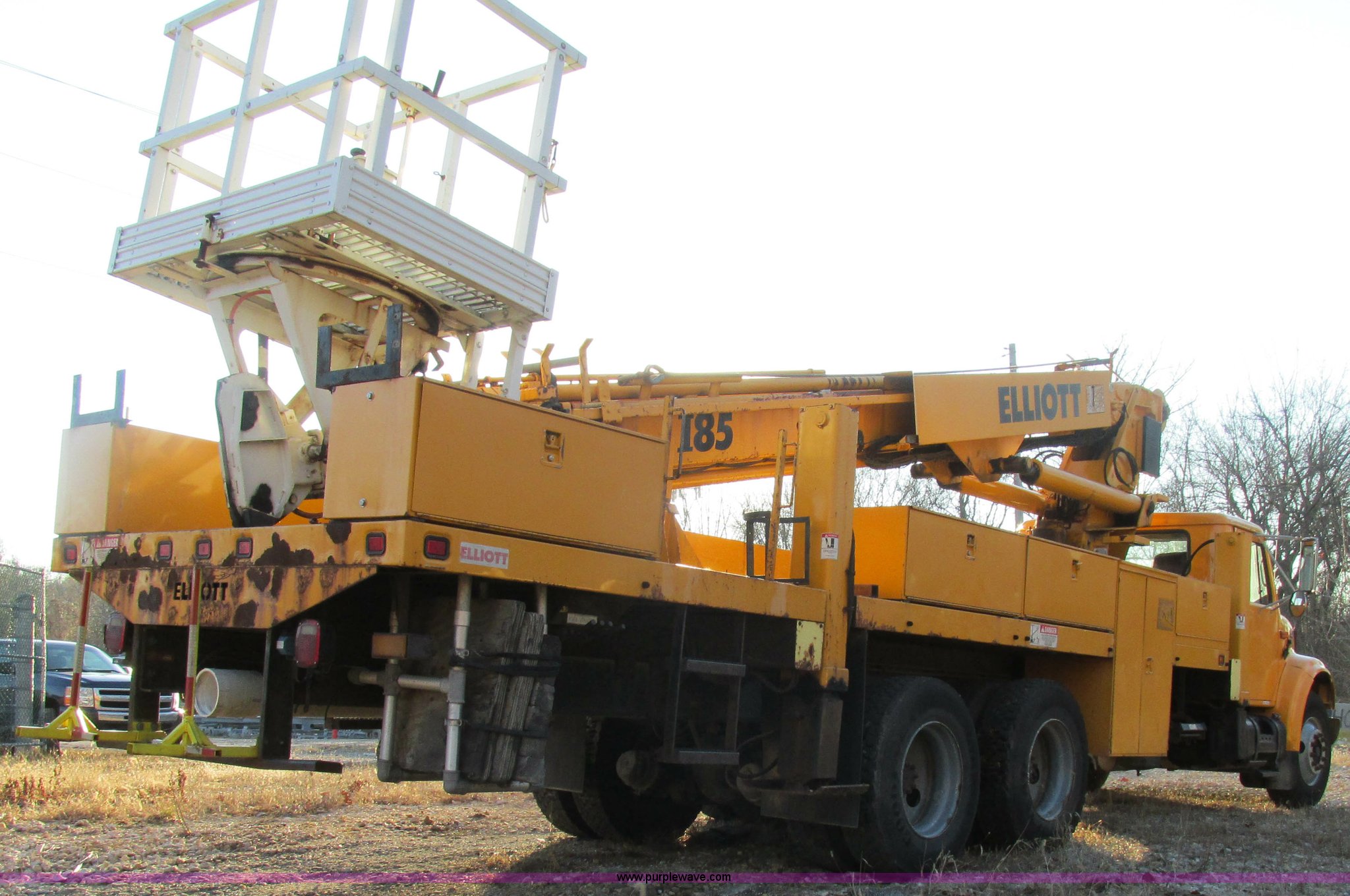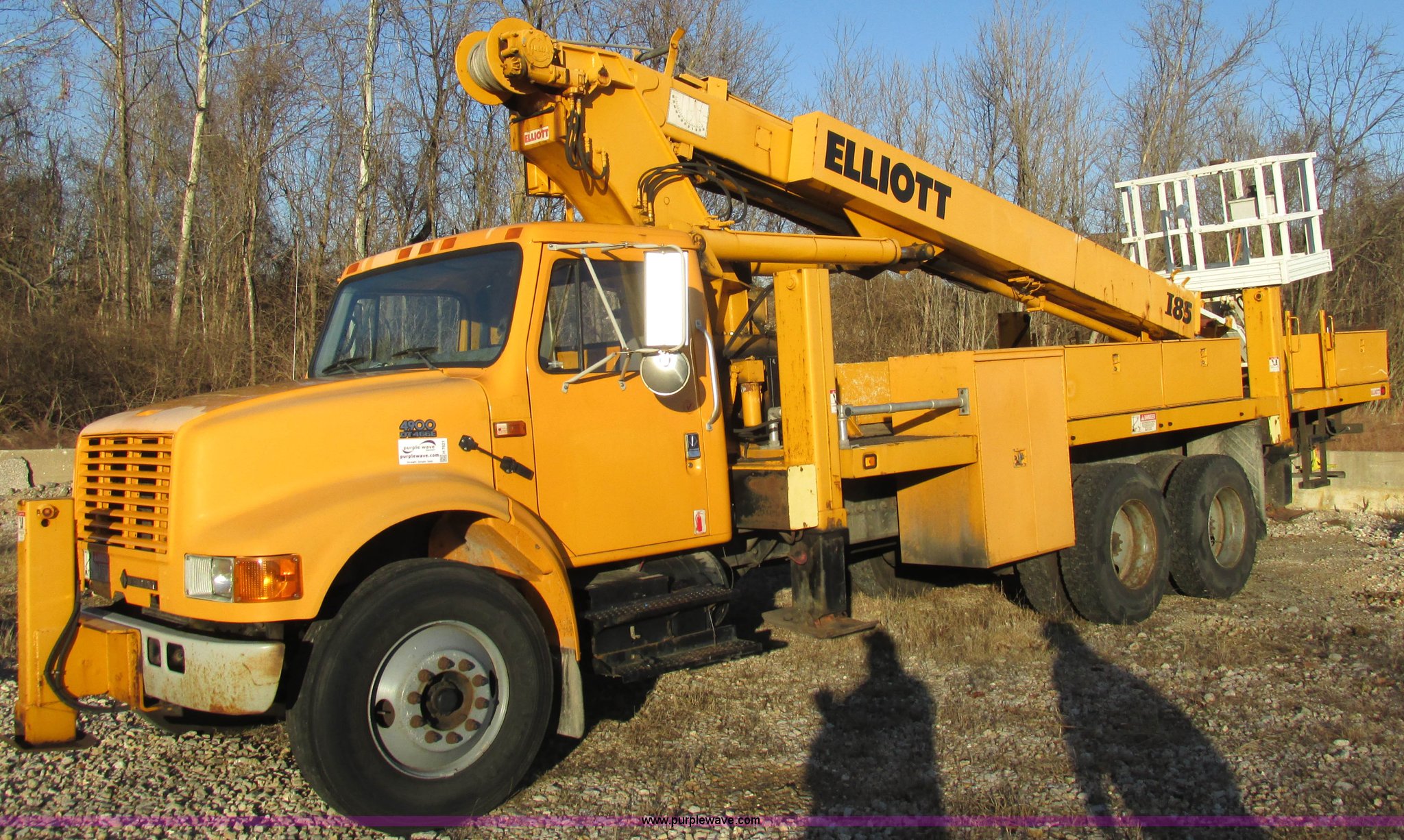 Purple Wave is selling a used Bucket Truck in Missouri. This item is a 2001 International 4900 bucket truck with the following: 160,060 actual miles, 5,803 hours on meter, International DT466E 7.6L L6 diesel engine, Nine speed manual transmission, Locking power divider, Heat, AM/FM, Air suspension seat, PTO, 24'4"L x 8'W bed, (5) toolboxes, 48" x 18" x 18", (4) outriggers, Front stabilizer, Elliot 185 boom lift, Man basket, Ground controls only, Tulsa winch, 45 gallon fuel tank, Spring over walking beam suspension, Air brakes, 224" wheelbase, 11R22.5 tires, Interior/exterior cosmetic damage, One toolbox damaged