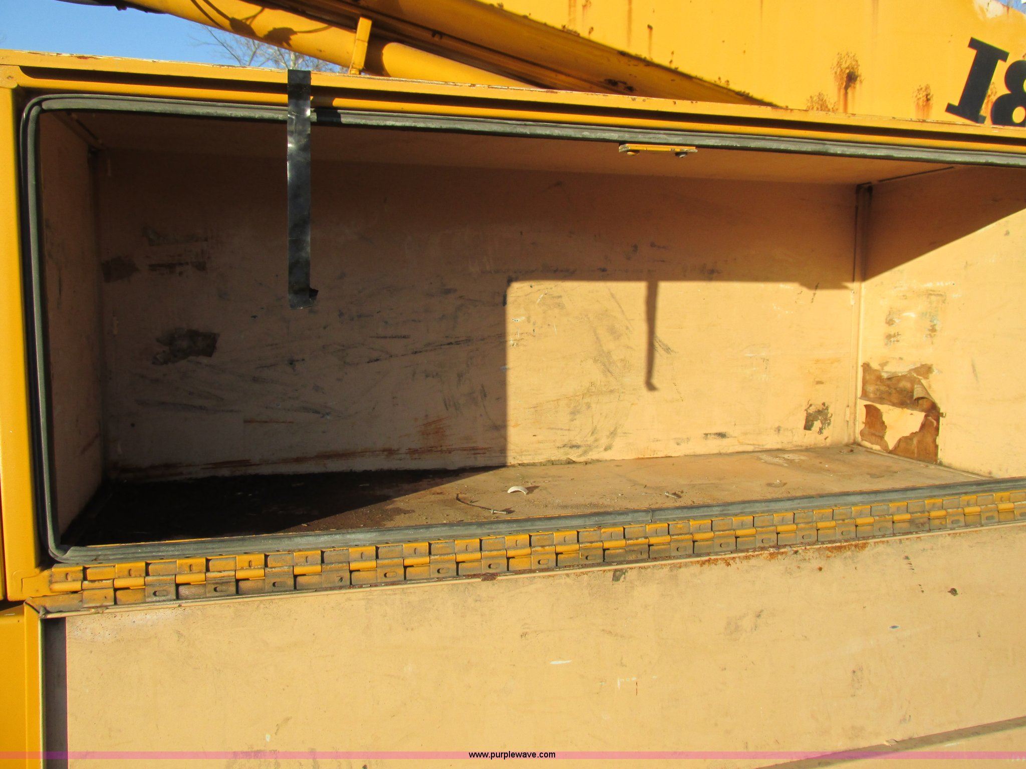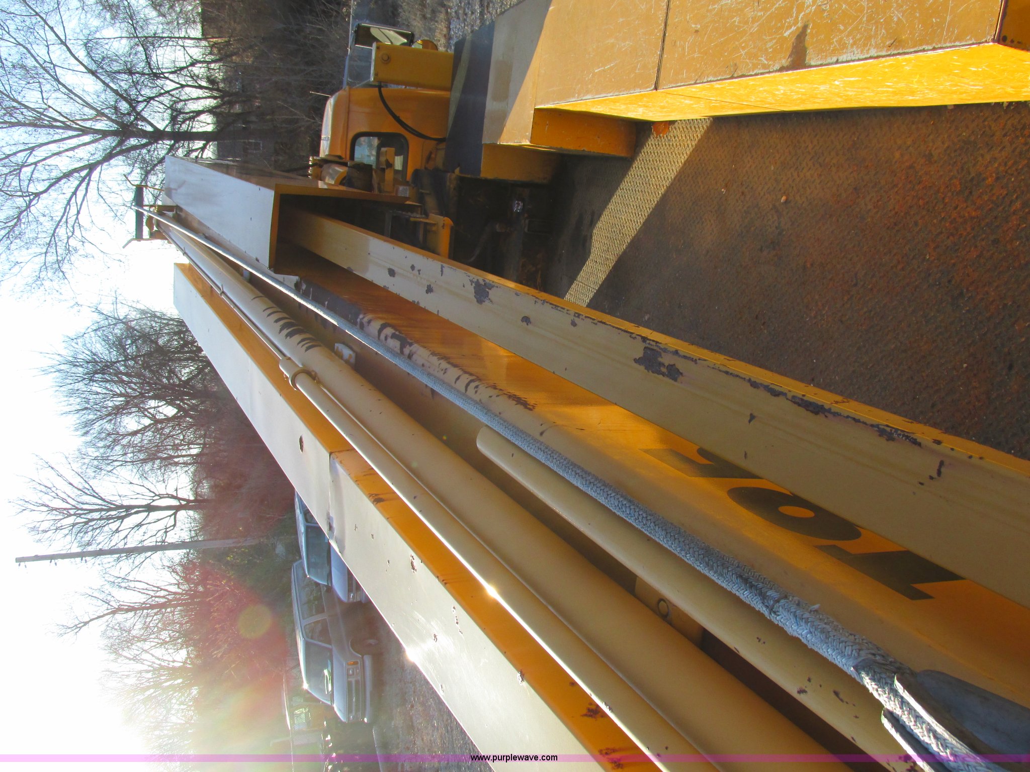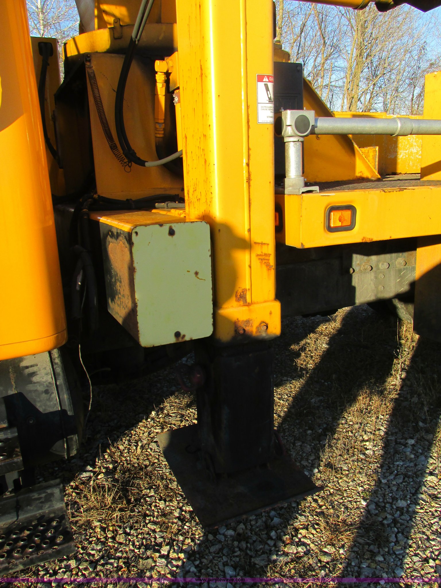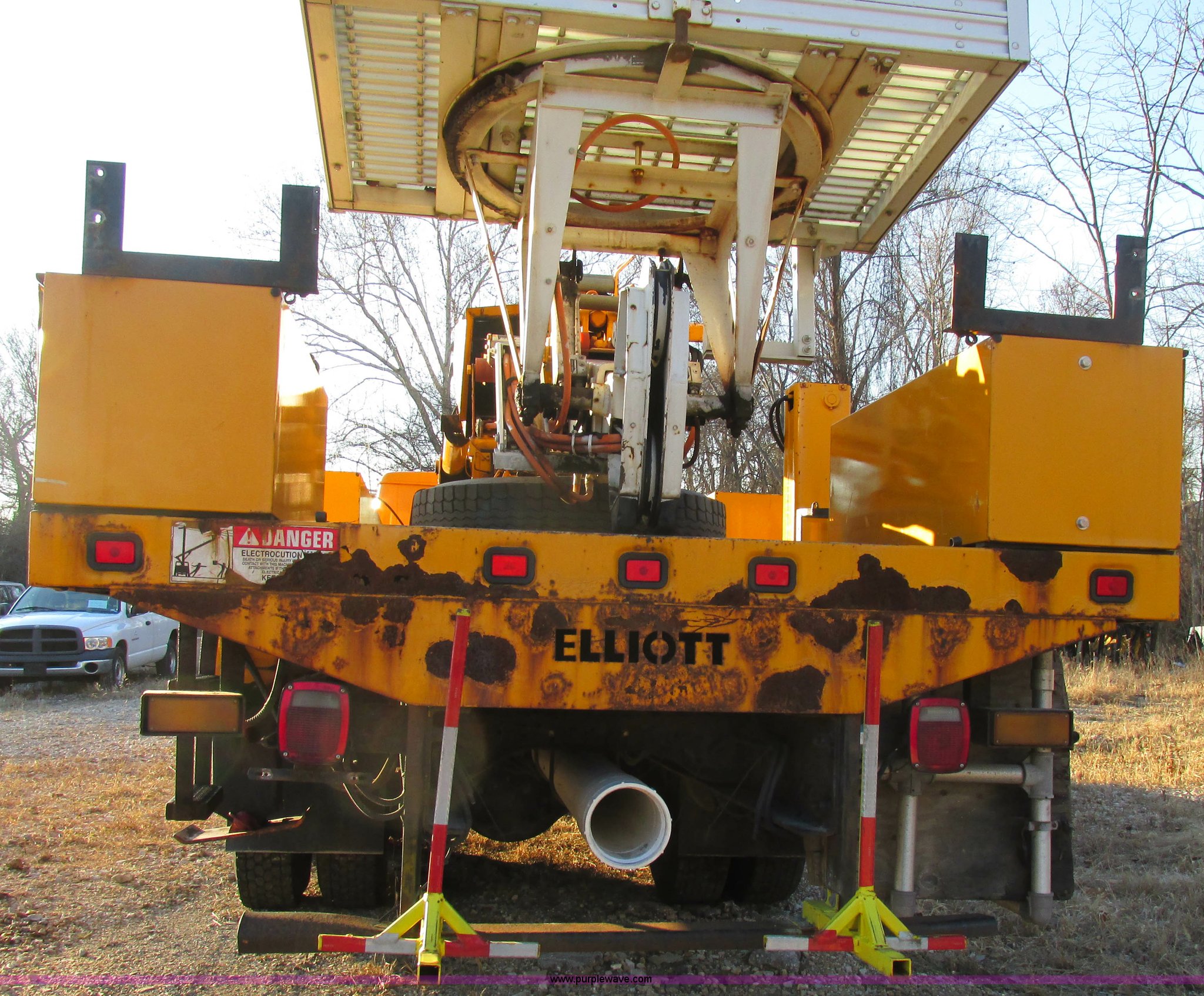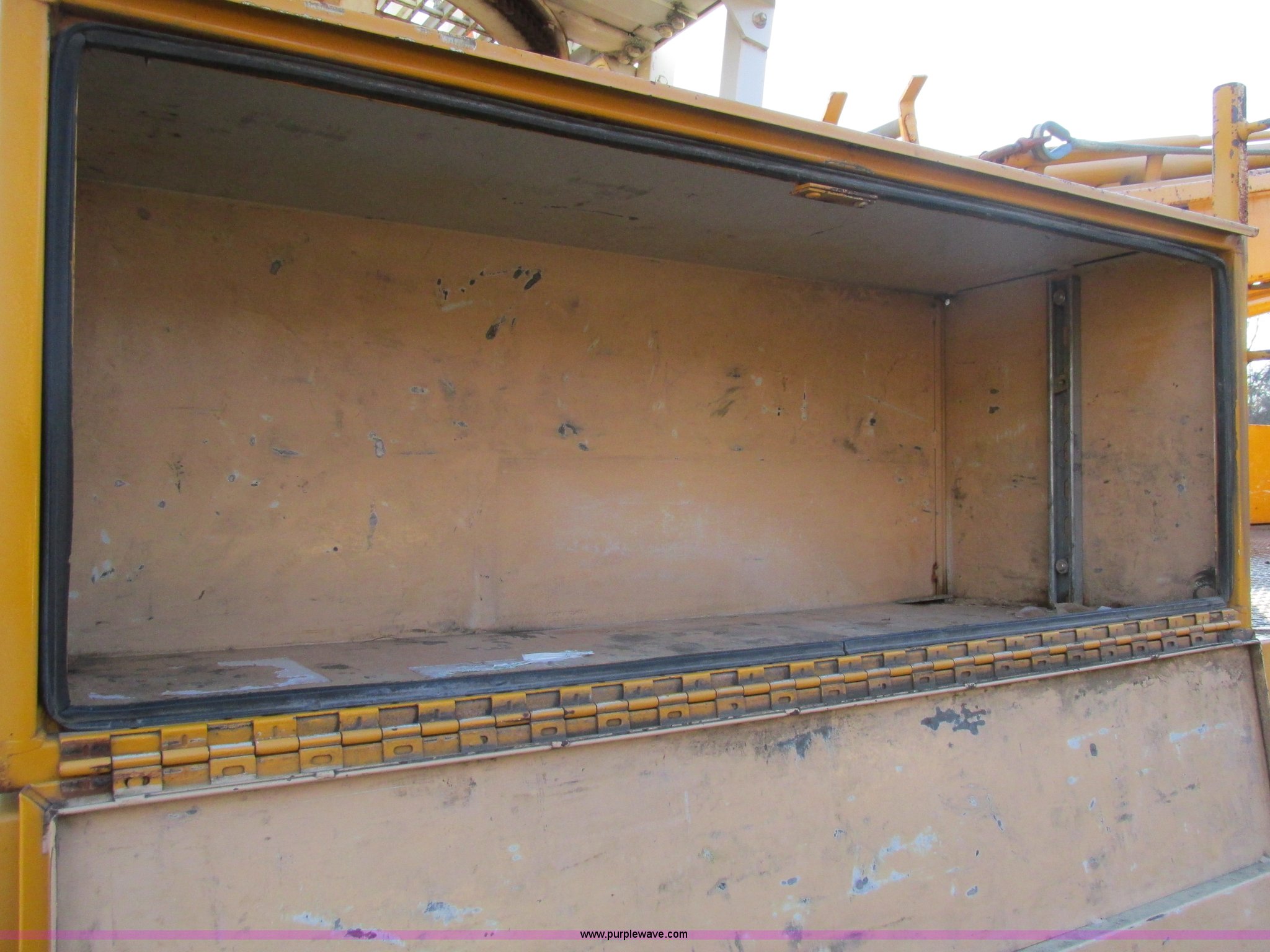 Purple Wave is selling a used Bucket Truck in Missouri. This item is a 2001 International 4900 bucket truck with the following: 160,060 actual miles, 5,803 hours on meter, International DT466E 7.6L L6 diesel engine, Nine speed manual transmission, Locking power divider, Heat, AM/FM, Air suspension seat, PTO, 24'4"L x 8'W bed, (5) toolboxes, 48" x 18" x 18", (4) outriggers, Front stabilizer, Elliot 185 boom lift, Man basket, Ground controls only, Tulsa winch, 45 gallon fuel tank, Spring over walking beam suspension, Air brakes, 224" wheelbase, 11R22.5 tires, Interior/exterior cosmetic damage, One toolbox damaged
