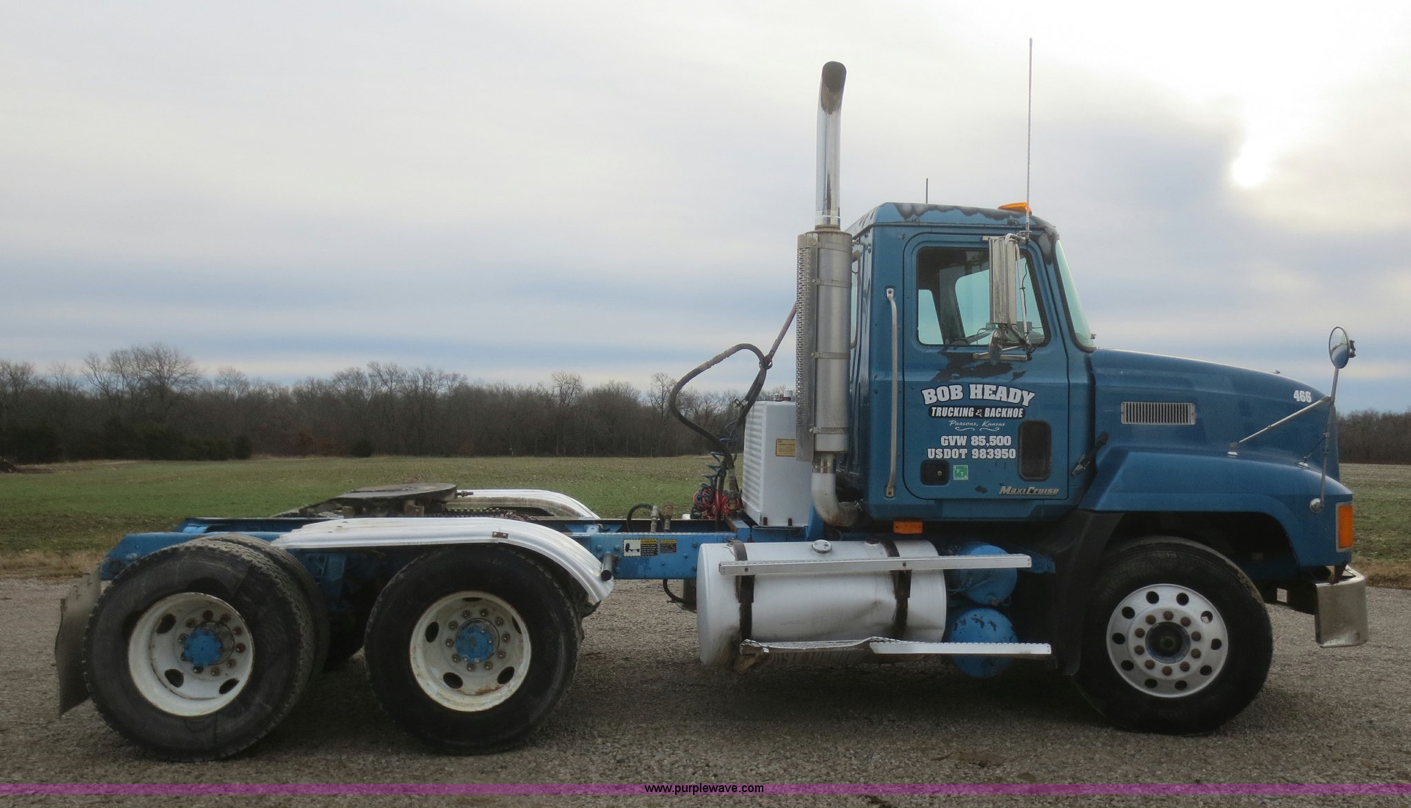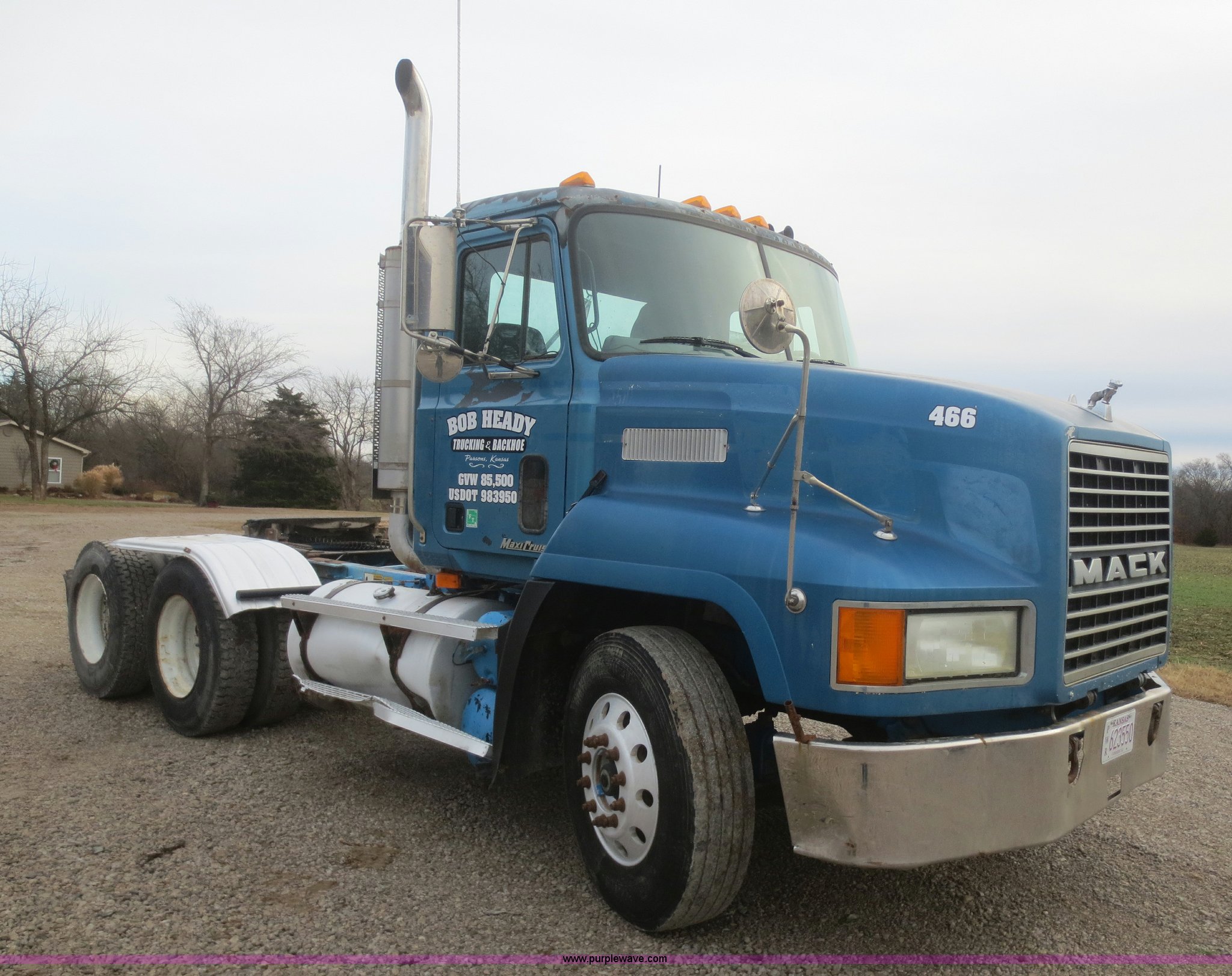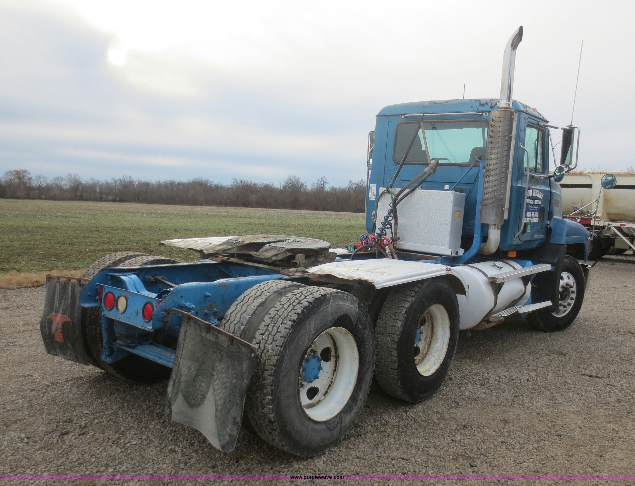 Purple Wave is selling a used Truck Tractor in Kansas. This item is a 1998 Mack CH613 semi truck with the following: 52,985 miles on odometer, 2,097 hours on meter, Odometers has been replaced, Mack E7 12.0L L6 diesel engine, 355 HP floor, 380 HP cruise, 10 speed manual transmission, AC and heat, Tilt, Cruise, AM/FM/cassette, Passenger daylight door, Telescoping steering wheel, Air suspension seat, Air ride cab, CB included, Single and double line hydraulics, Chrome bumper, Block heater, Air slide fifth wheel, Dual 104 gallon fuel tanks, Single rear exhaust stack, Aluminum half fenders, PTO, Wet kit, Dump valves, Air suspension, Air brakes, Brake controller, Jake brake, Air gauge for rear axle weight, 168" wheelbase, 11R22.5 tires, FAWR 12,000 lbs, IAWR 19,000 lbs, RAWR 19,000 lbs