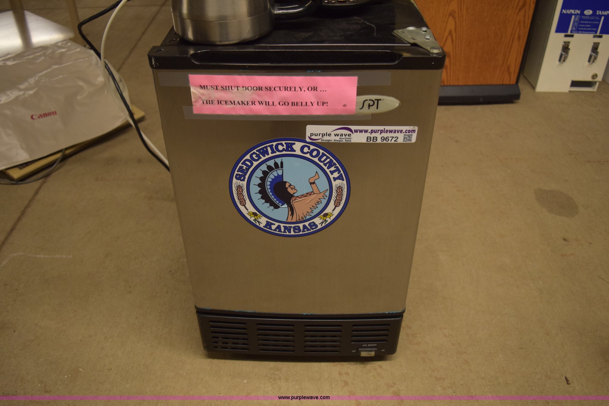 Purple Wave is selling a used Restaurant Equip. in Kansas. This item is a Assorted restaurant equipment with the following: SPT under counter ice maker, Mr. Coffee coffee maker, Coffee pot