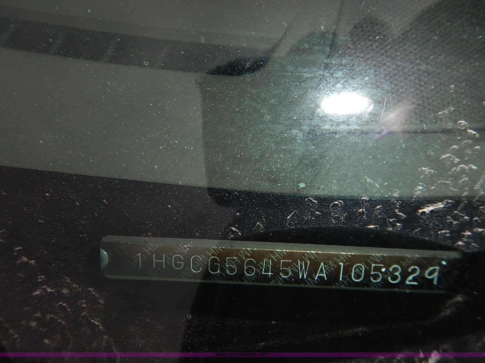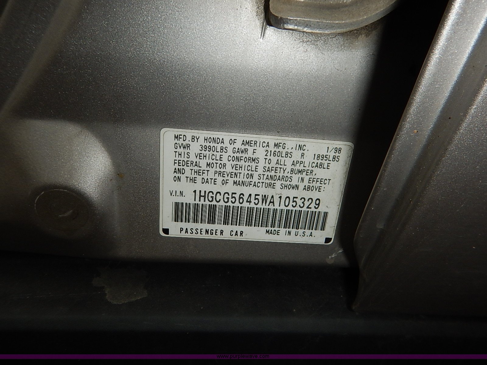 1998 Honda Accord LX. Unknown miles on odometer, 2.3L L4 SOHC 16V gas engine, Automatic transmission, AC and heat, Tilt, Cruise, AM/FM/CD, Power windows, locks, and mirrors, Cloth interior, 195/65R15 tires, Interior/exterior cosmetic damage, Cracked windshield, Unknown operating condition, Rust, No keys. Seller is a Missouri licensed motor vehicle dealer. Title will be assigned and distributed by the dealer. Please contact the seller for distribution questions. 1HGCG5645WA105329. CCI Towing and Recovery. 148 NE Mcquerry Rd. Grain Valley, MO 64029