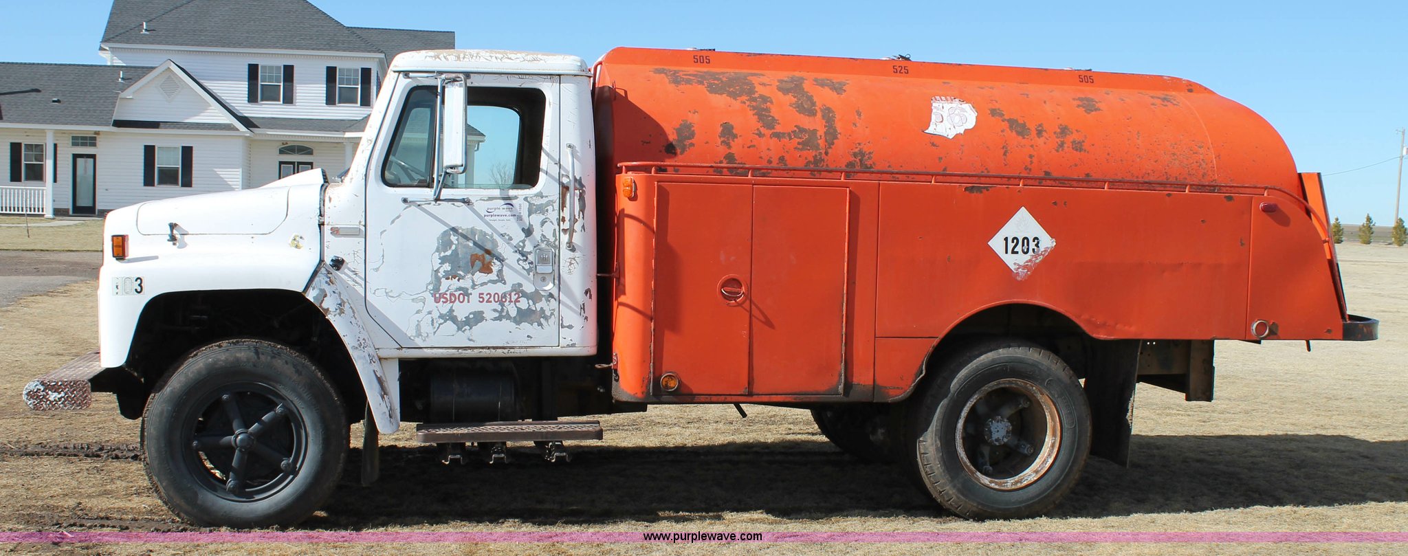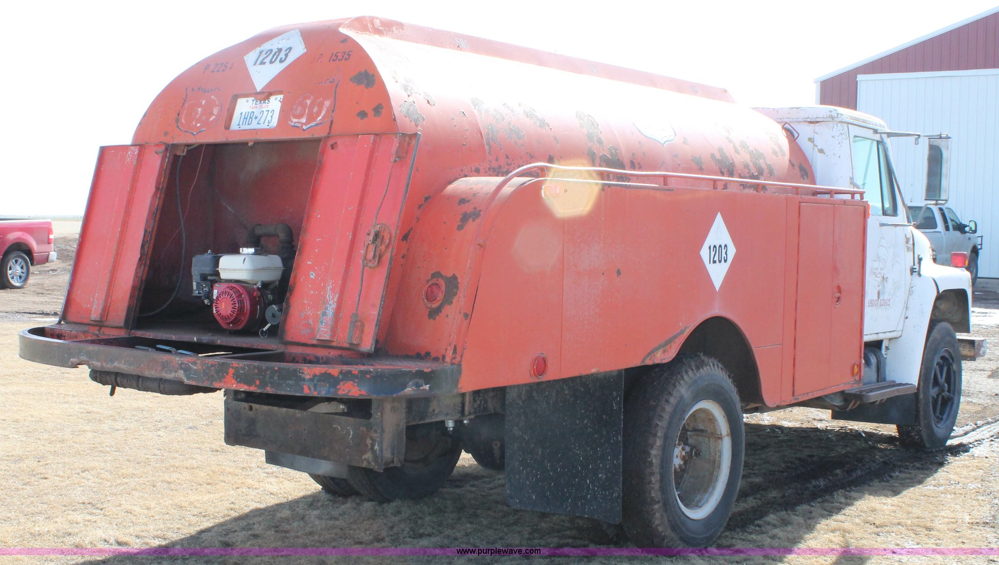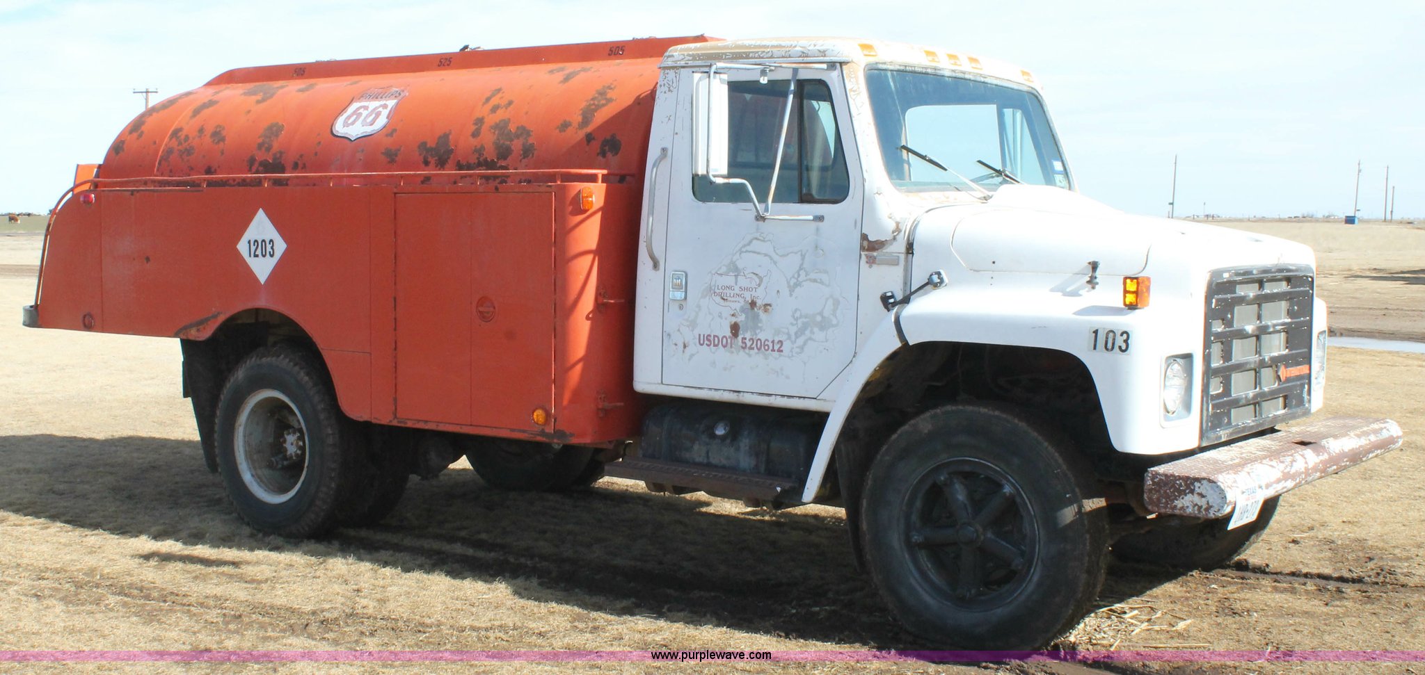 Purple Wave is selling a used Fuel Truck in Texas. This item is a 1979 International fuel truck with the following: 75,721 miles on odometer, International eight cylinder gas engine, Automatic transmission, (3) 1,535 gallon compartment fuel tank, 525 gallon compartment, (2) 505 gallon compartment, (2) side and one rear storage compartments, Honda transfer pump, Fueling hose, meter, and PTO pump, 9.00-20 tires