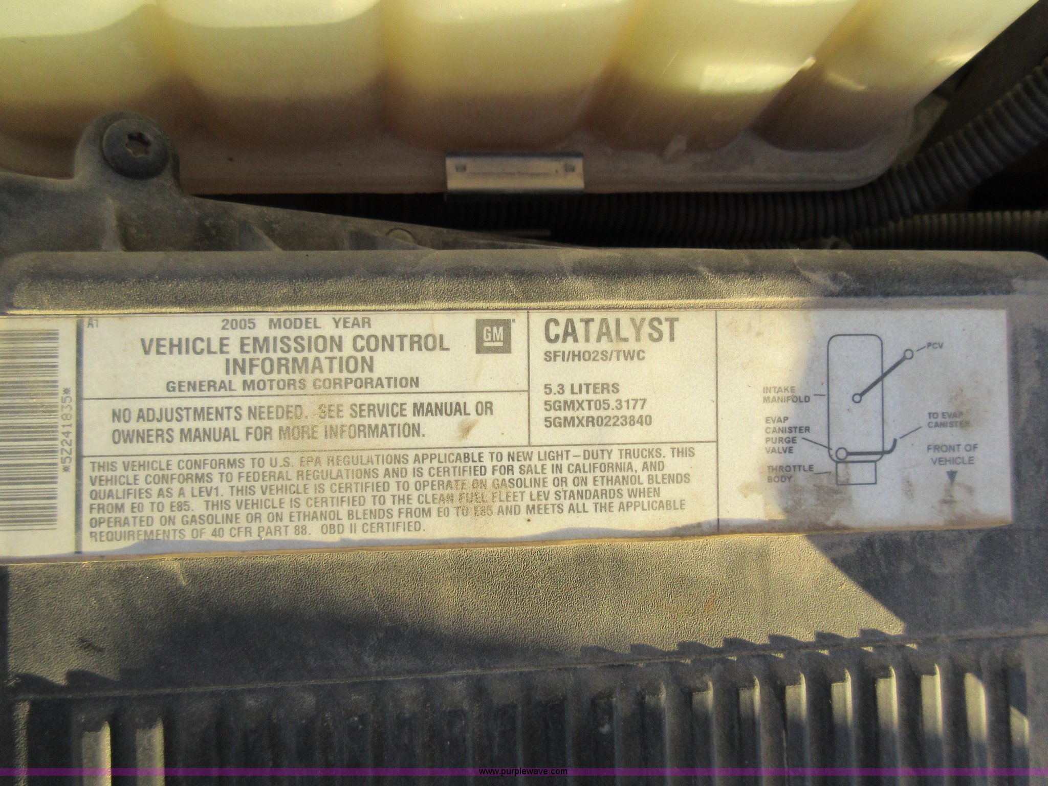 Purple Wave is selling a used 1/2 Ton Pickup or Van in Missouri. This item is a 2005 Chevrolet Silverado 1500 pickup truck with the following: 184,396 miles on odometer, 5.3L V8 OHV 16V FFV gas engine, Automatic transmission, AC and heat, Tilt, Cruise, AM/FM, Cloth interior, Receiver hitch, Trailer wiring, 245/75R17 tires, Dents, Rust, Interior/exterior cosmetic damage, Unit# B5922