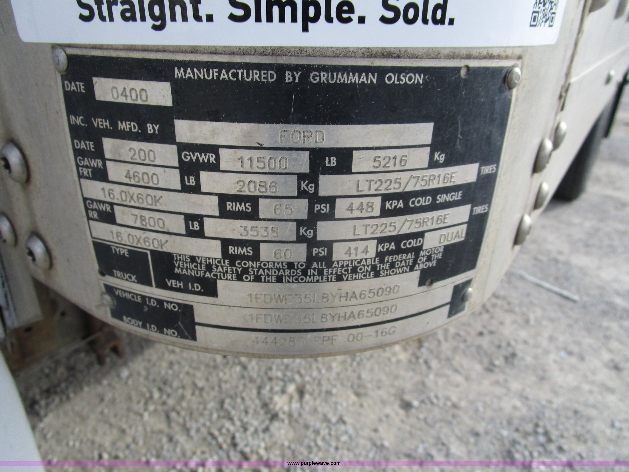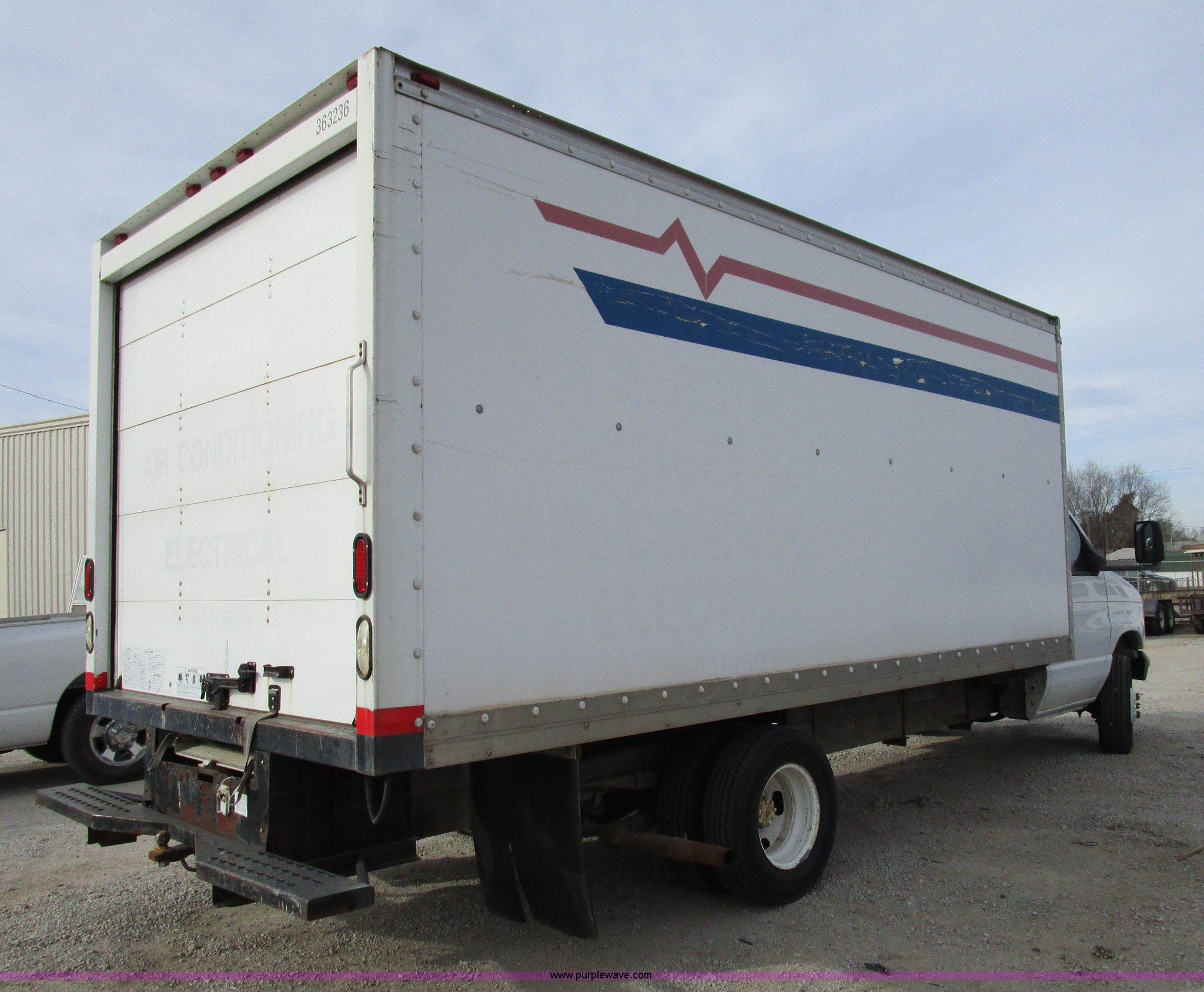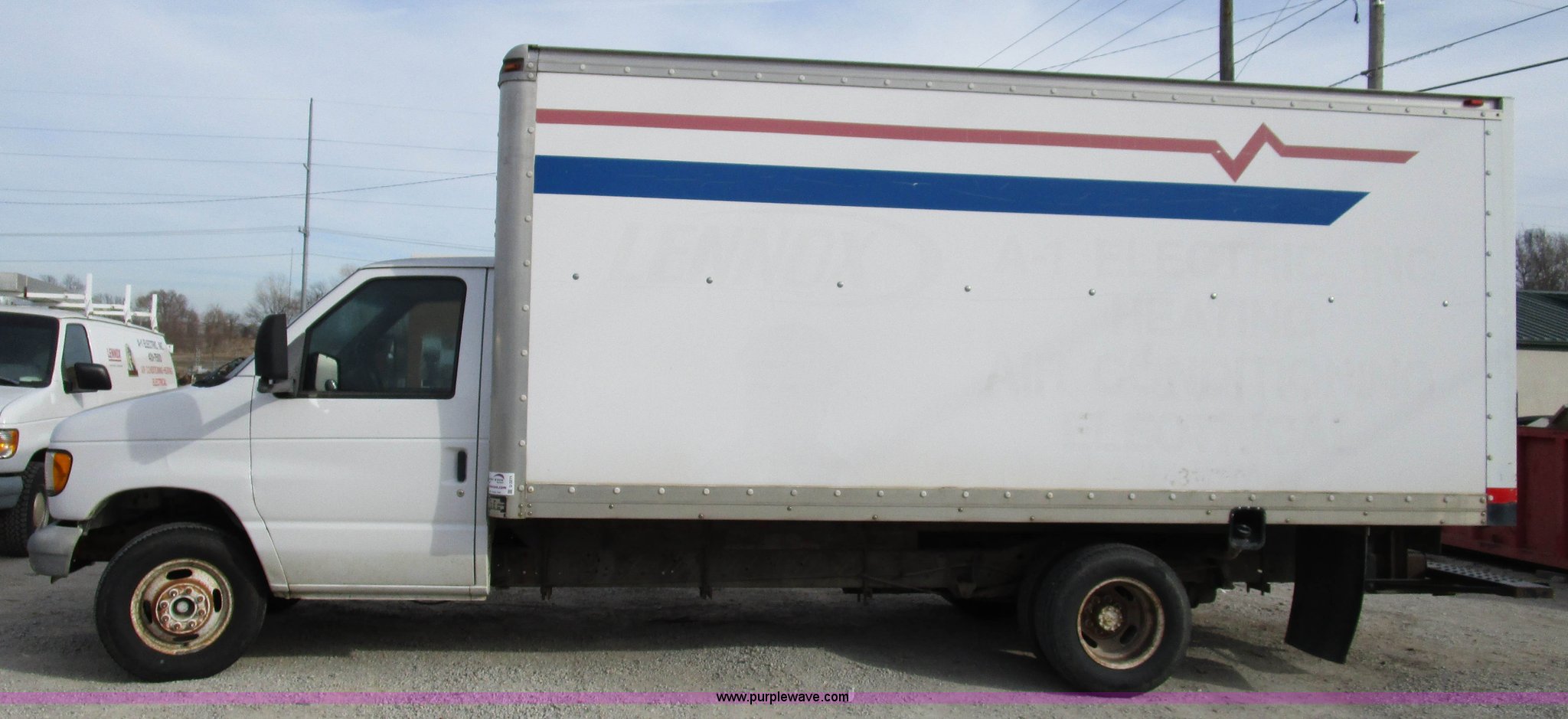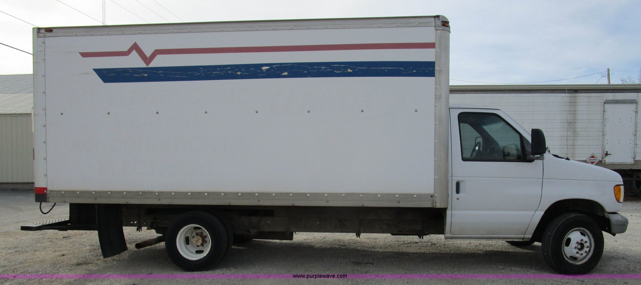 Purple Wave is selling a used Box Truck in Kansas. This item is a 2000 Ford Econoline E350 box van with the following: 160,757 miles on odometer, 5.4L V8 SOHC 16V gas engine, Automatic transmission, AC and heat, AM/FM, Manual windows and locks, Vinyl interior, Grumman Olsen 16'L bed, Aluminum loading ramp, LT225/75R16 tires, GVWR 11,500 lbs, FAWR 4,600 lbs, RAWR 7,800 lbs, Windshield cracked