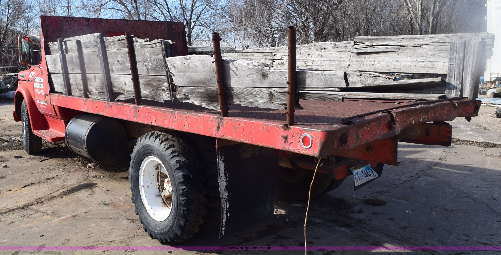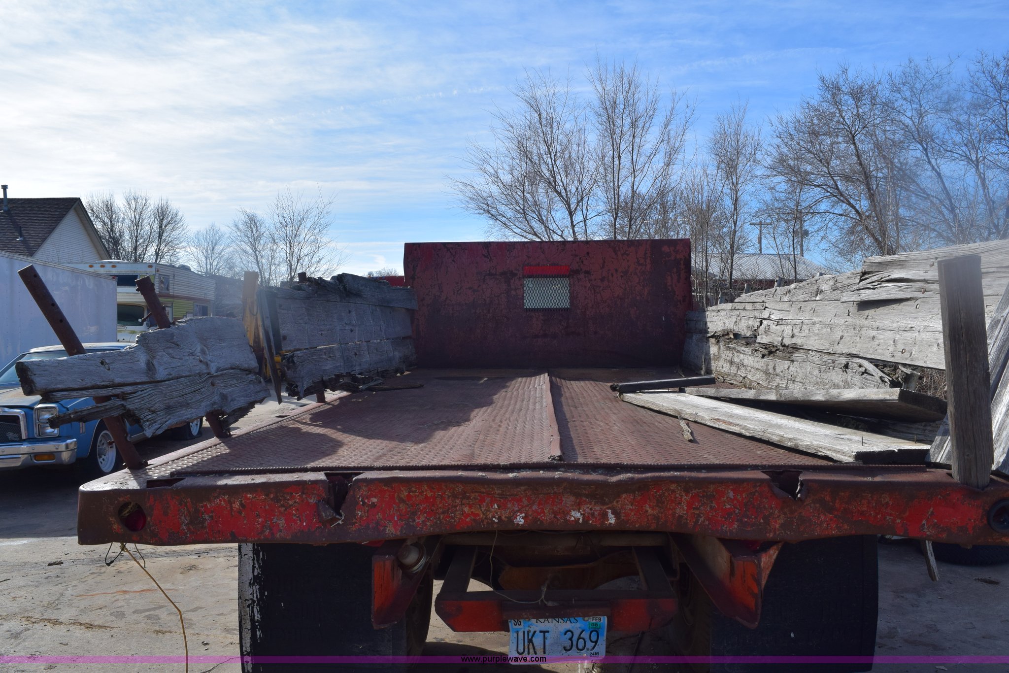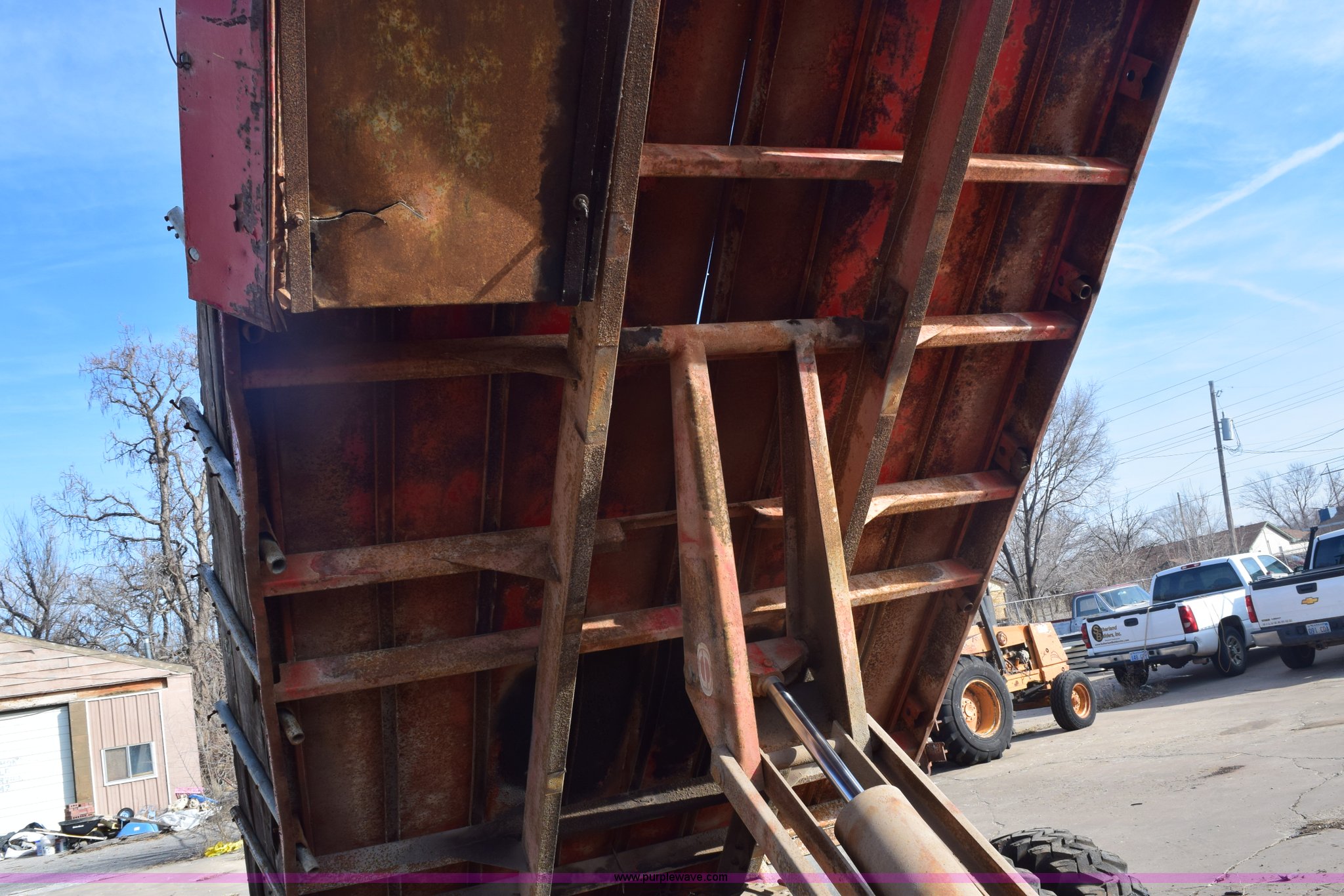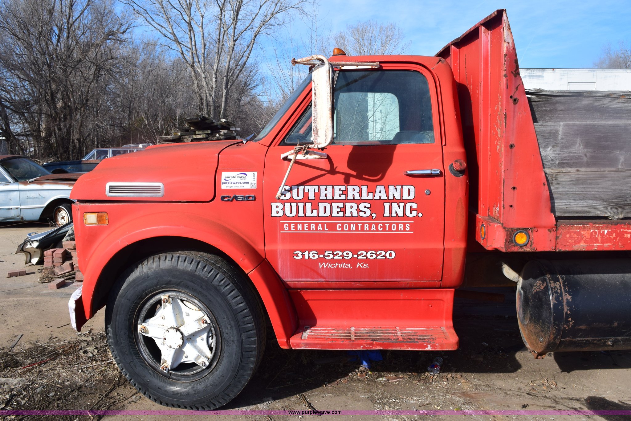 Purple Wave is selling a used Flat Bed Truck in Kansas. This item is a 1972 Chevrolet C60 flatbed dump truck with the following: 51,870 miles on odometer, V8 gas engine, Five speed manual transmission, Two speed rear end, Heat, AM, Manual windows and locks, Vinyl interior, PTO, 16'L x 8'W flatbed, Headache rack, Stake side pockets, Single ram hoist, Under mount toolbox, Door damaged, Side boards damaged, Spring suspension, 9.00-20 tires, GVWR 31,500 lbs, FAWR 10,860 lbs, RAWR 20,760 lbs, Interior/exterior cosmetic damage, Right rear brake locked up, Non-operational fuel pump