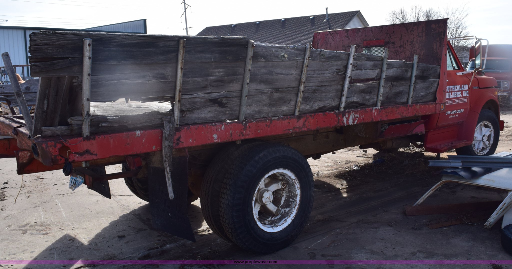 1972 Chevrolet C60 flatbed dump truck. 51,870 miles on odometer, V8 gas engine, Five speed manual transmission, Two speed rear end, Heat, AM, Manual windows and locks, Vinyl interior, PTO, 16'L x 8'W flatbed Headache rack, Stake side pockets, Single ram hoist, Under mount toolbox Door damaged, Side boards damaged, Spring suspension, 9.00-20 tires, GVWR 31,500 lbs, FAWR 10,860 lbs, RAWR 20,760 lbs, Interior/exterior cosmetic damage, Right rear brake locked up, Non-operational fuel pump. CCE632V144375. View equipment video. Sutherland Builders. 6053 S. Seneca. Wichita, KS 67217
