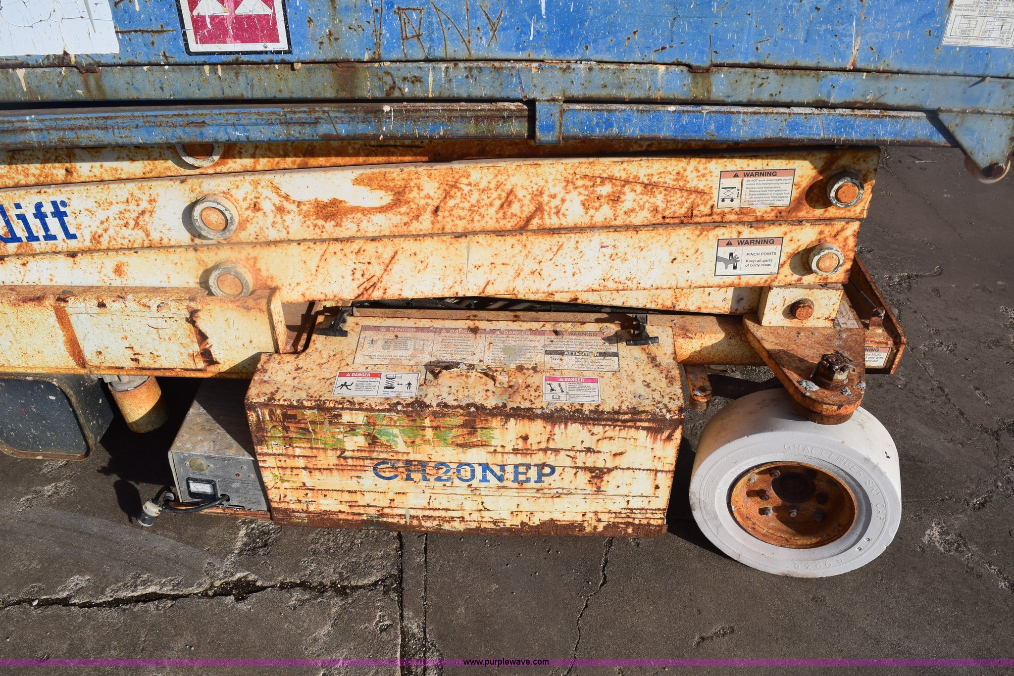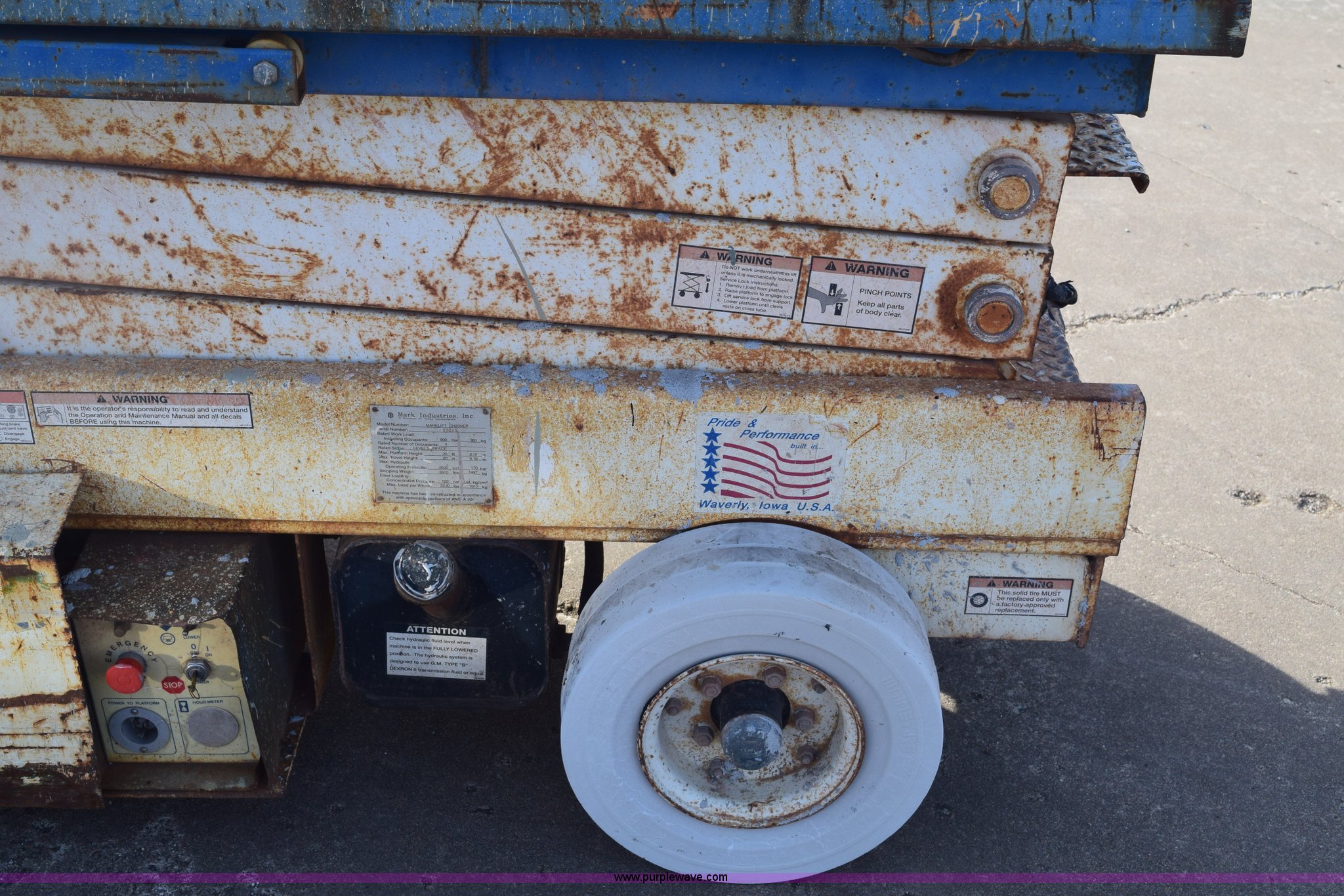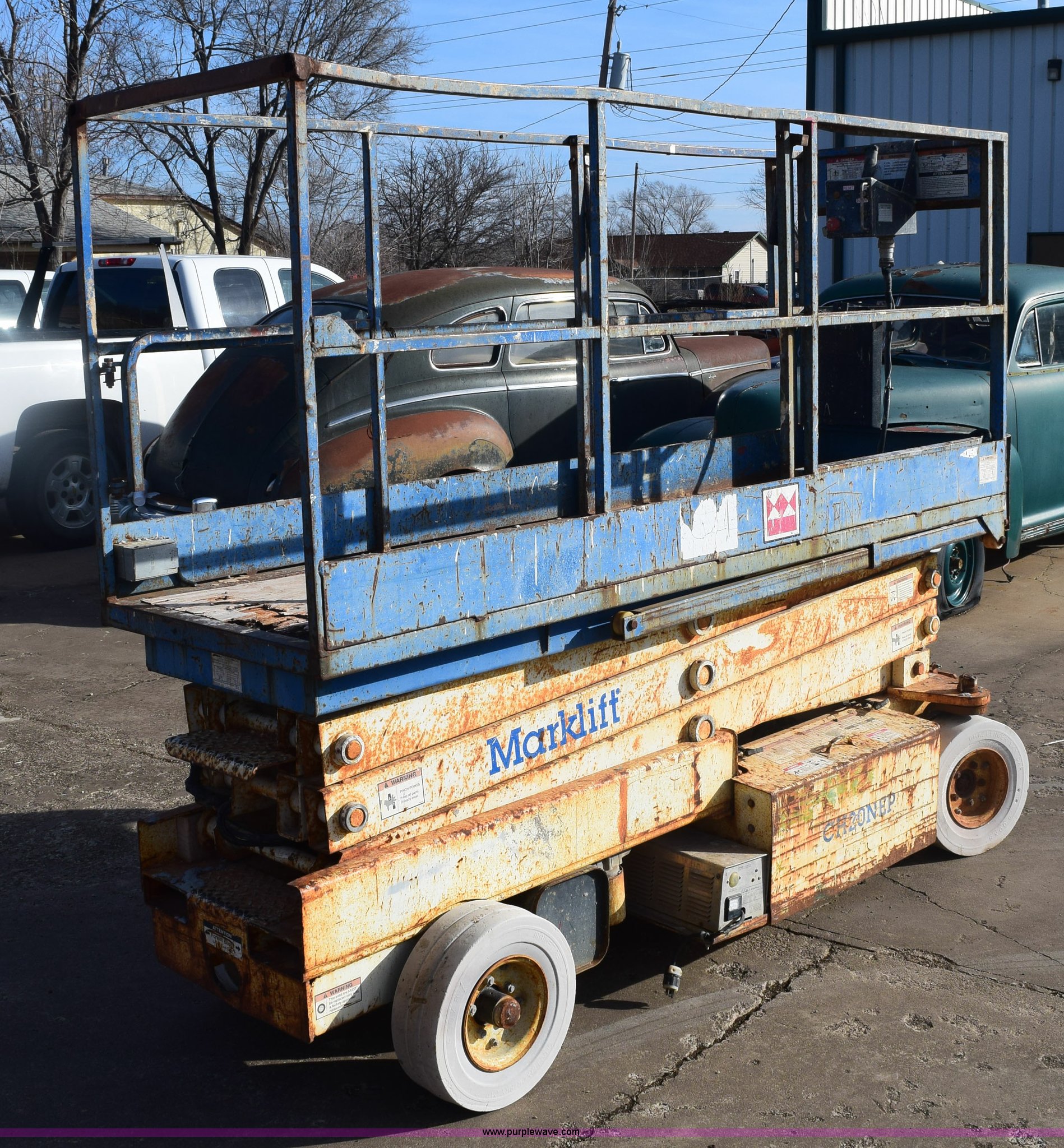Purple Wave is selling a used Scissor or Vertical Lift in Kansas. This item is a Mark Lift CH20NEP electric scissor lift with the following: 20' maximum lift height, 800 lbs maximum lift capacity, 8'L x 30"W platform, Slide-out platform extensions, Tethered joystick controls, On-board charger, 4.00 x 8 non-marking tires, Plywood platform damaged, Serial 27003