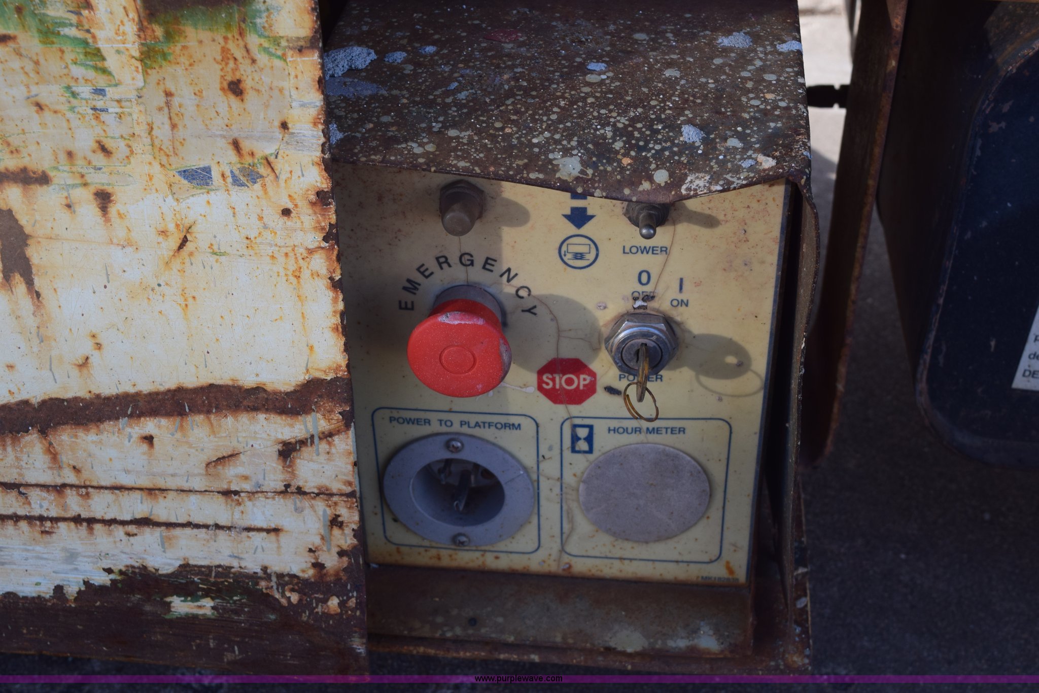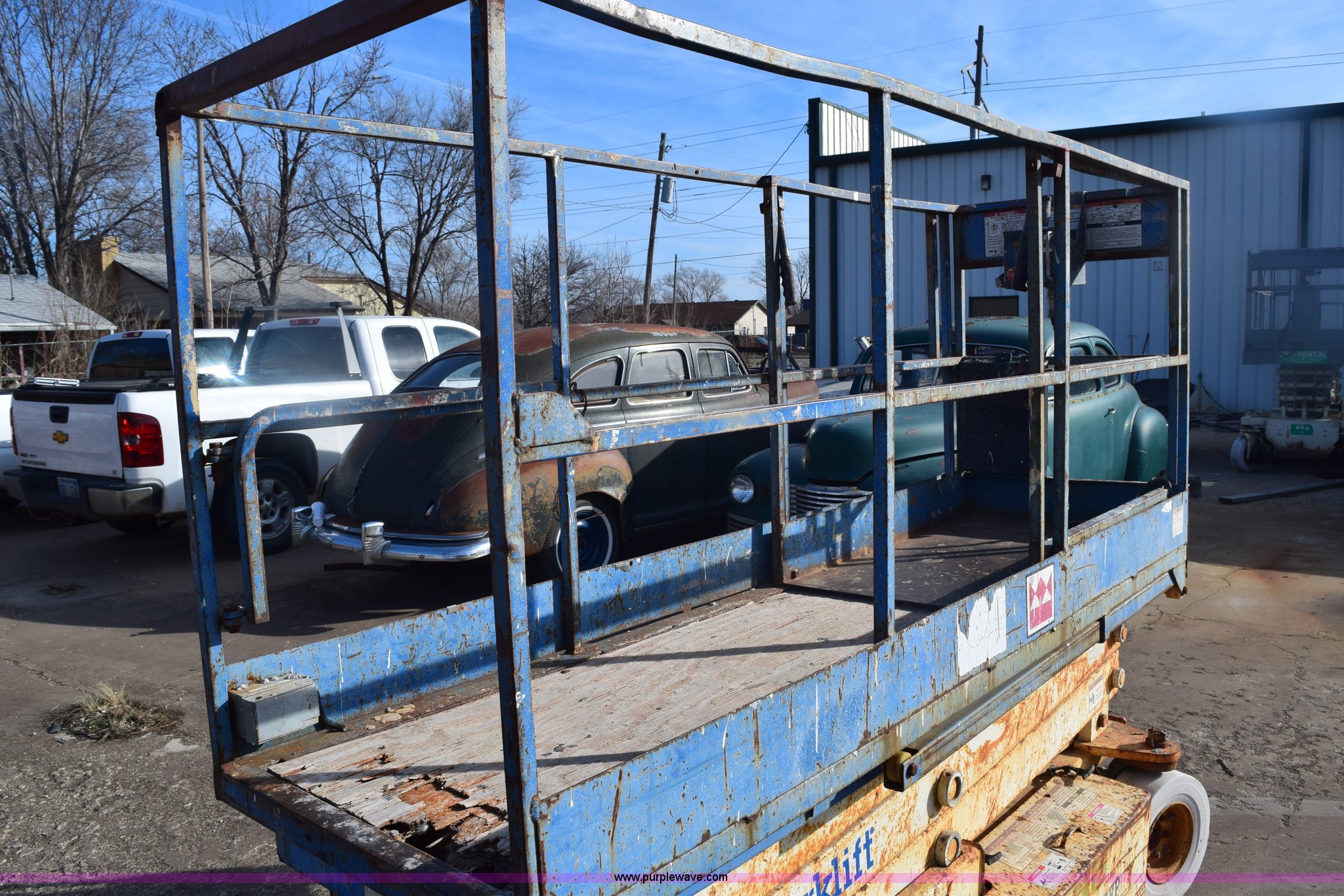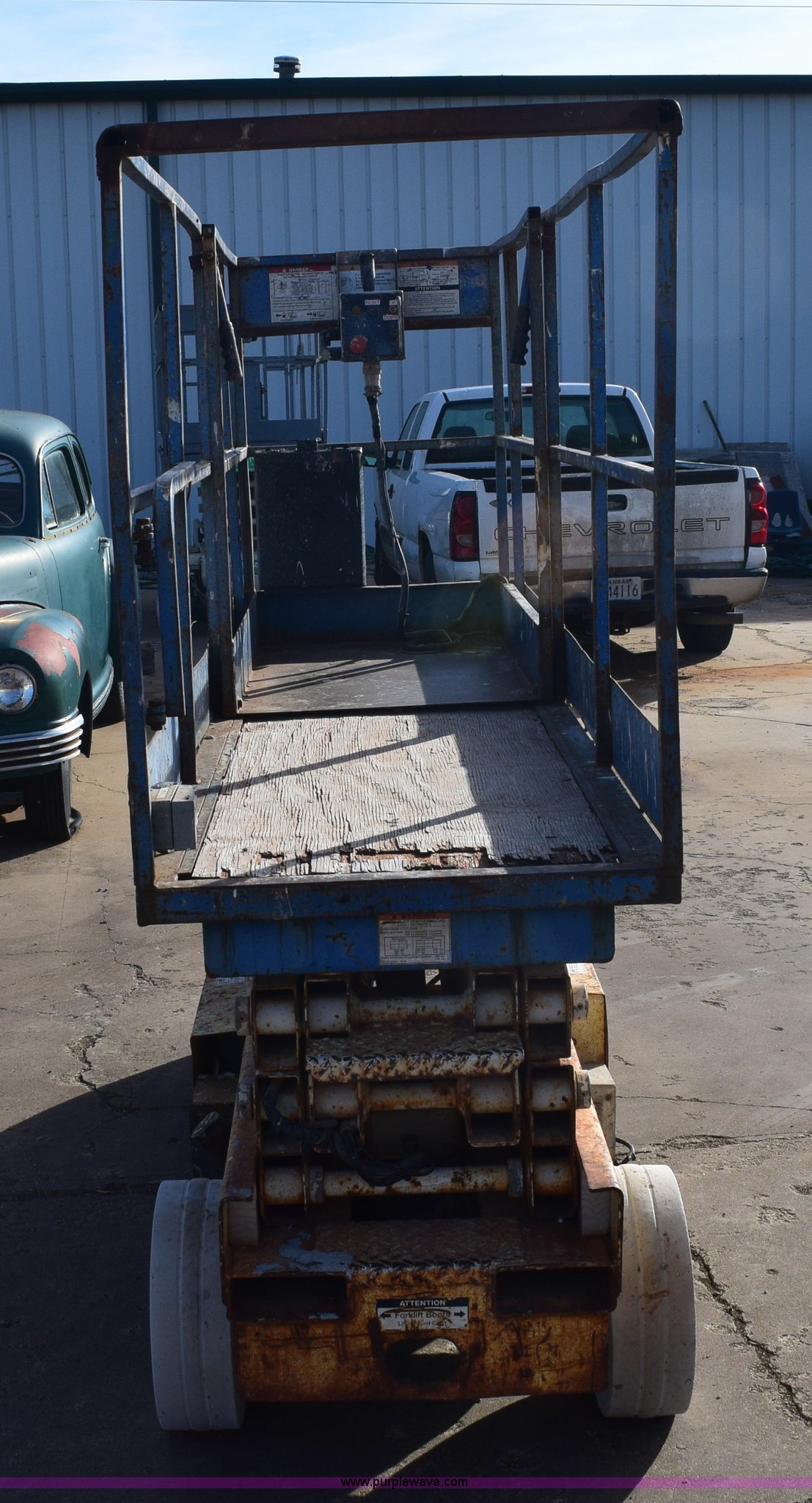 Purple Wave is selling a used Scissor or Vertical Lift in Kansas. This item is a Mark Lift CH20NEP electric scissor lift with the following: 20' maximum lift height, 800 lbs maximum lift capacity, 8'L x 30"W platform, Slide-out platform extensions, Tethered joystick controls, On-board charger, 4.00 x 8 non-marking tires, Plywood platform damaged, Serial 27003