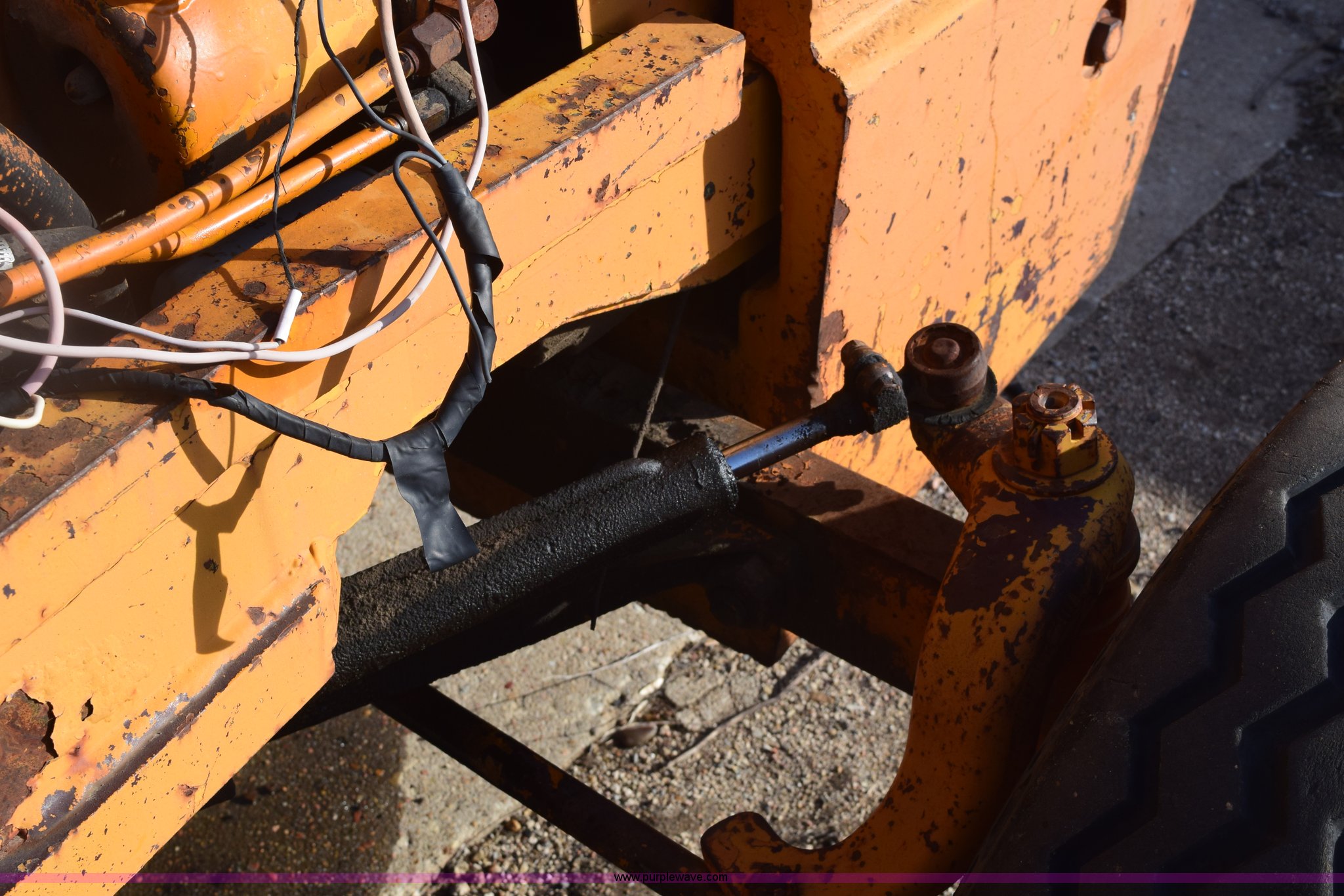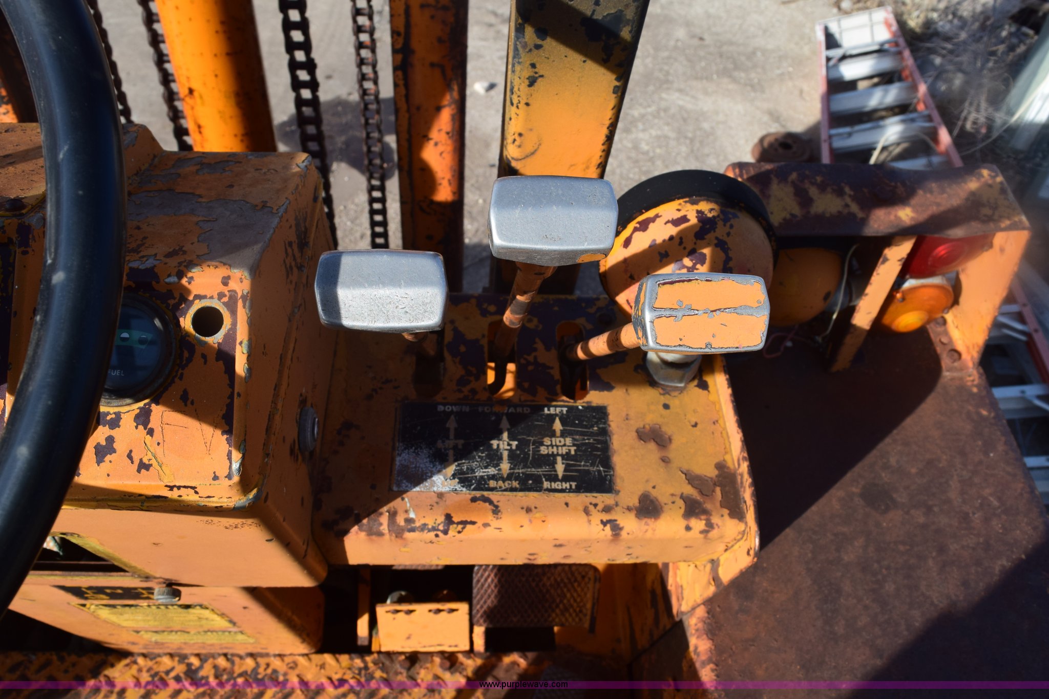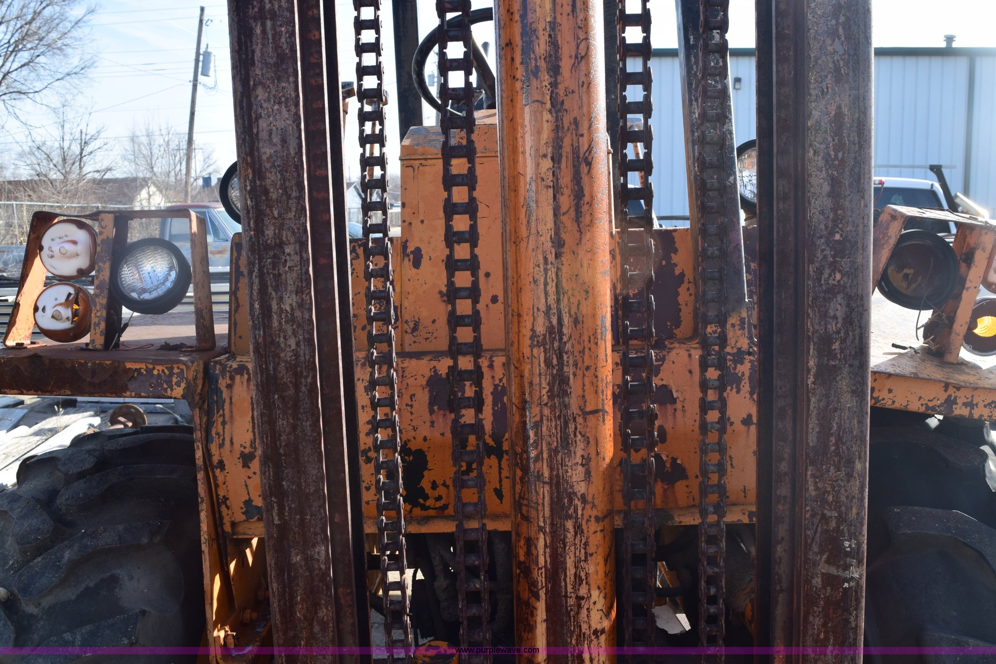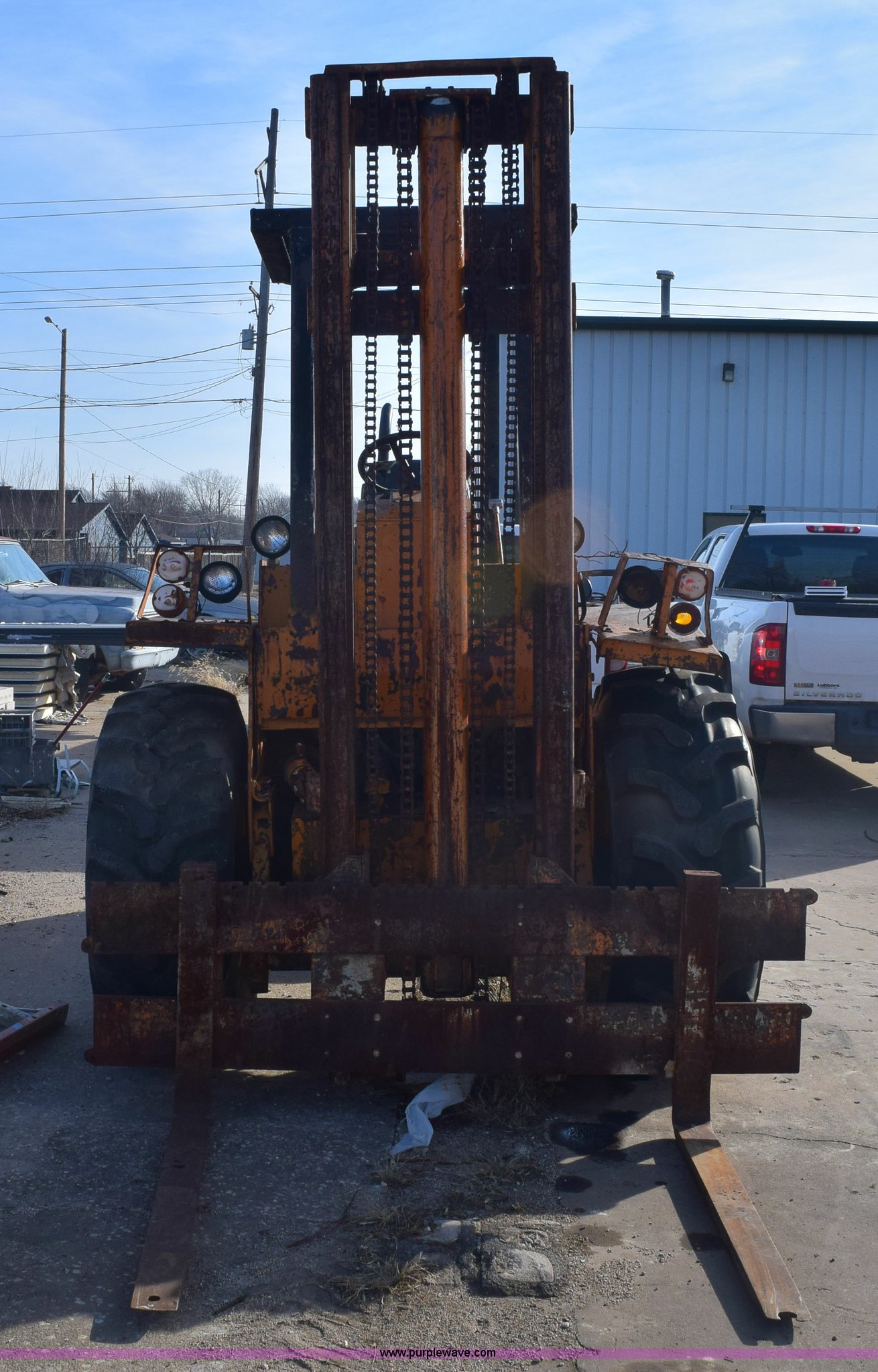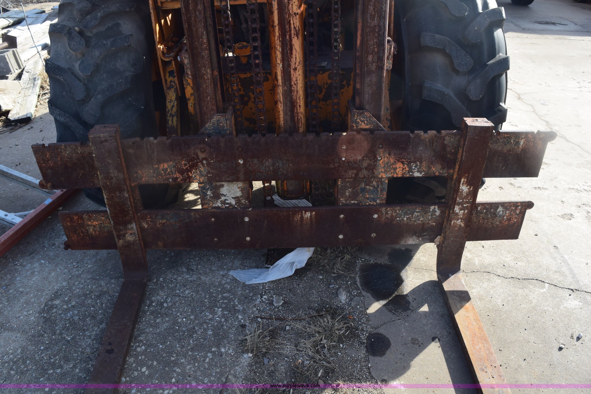 Purple Wave is selling a used Strt. Mast Rough Terr. Forklift in Kansas. This item is a Case 584 rough terrain forklift with the following: 4,419 hours on meter, Four cylinder diesel engine, Shuttle shift transmission, 4F-4R gears, OROPS, Three lever control, Approximately 21' maximum lift height, Side shift, 48"L x 4"W forks, 78"W carriage, Rear bolt-on counter weights, 16.9-24 front tires, 11L-16SL rear tires, Hydraulic leaks, Fuel leak, Body damage, Serial 5311479