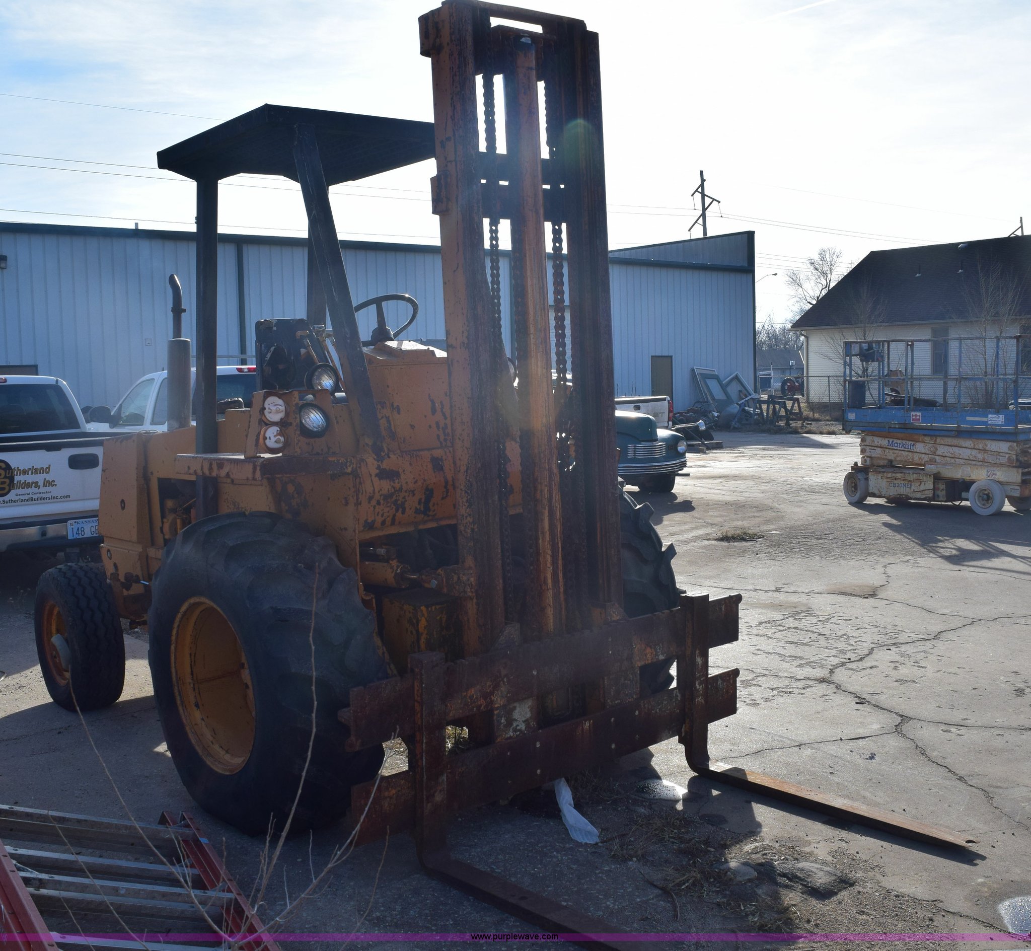 Case 584 rough terrain forklift. 4,419 hours on meter, Four cylinder diesel engine, Shuttle shift transmission 4F-4R gears, OROPS, Three lever control, Approximately 21' maximum lift height, Side shift, 48"L x 4"W forks, 78"W carriage, Rear bolt-on counter weights, 16.9-24 front tires, 11L-16SL rear tires, Hydraulic leaks, Fuel leak, Body damage, Serial 5311479. View equipment video. Sutherland Builders. 6053 S. Seneca. Wichita, KS 67217