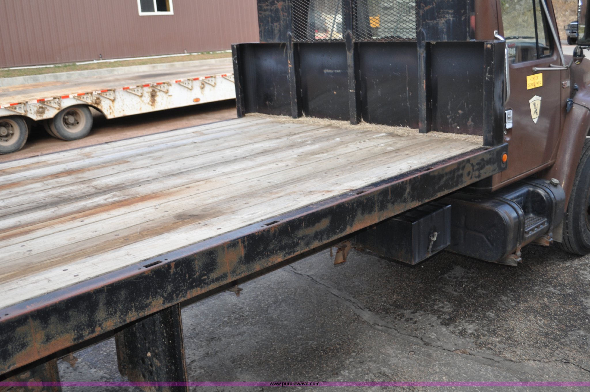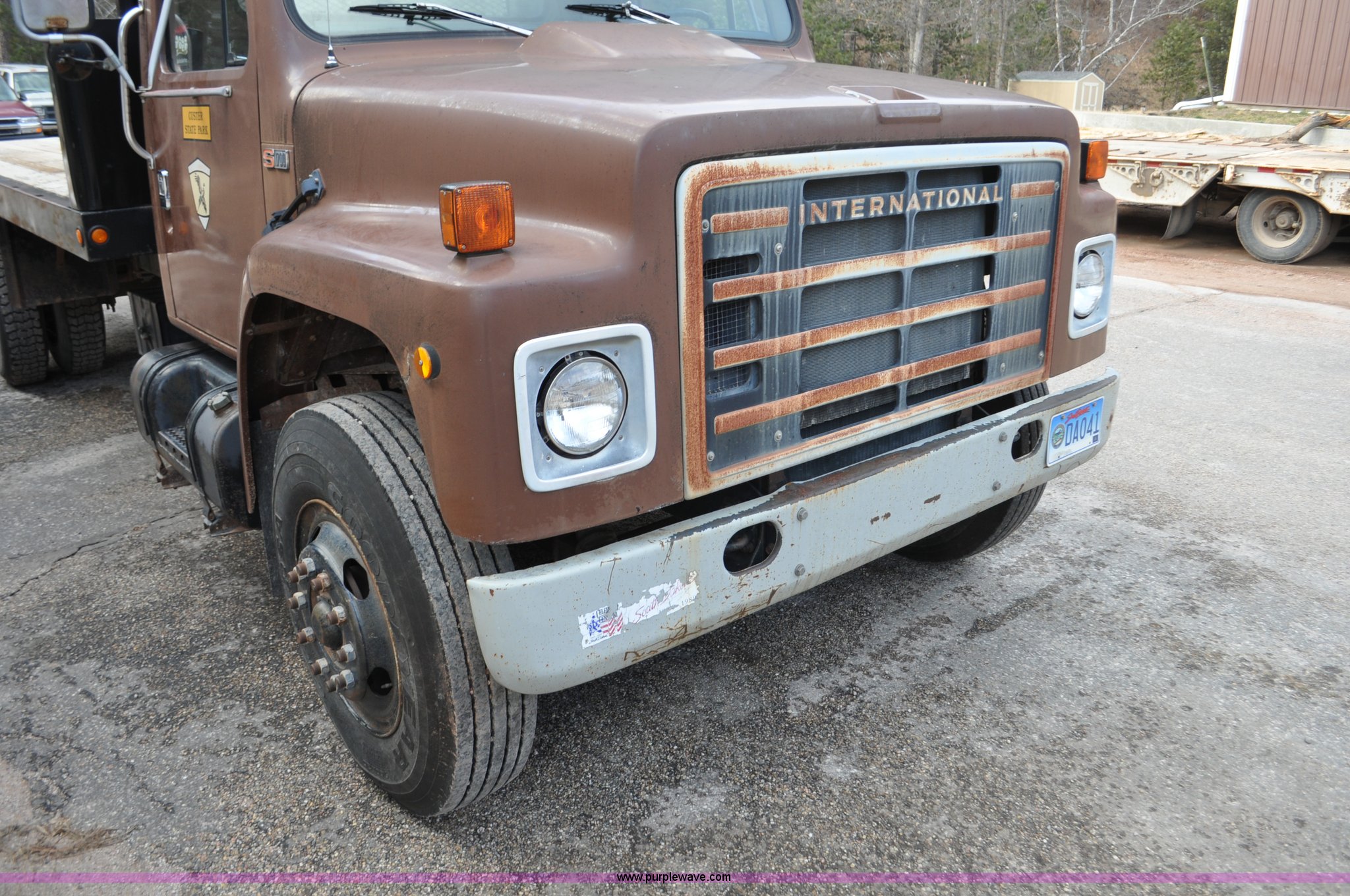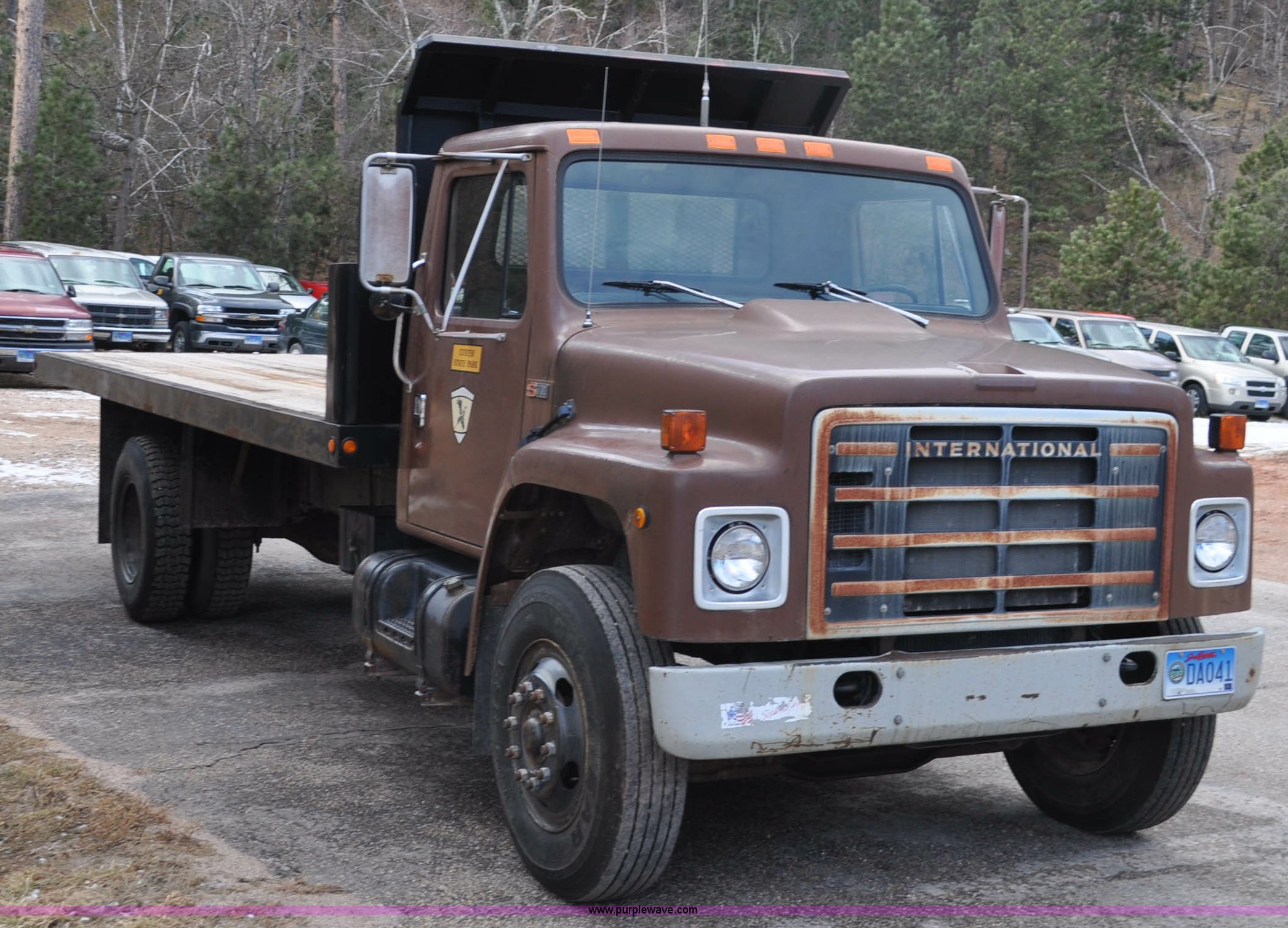 1984 International S1700 flatbed truck. 53,599 miles on odometer, 392 C.I.D. eight cylinder gas engine, Five speed manual transmission, Two speed rear end, AC and heat, Manual windows and locks, Vinyl interior, 20' flatbed Headache rack, Wood floor, Stake pockets, Fold away access steps, 9.00-20 tires, Asset# 0247278, Unit# DA041. 1HTLBEGP8EHA58024. South Dakota Property Management. 13329 US Hwy 16A. Custer, SD 57730
