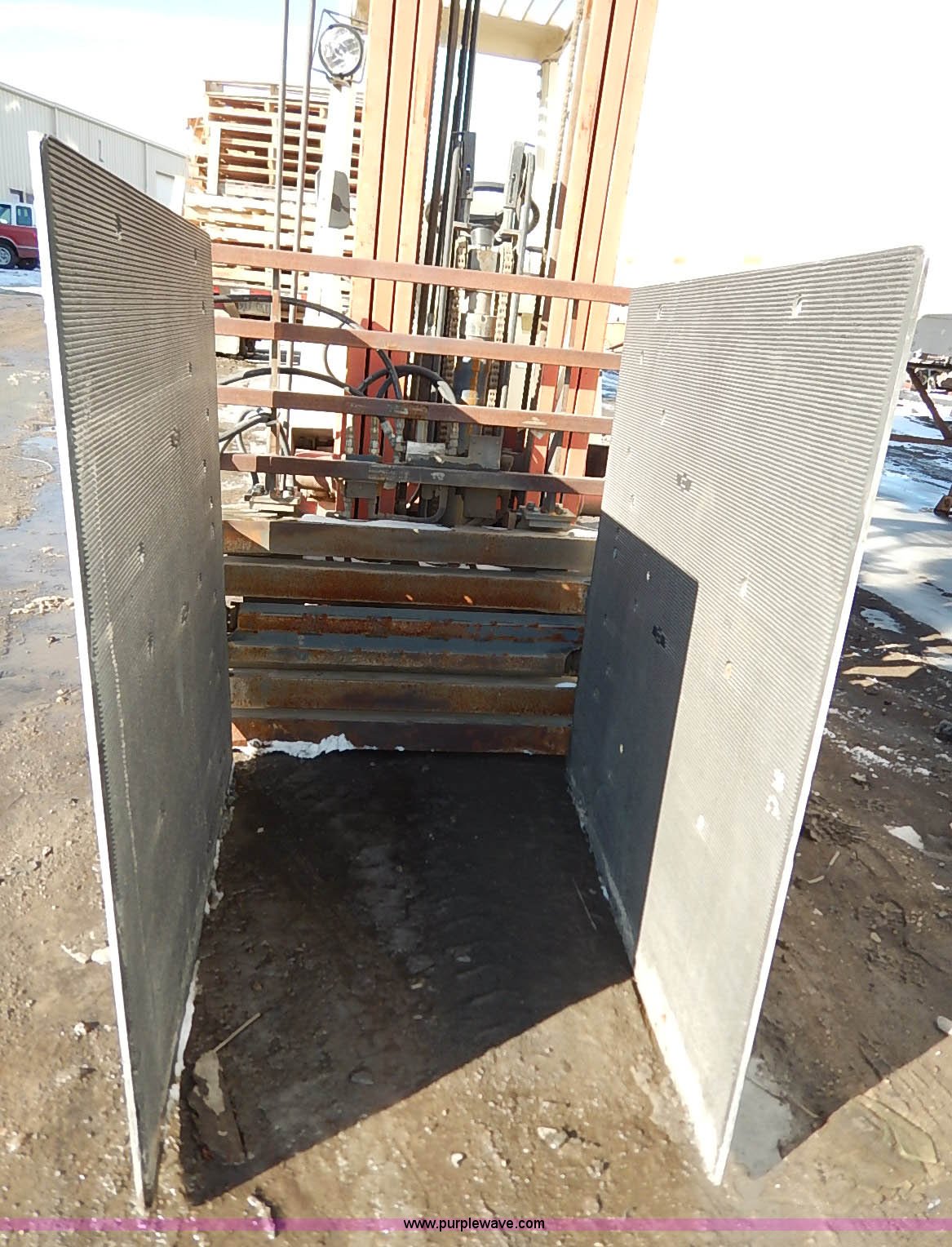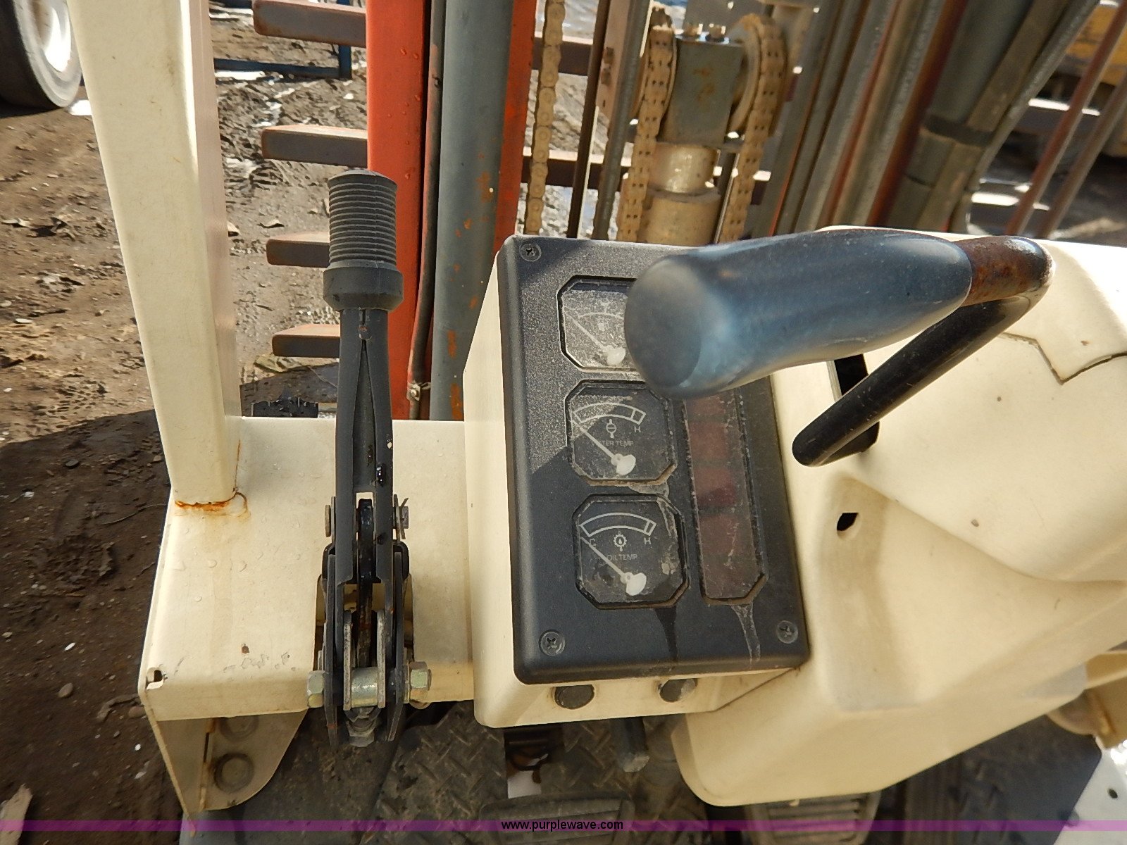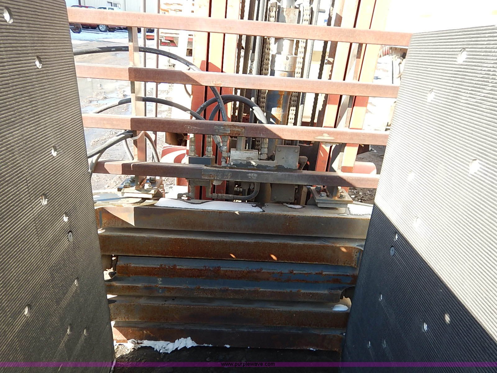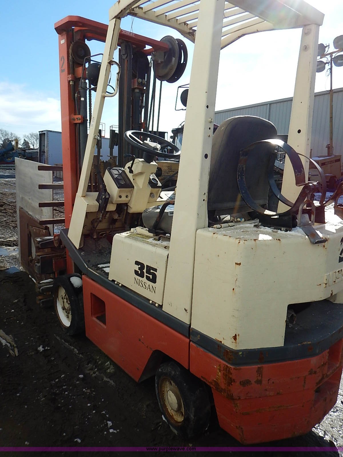 Purple Wave is selling a used Strt. Mast Rough Terr. Forklift in Kansas. This item is a Nissan 35 forklift with the following: 7,754 hours on meter, Model CPH01A18V, Type XXLP, Propane engine, Hydrostatic transmission, 3,200 lbs maximum lift capacity, 187" maximum lift height, Bale clamp, Work lights, 18 x 8 x 12 1/8 front tires, 14 x 4 1/2 x 8 rear tires, 6,685 lbs. base operating weight