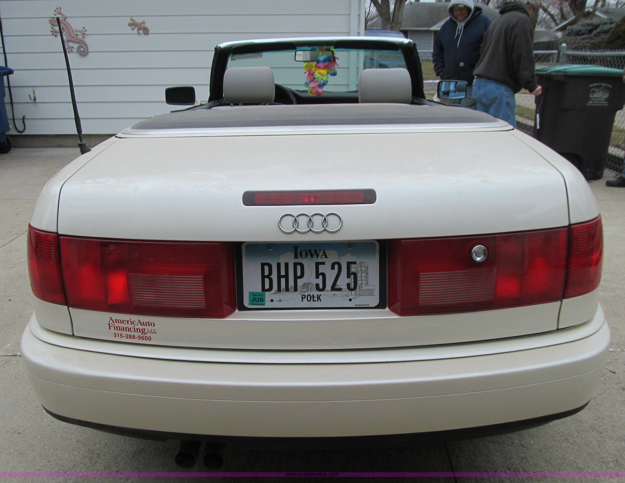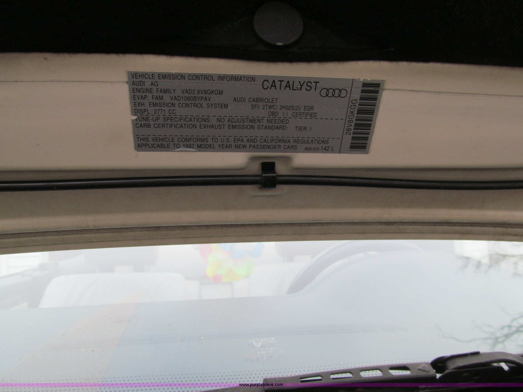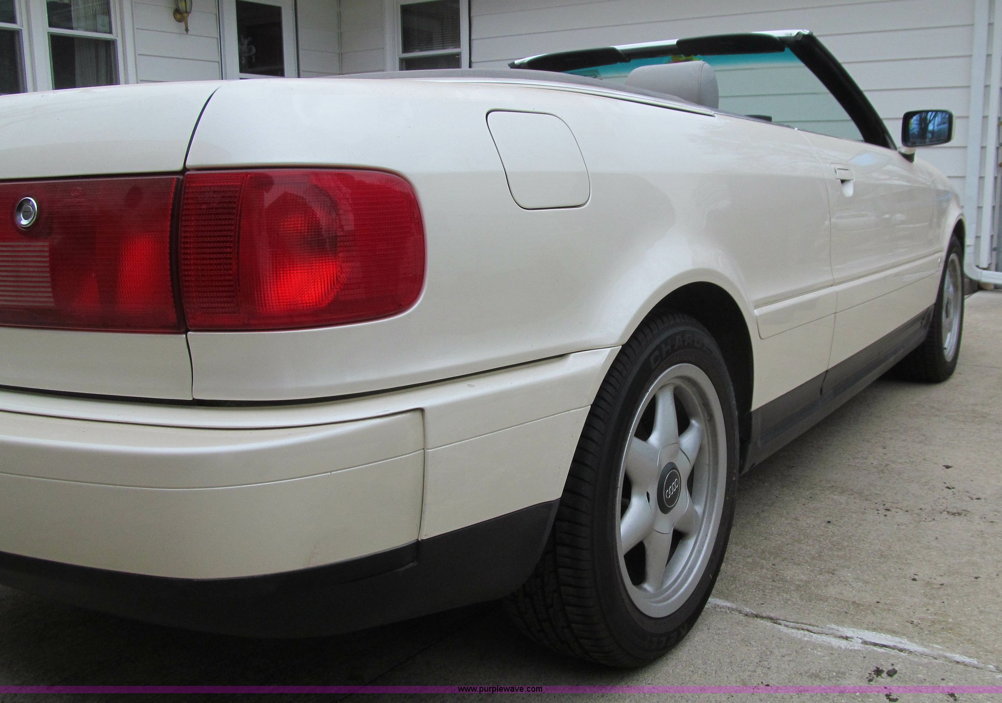 Purple Wave is selling a used Passenger Vehicle in Iowa. This item is a 1997 Audi Cabriolet CV convertible with the following: 100,471 miles on odometer, 2.8L V6 DOHC 30V gas engine, Automatic transmission, AC and heat, Tilt, Cruise, AM/FM/cassette, Six disc CD player installed in trunk, Power windows, locks, and mirrors, Leather interior, 205/55R16 tires