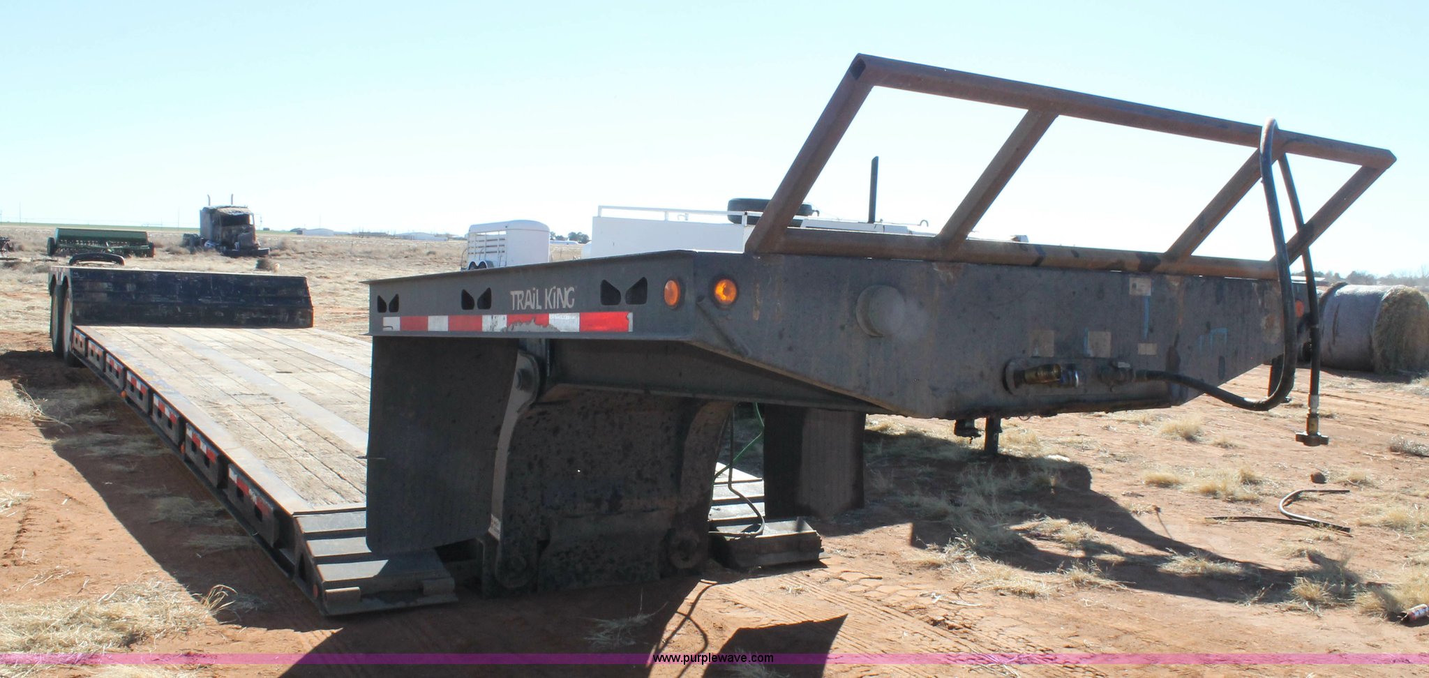 Purple Wave is selling a used Equip. Trailer in Texas. This item is a 2002 Trail King TK60HG-482 lowboy trailer with the following: 45'L x 102"W, 7.5'L neck deck, 29'L main deck, 7.5'L rear deck, Wood decking, Hydraulic detach, Strap ratchets on neck and rear decks, Seven 30" pull out extension per side, Ramps, 255/70R22.5 tires, GVWR 78,560 lbs, GAWR 20,280 lbs, 60,000 lbs load rating, Front bracket will be removed prior to auction