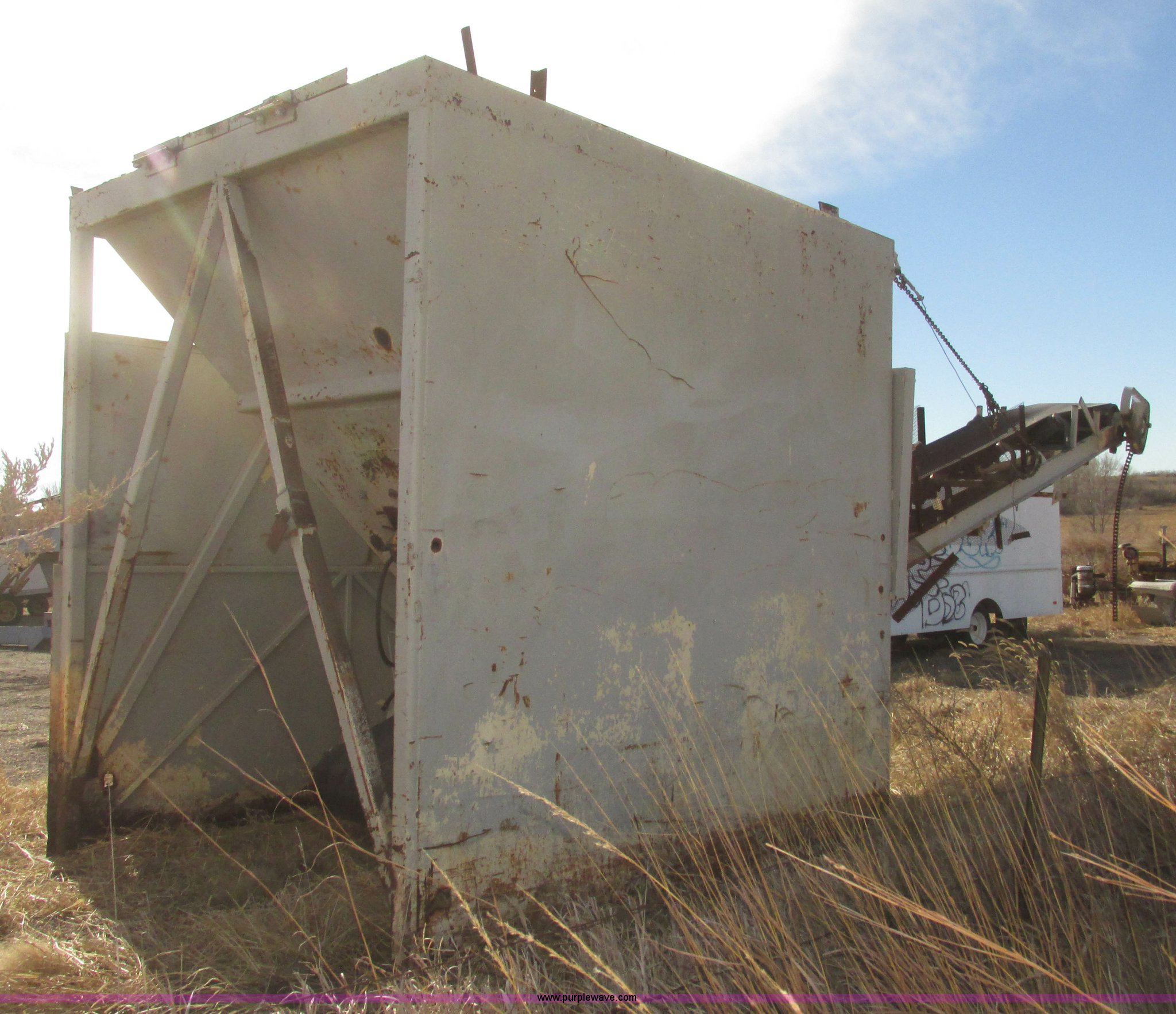 Purple Wave is selling a used Conveyor in Nebraska. This item is a Single aggregate bin and conveyor with the following: Approx. 12'L x 10'W x 11.5'H O.D., 29.5"W smooth C-Channel conveyor, 21'L from edge of hopper, 8.5'L under hopper, Approx. 30' total hopper length, 6'L x 2'W hopper bottom opening, Turnbuckle gate, Drive chain disconnected, Chain and binder supporting conveyor, (12) 4" rollers on conveyor, (2) approx. 14" end rollers, Belt damage