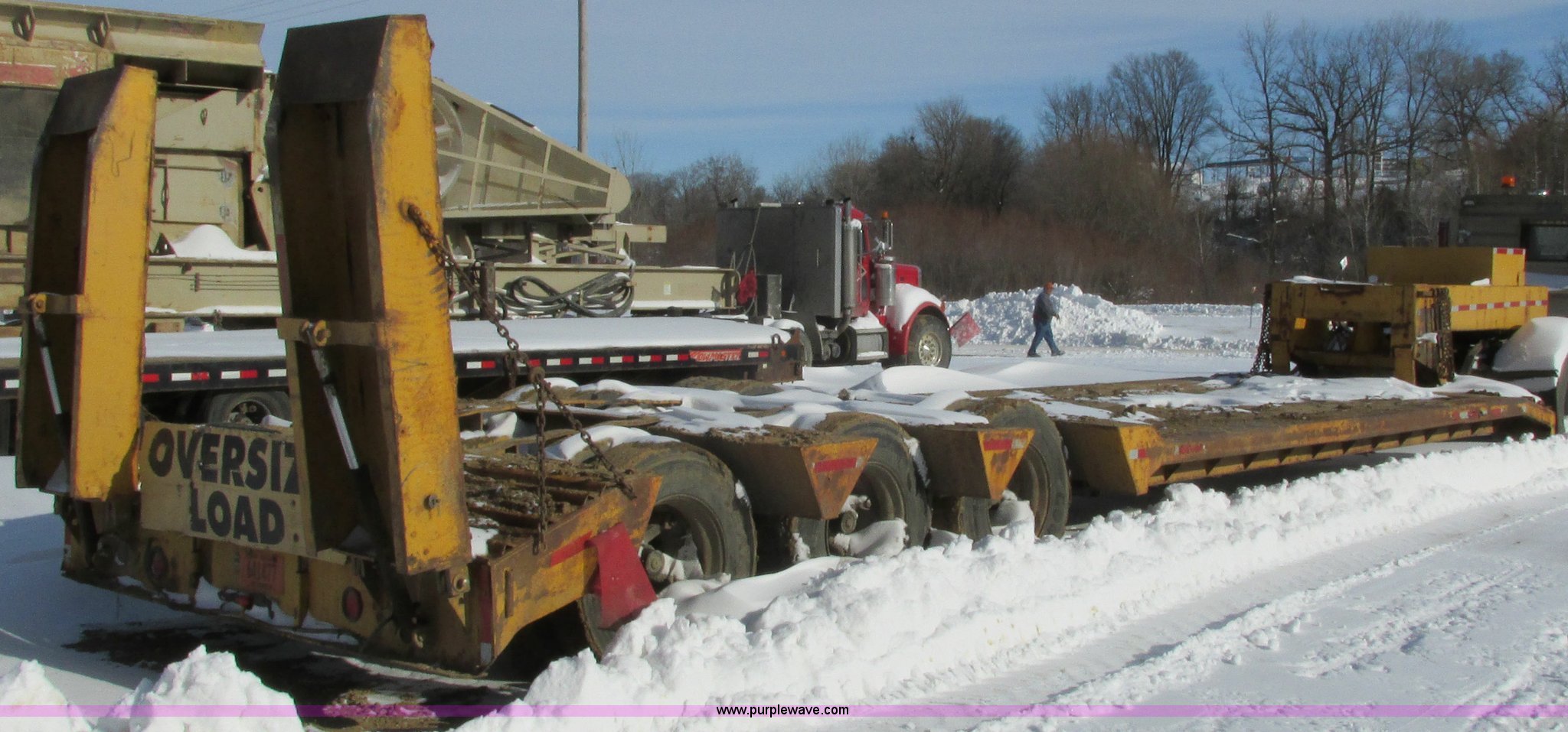 Purple Wave is selling a used Equip. Trailer in Wisconsin. This item is a 1972 shop built low boy trailer with the following: 21' x 10'W well, 50 ton capacity, Honda pony motor, Electric over hydraulic loading ramps, Wood deck, Spring suspension, Air brakes, Detachable neck, 295/75R22.5 tires