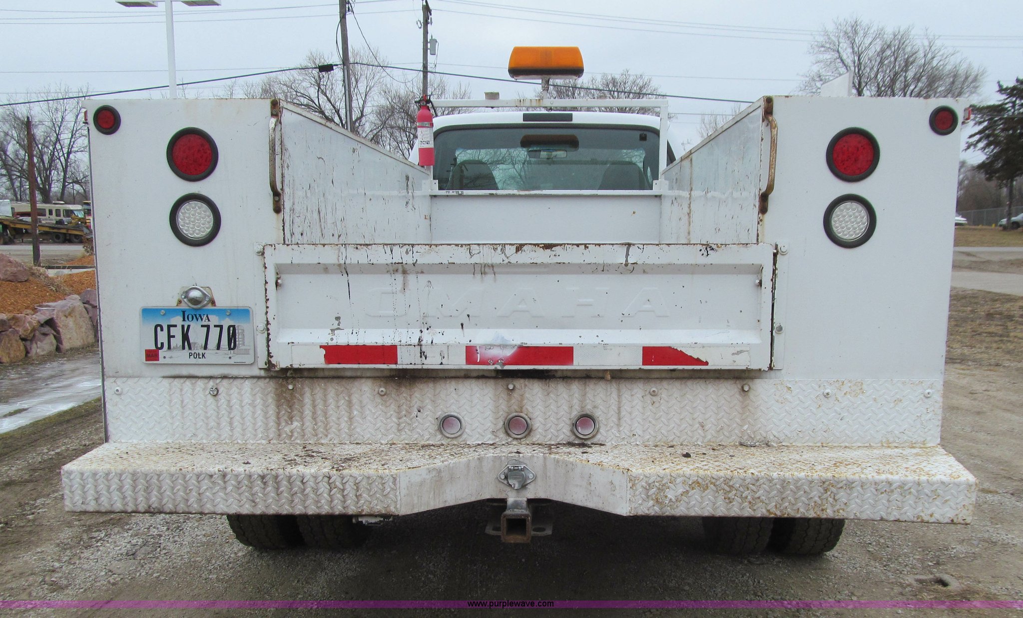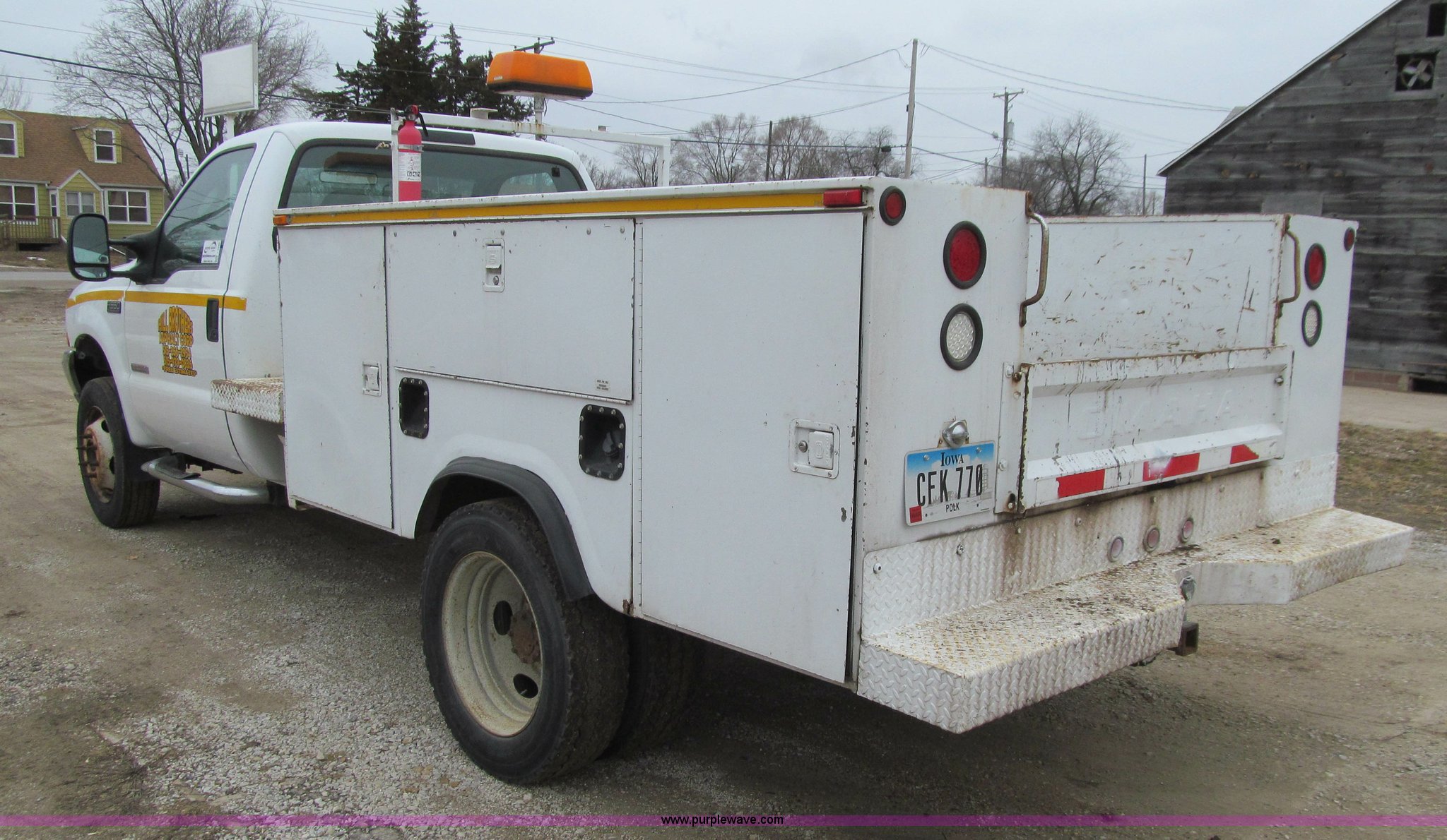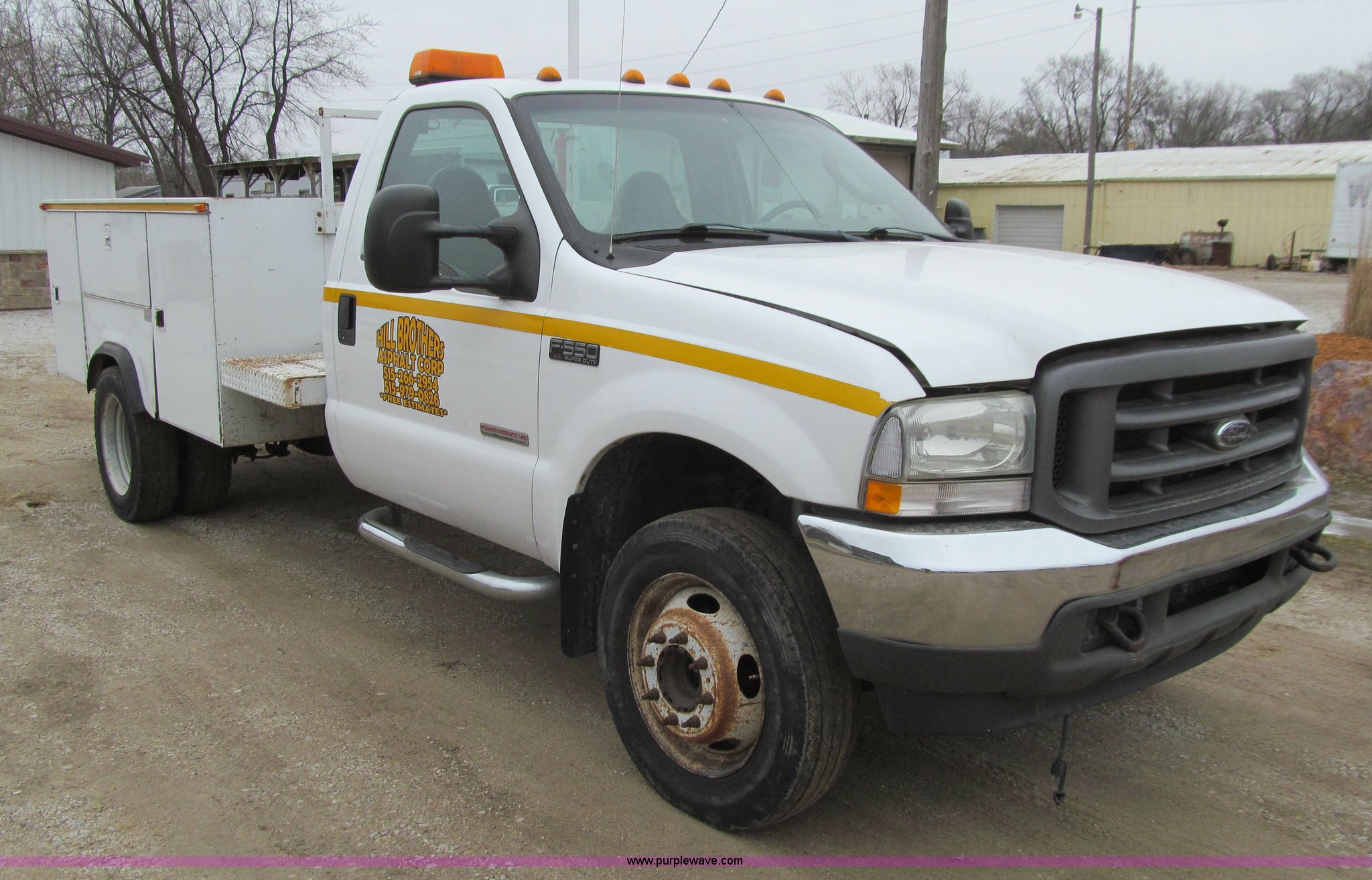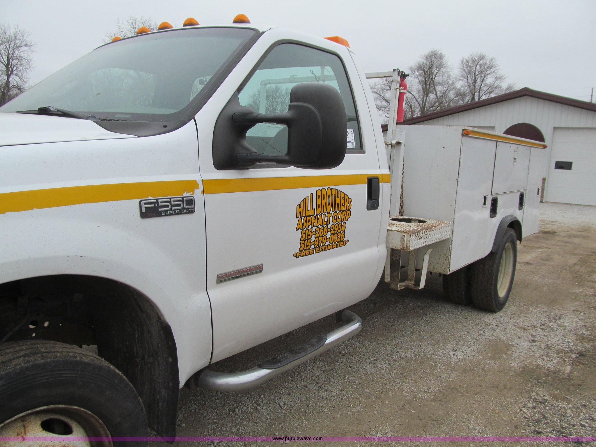Purple Wave is selling a used Service Truck in Iowa. This item is a 2004 Ford F550 Super Duty XL utility truck with the following: 248,437 miles on odometer, 6.0L V8 OHV 32V turbo diesel engine, Automatic transmission, AC and heat, Tilt, Cruise, AM/FM/CD/cassette, Manual windows and locks, Vinyl interior, Omaha 9'L utility bed, Three compartments per side, Tailgate, Amber beacon light, Receiver hitch, Trailer wiring, 225/70R19.5 tires, GVWR 19,000 lbs, Driver's door will only open from the interior, Front bumper damaged