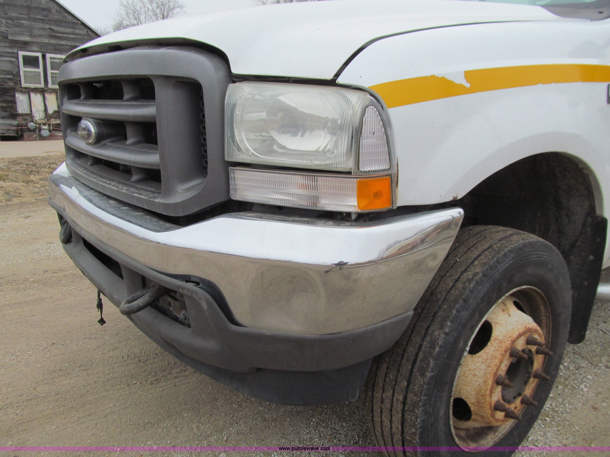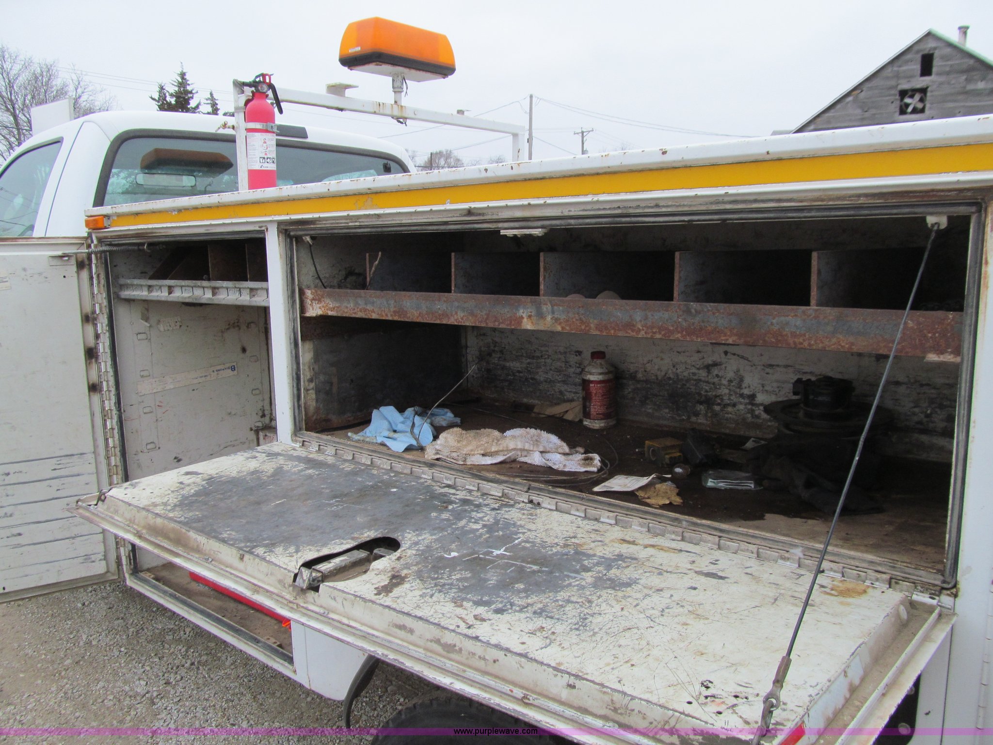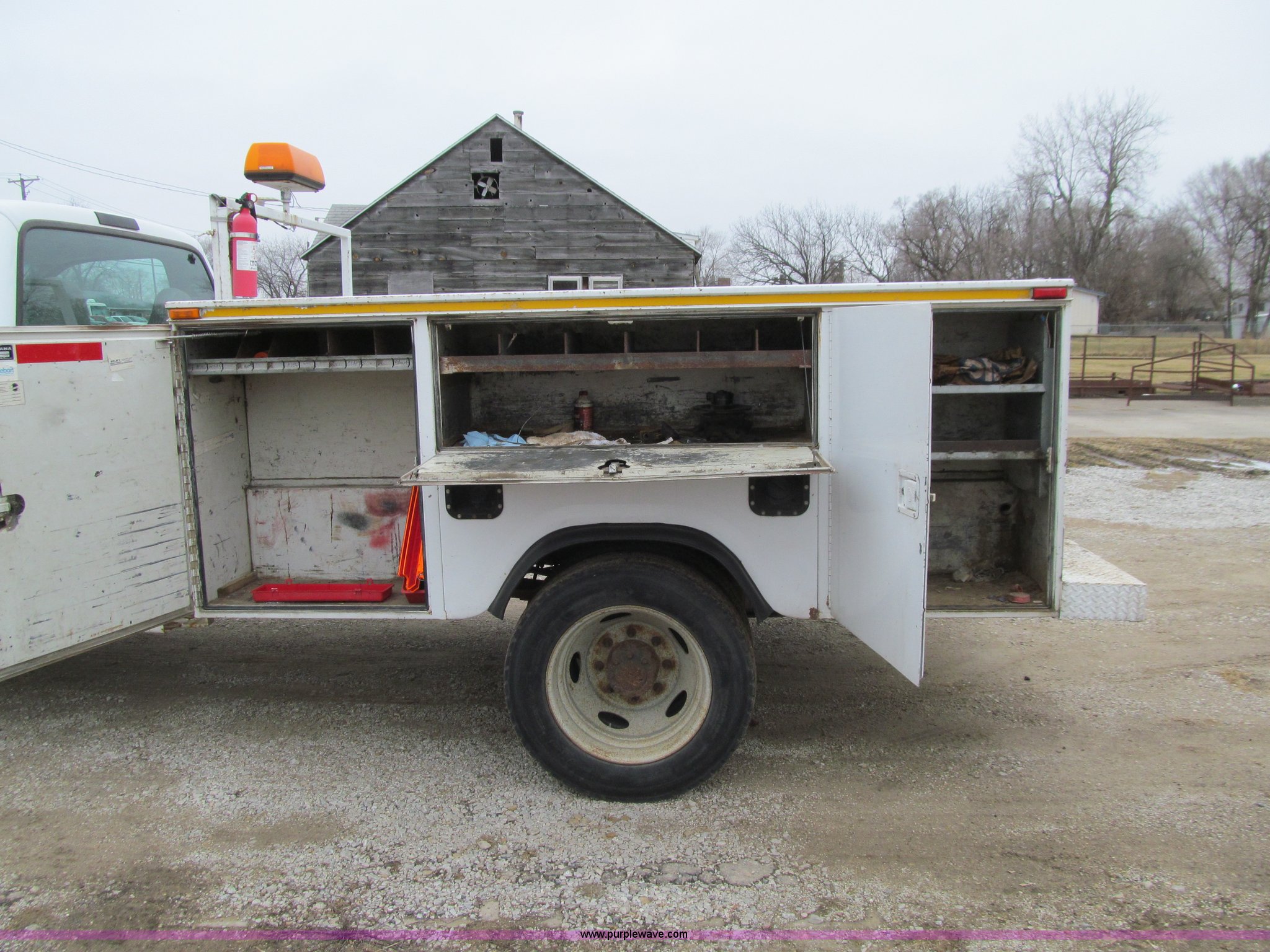 Purple Wave is selling a used Service Truck in Iowa. This item is a 2004 Ford F550 Super Duty XL utility truck with the following: 248,437 miles on odometer, 6.0L V8 OHV 32V turbo diesel engine, Automatic transmission, AC and heat, Tilt, Cruise, AM/FM/CD/cassette, Manual windows and locks, Vinyl interior, Omaha 9'L utility bed, Three compartments per side, Tailgate, Amber beacon light, Receiver hitch, Trailer wiring, 225/70R19.5 tires, GVWR 19,000 lbs, Driver's door will only open from the interior, Front bumper damaged