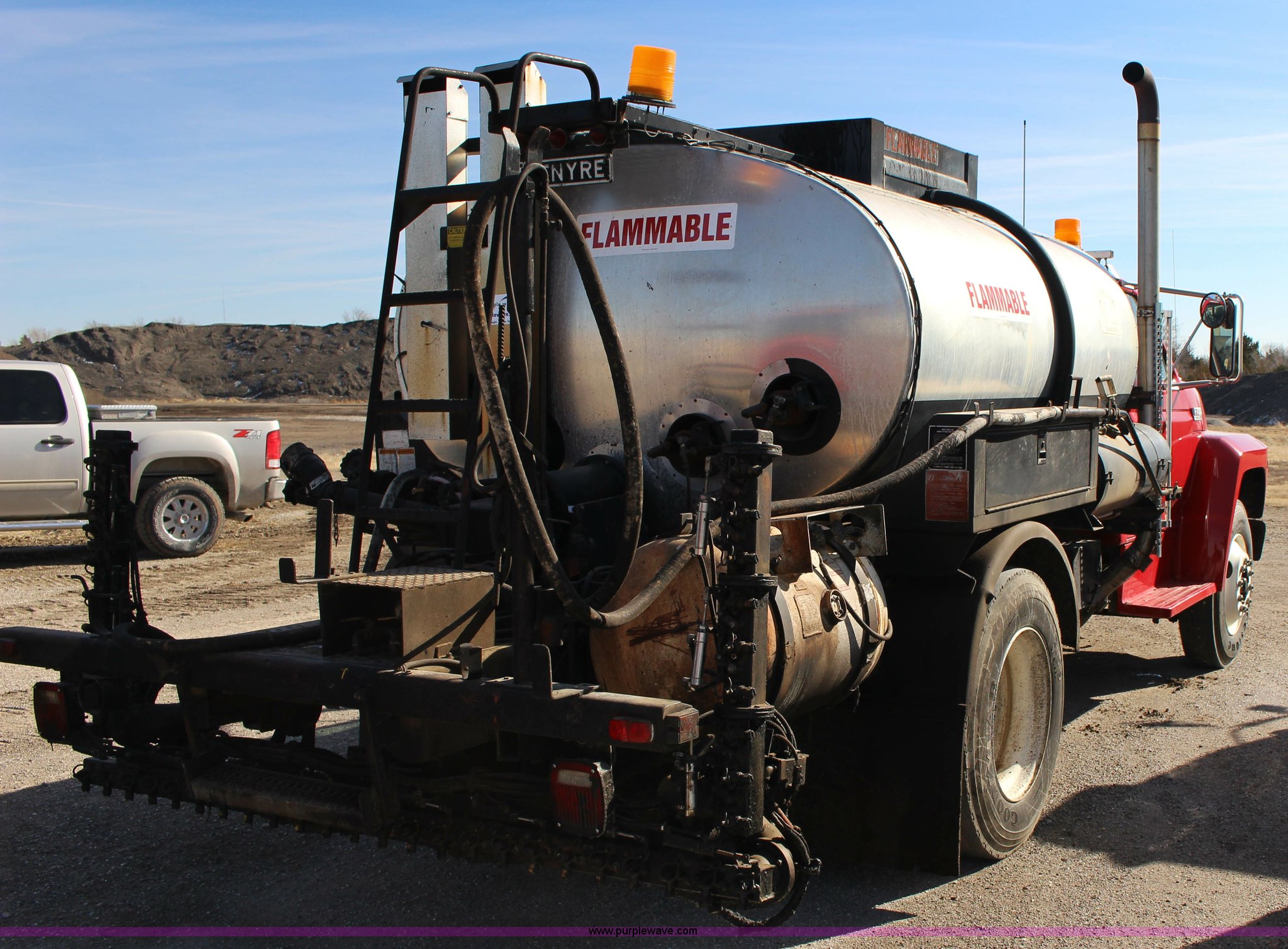 Purple Wave is selling a used Oil Distributor Truck in Kansas. This item is a 1994 Ford F700 oil distribution truck with the following: 184,638 miles on odometer, Ford 5.9L L6 diesel engine, Automatic transmission, AM/FM, Manual windows and locks, PTO, Etnyre 1,000 gallon oil distributor, Rear spray bar, (2) hydraulic folding wings, Cab mounted controls, Spring suspension, Air brakes, 10R22.5 tires