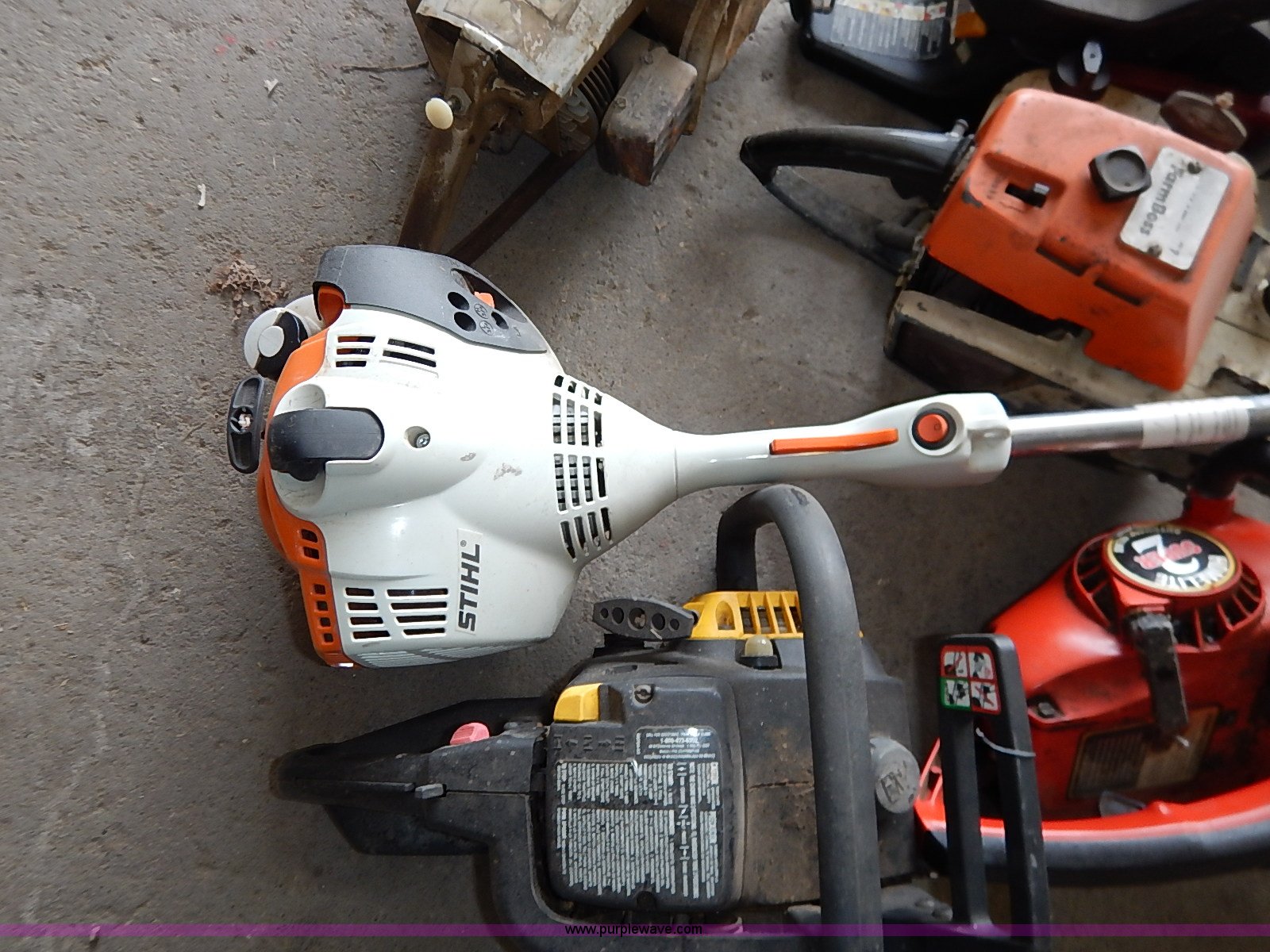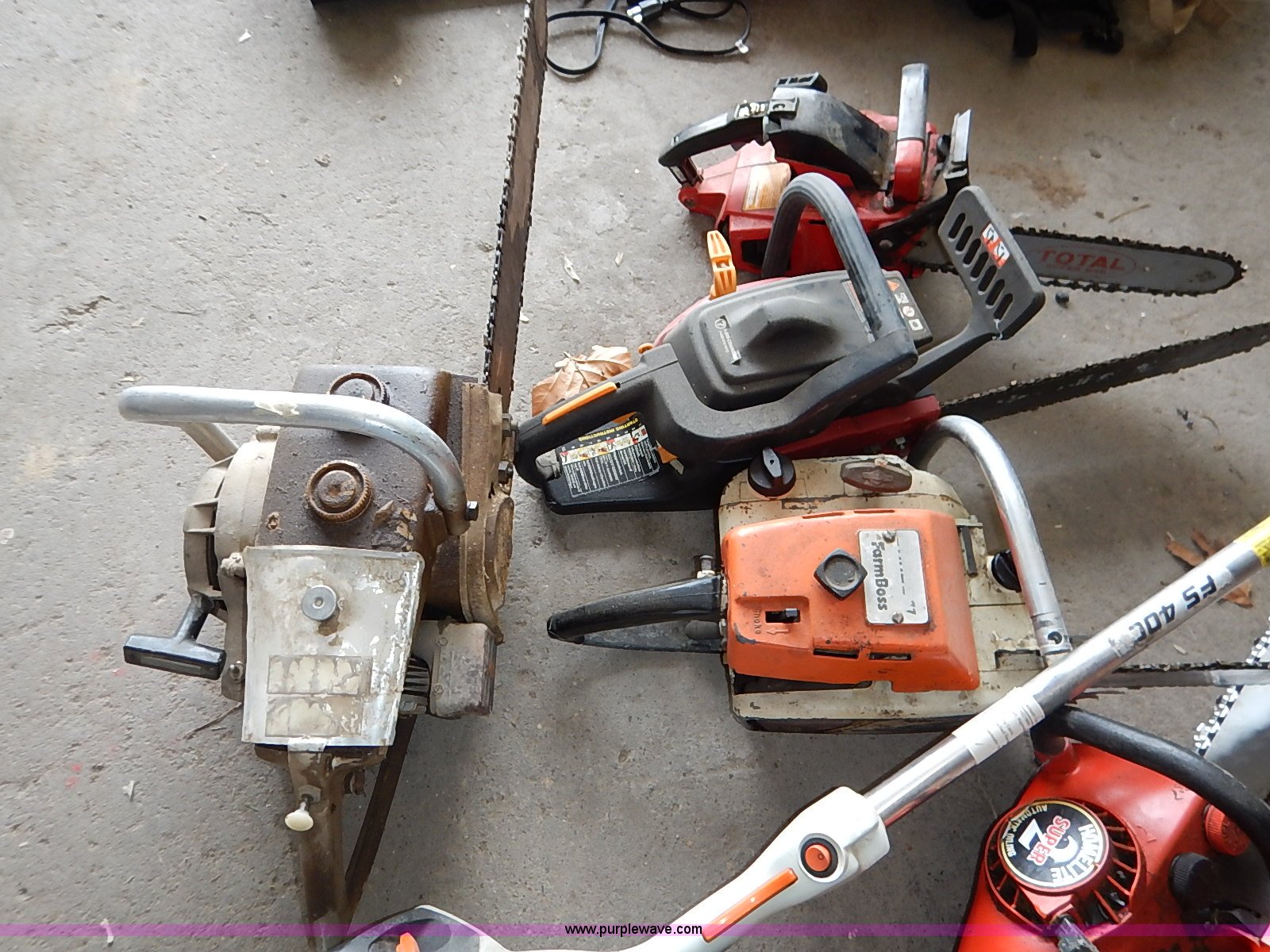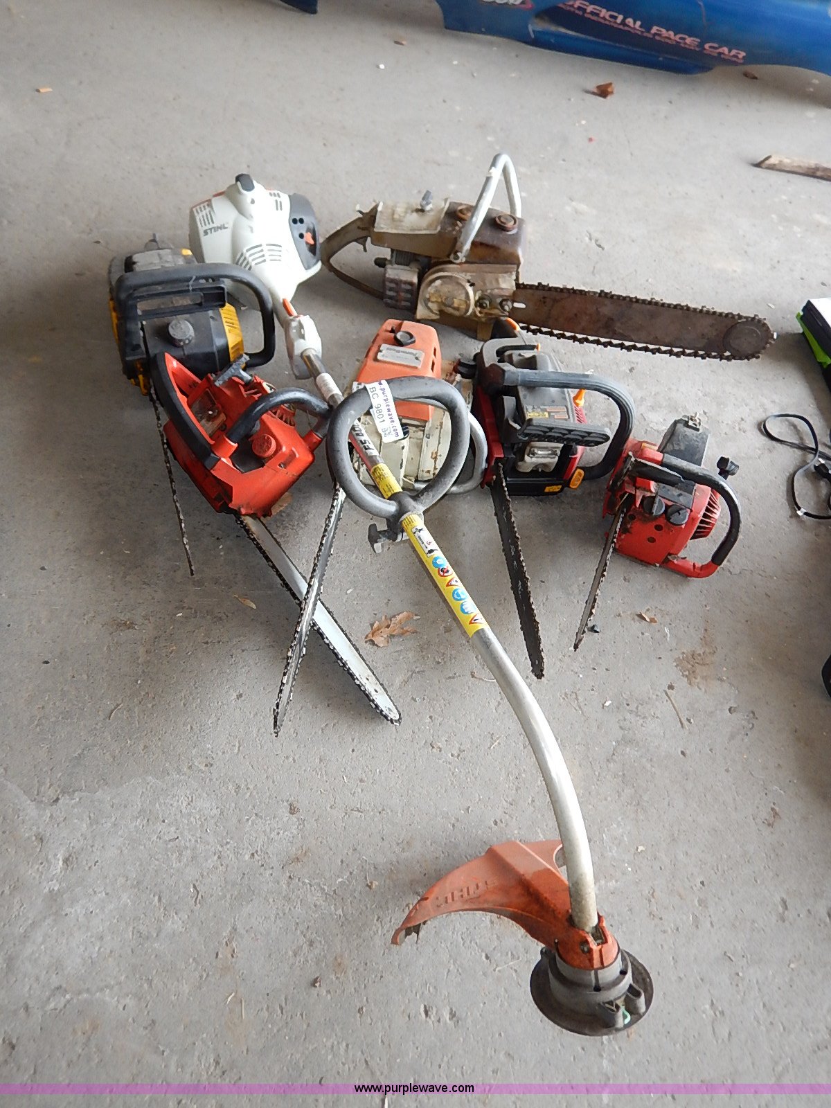 Purple Wave is selling a used Lawn and Garden in Kansas. This item is a Assorted outdoor equipment with the following: Rubbermaid cart, Stihl string trimmer, (6) chainsaws, Unknown operating conditions, Abandoned or seized asset