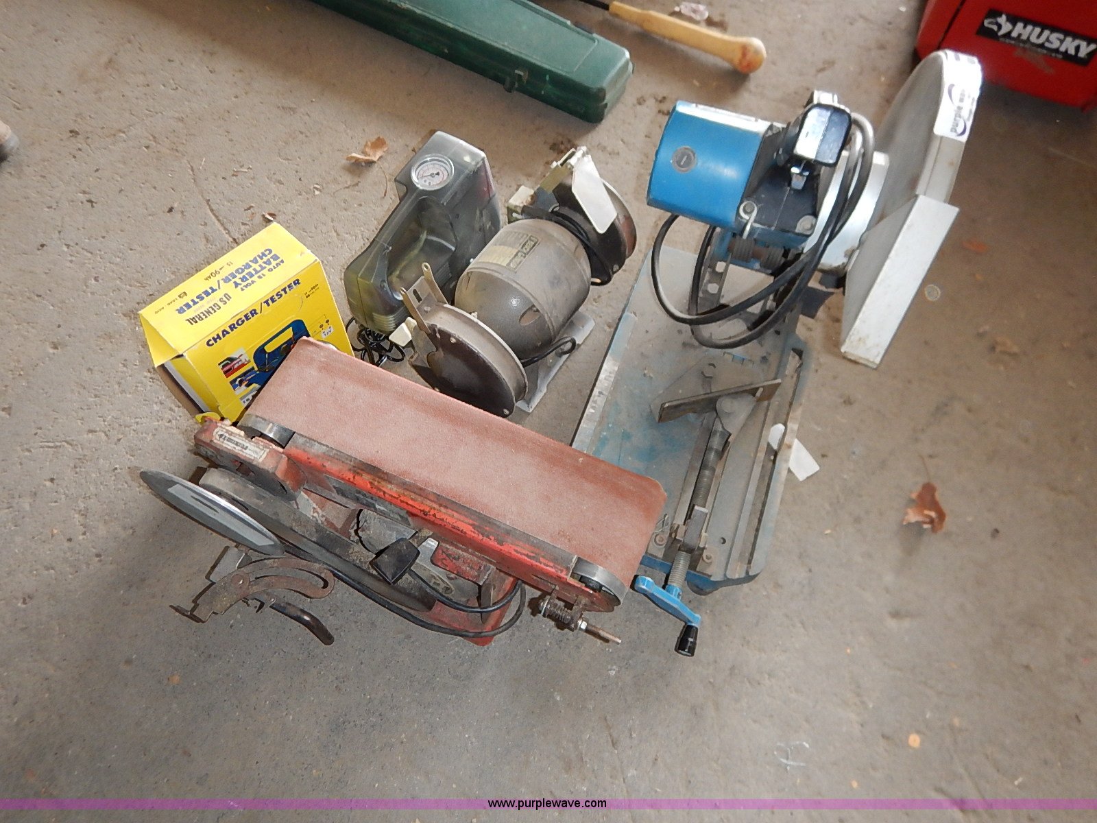 Purple Wave is selling a used Tools in Kansas. This item is a Assorted tools with the following: Ryobi cut-off saw, 6" bench grinder, 12V charger/tester, O.I.T sander, Bon Aire air compressor, 12V, 300 psi, Unknown operating condition, Abandoned or seized asset