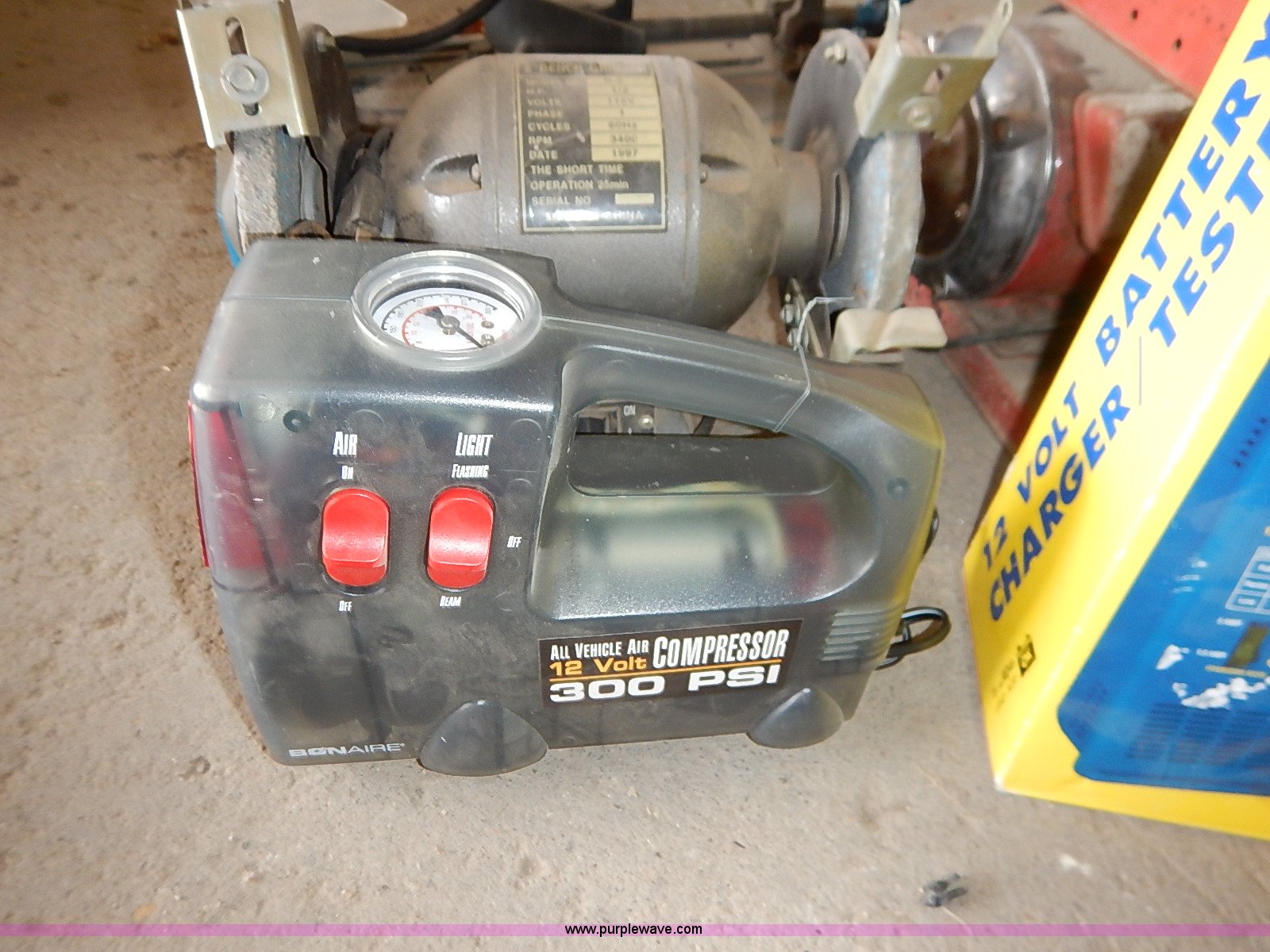 Assorted tools. Ryobi cut-off saw, 6" bench grinder, 12V charger/tester, O.I.T sander, Bon Aire air compressor 12V, 300 psi, Unknown operating condition, Abandoned or seized asset. Dickinson County Sheriffs Department. 109 E 1st. Abilene, KS 67410