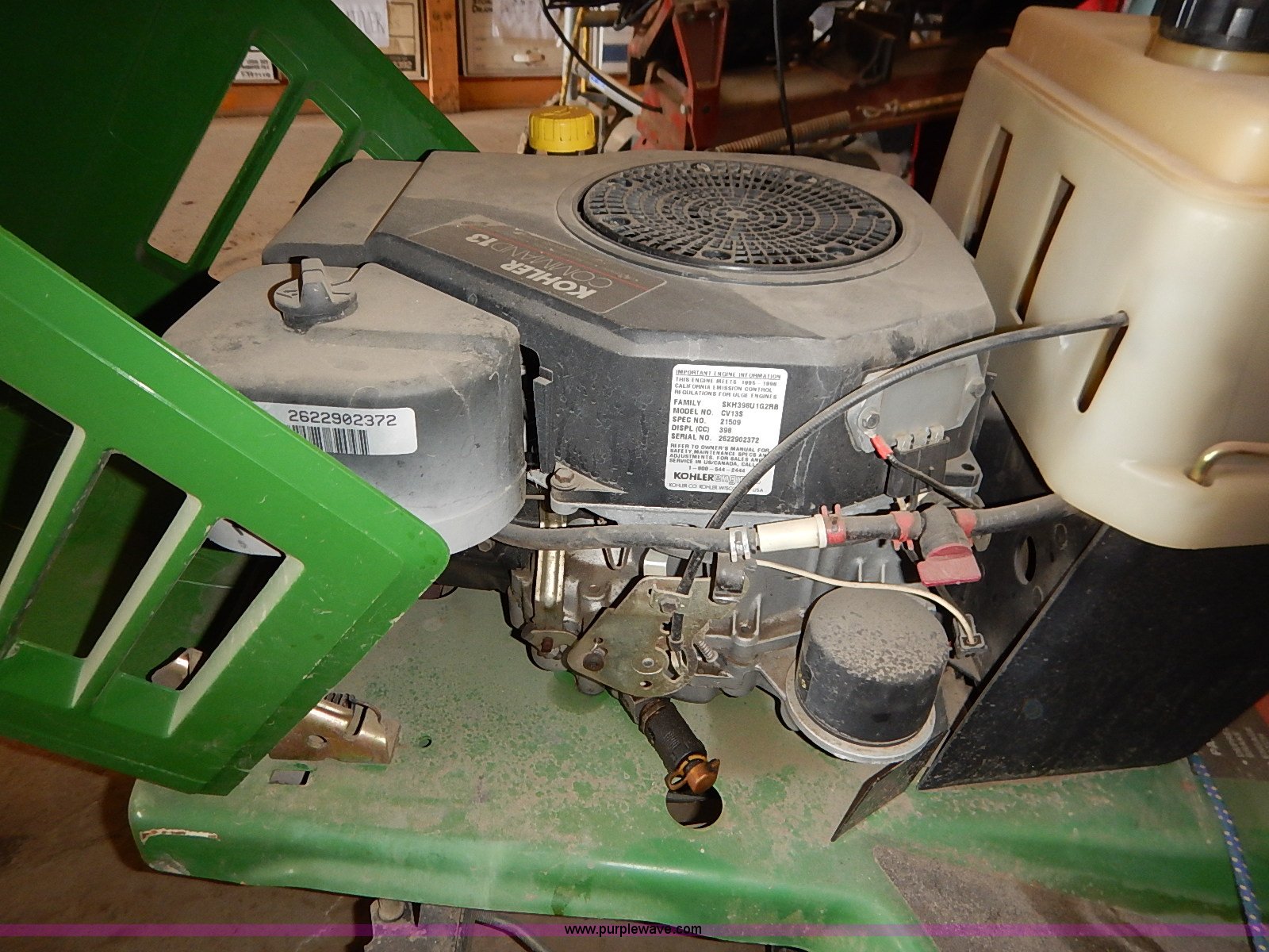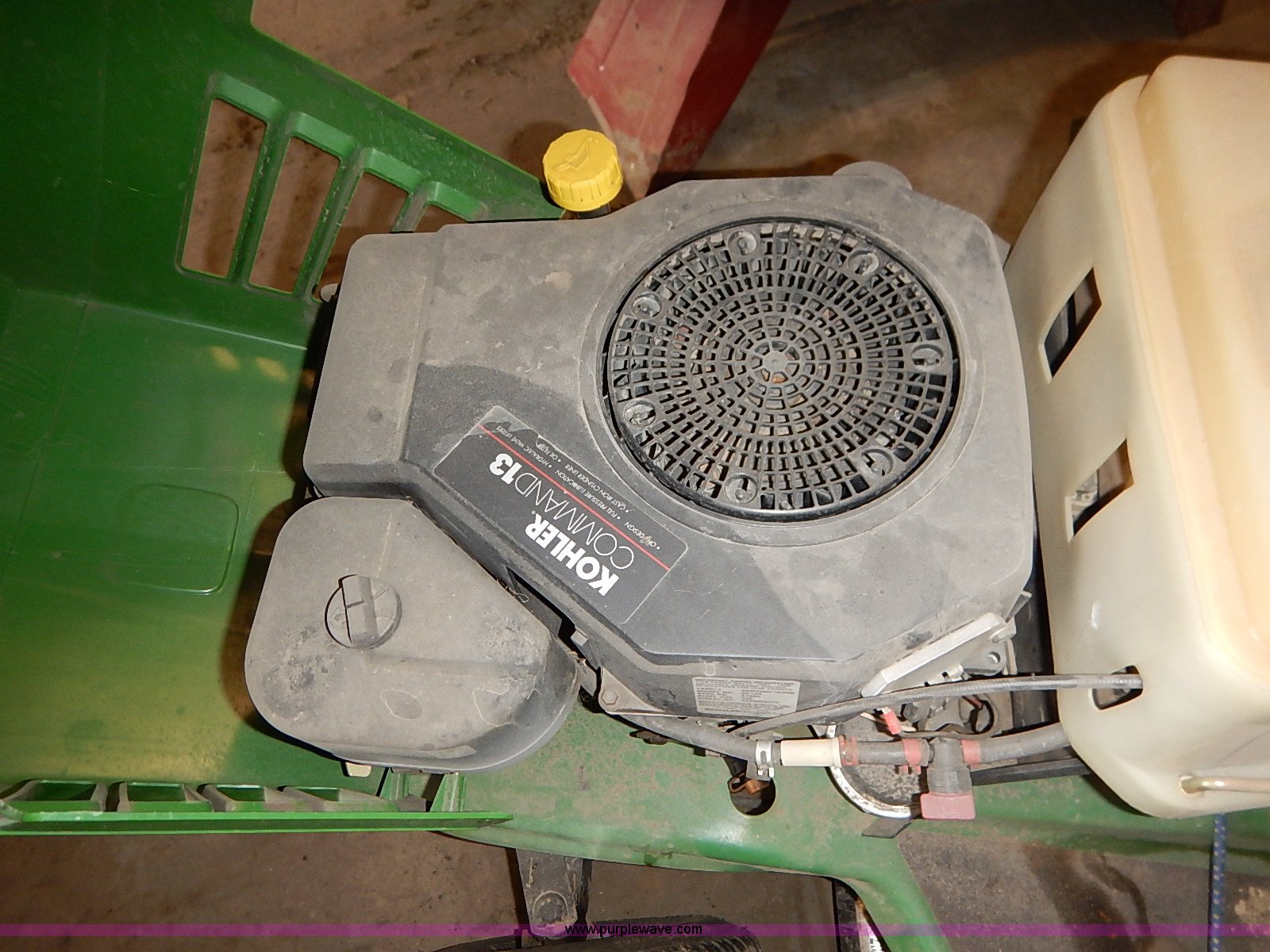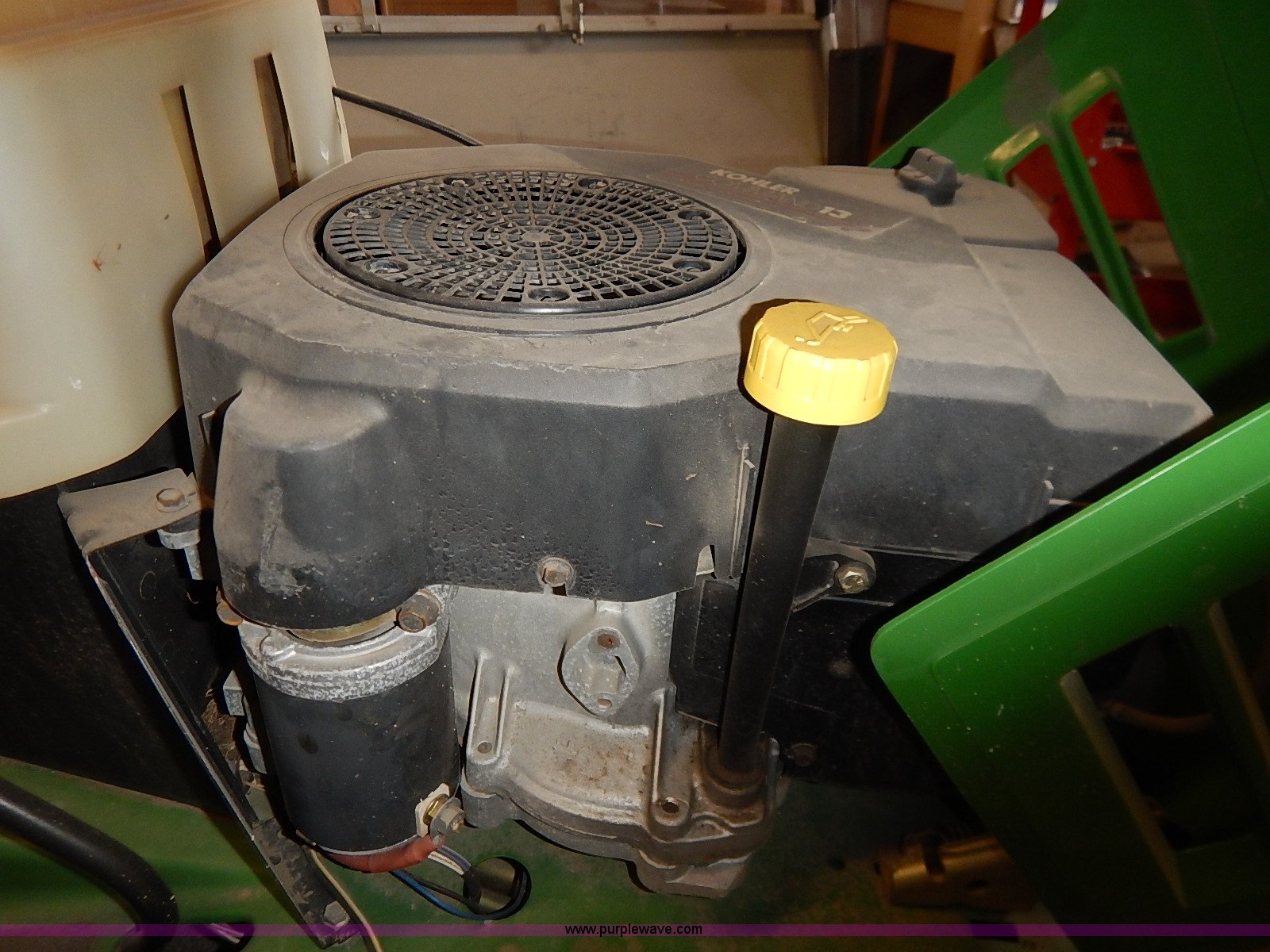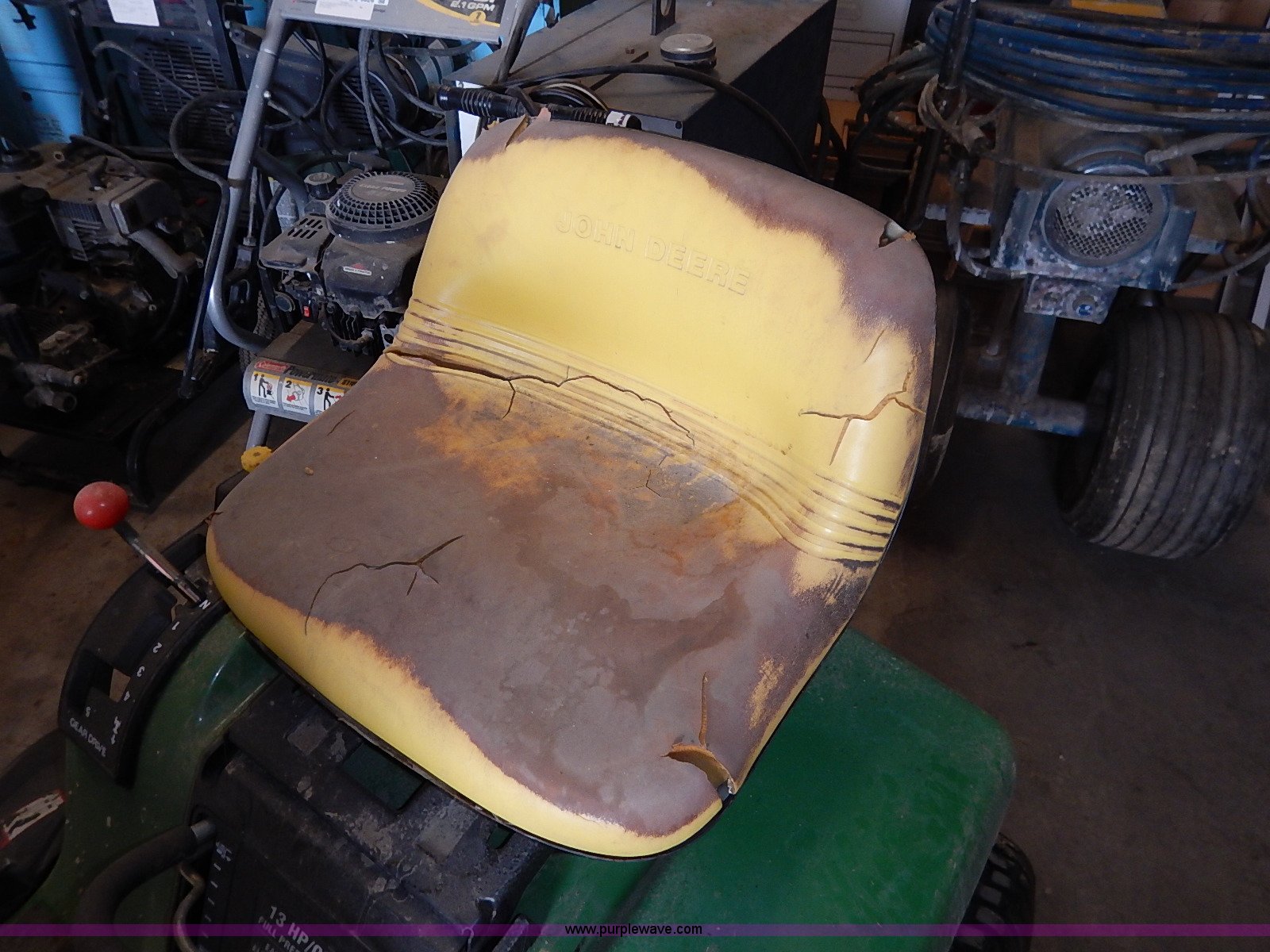 Purple Wave is selling a used Lawn Mower in Kansas. This item is a John Deere STX38 lawn mower with the following: 38" cut, Kohler Command 13 HP gas engine, Five speed transmission, Vinyl seat, Damaged, 15x6.50-6 front tires, Flat, 20x8.00-8 rear tires, No keys, Unknown operating condition, Abandoned or seized asset