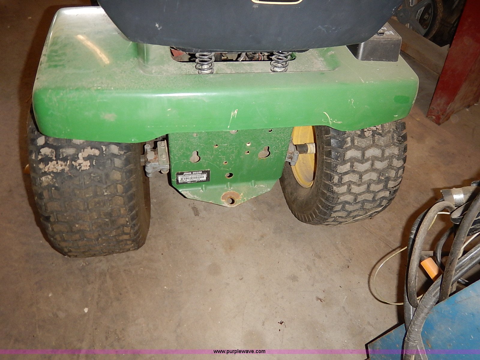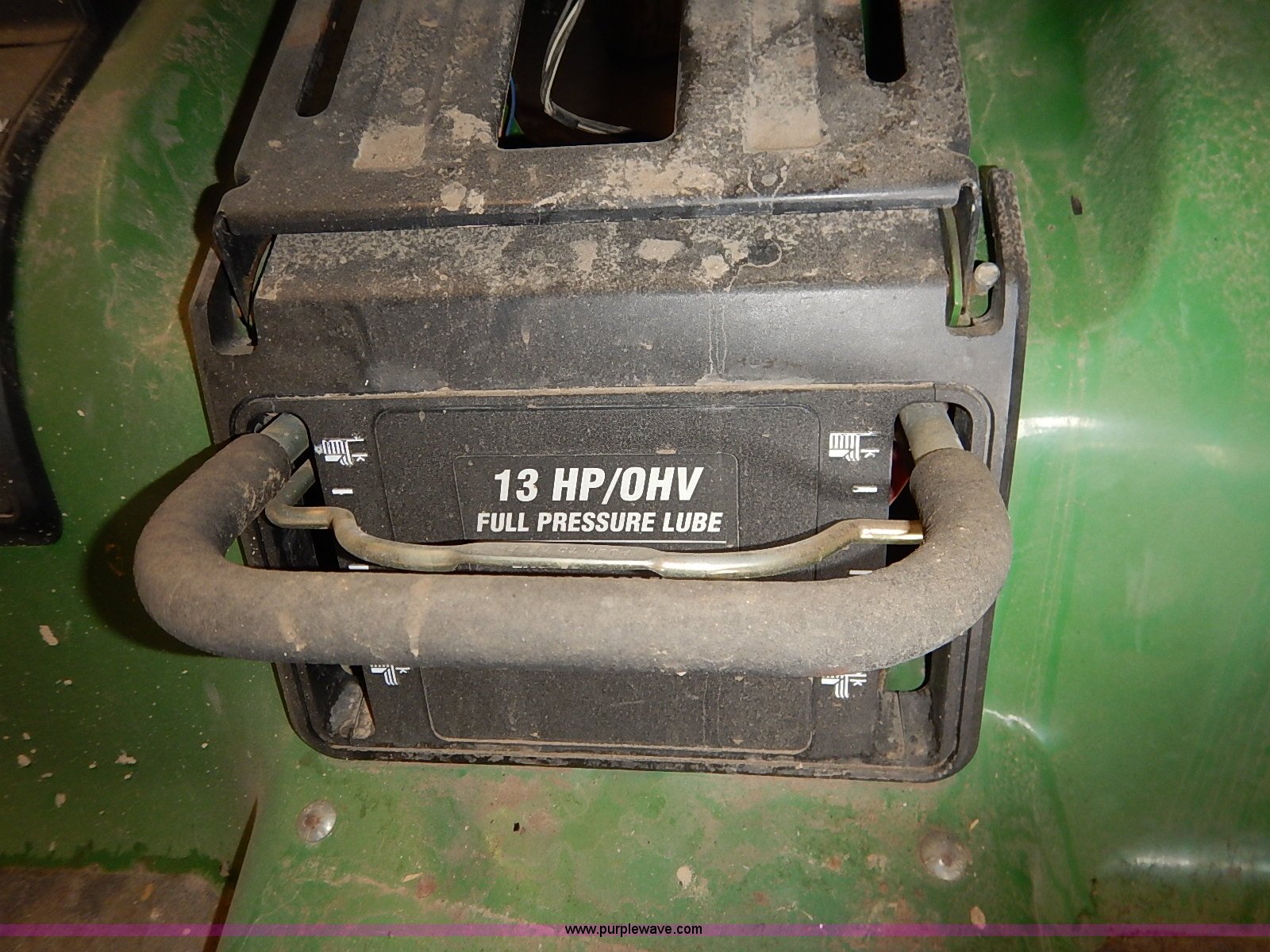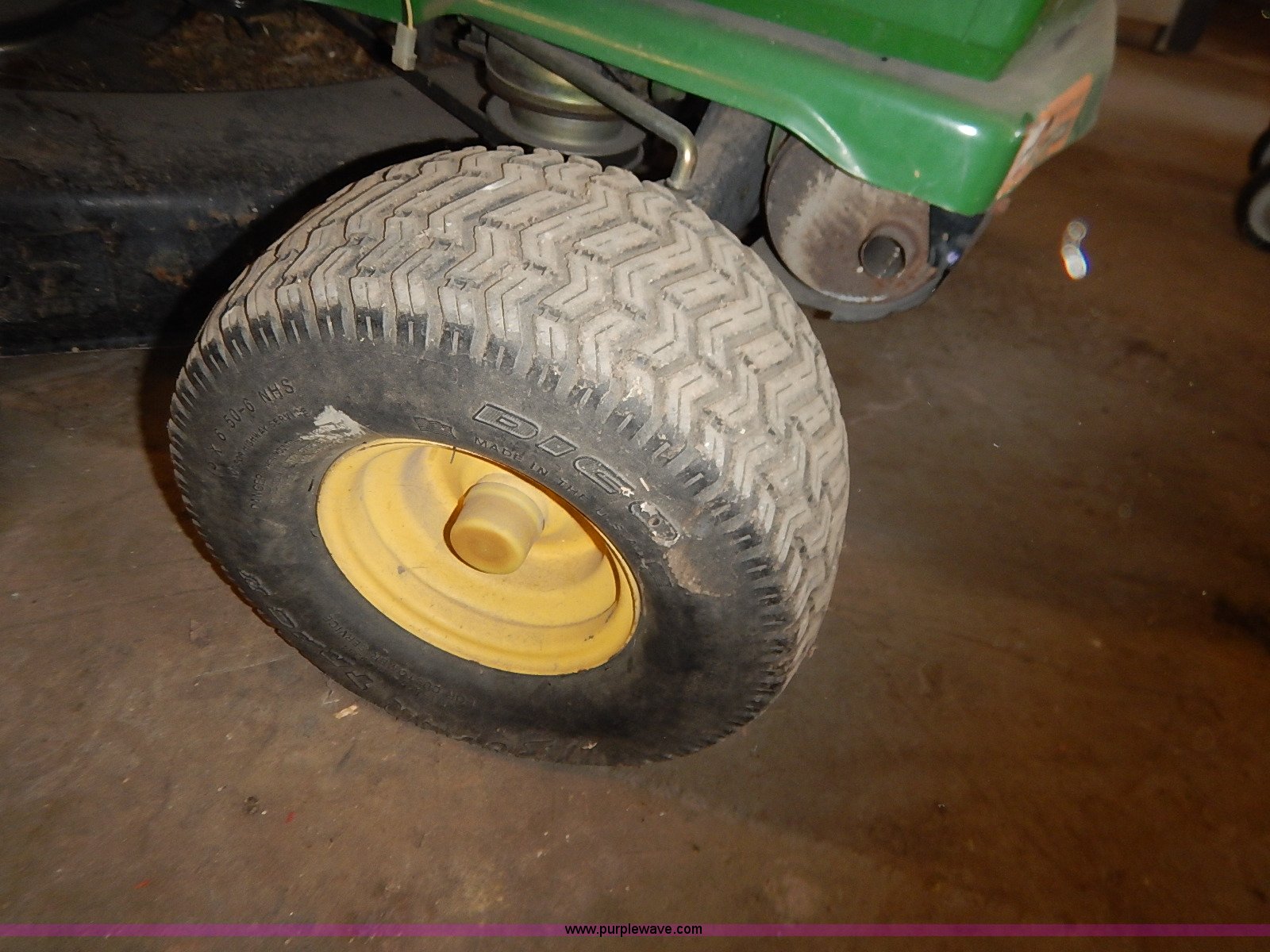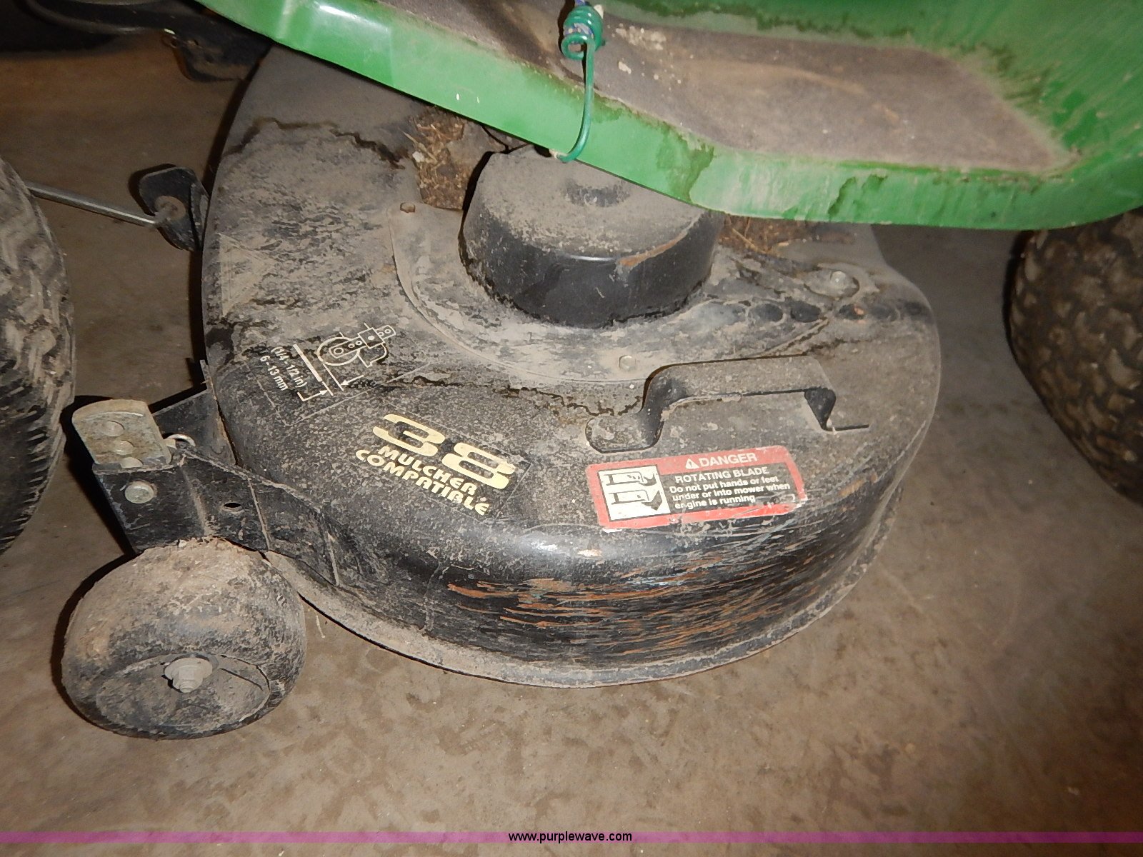 Purple Wave is selling a used Lawn Mower in Kansas. This item is a John Deere STX38 lawn mower with the following: 38" cut, Kohler Command 13 HP gas engine, Five speed transmission, Vinyl seat, Damaged, 15x6.50-6 front tires, Flat, 20x8.00-8 rear tires, No keys, Unknown operating condition, Abandoned or seized asset