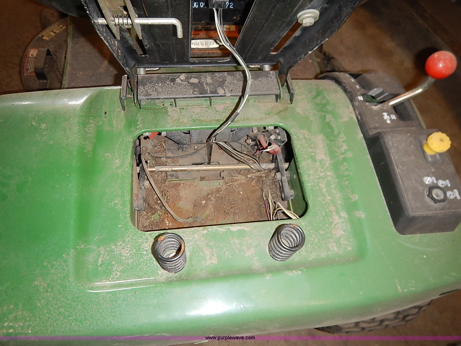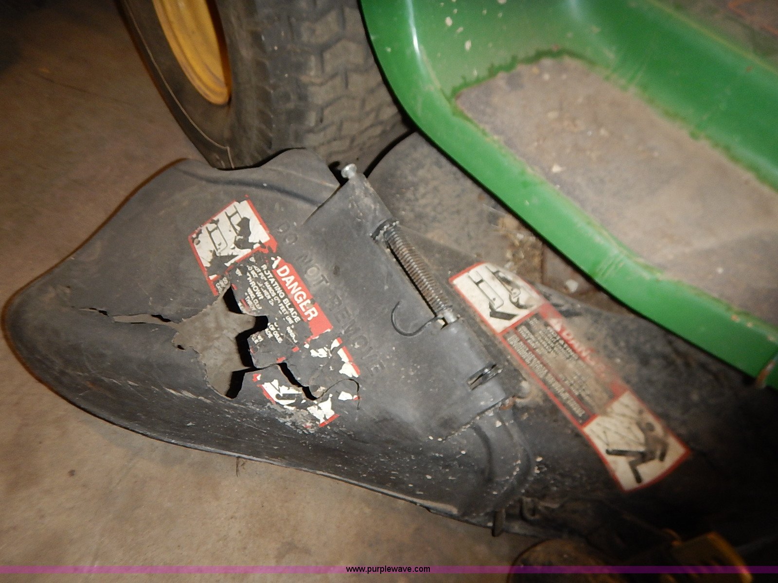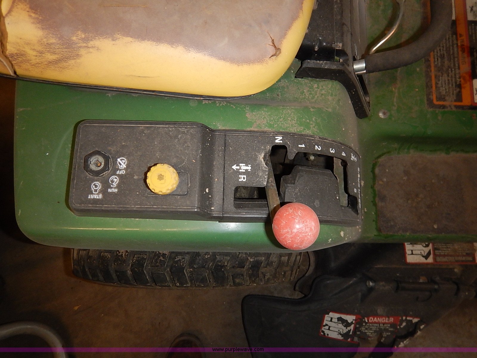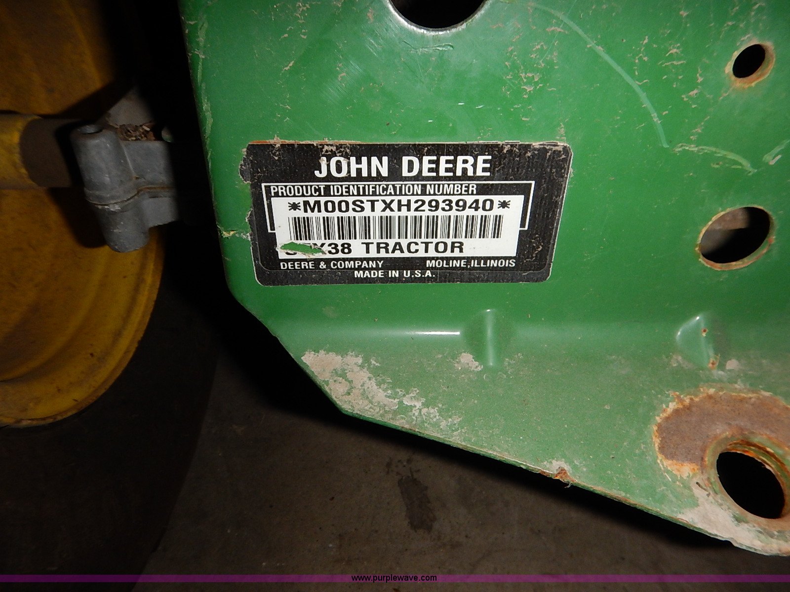 Purple Wave is selling a used Lawn Mower in Kansas. This item is a John Deere STX38 lawn mower with the following: 38" cut, Kohler Command 13 HP gas engine, Five speed transmission, Vinyl seat, Damaged, 15x6.50-6 front tires, Flat, 20x8.00-8 rear tires, No keys, Unknown operating condition, Abandoned or seized asset