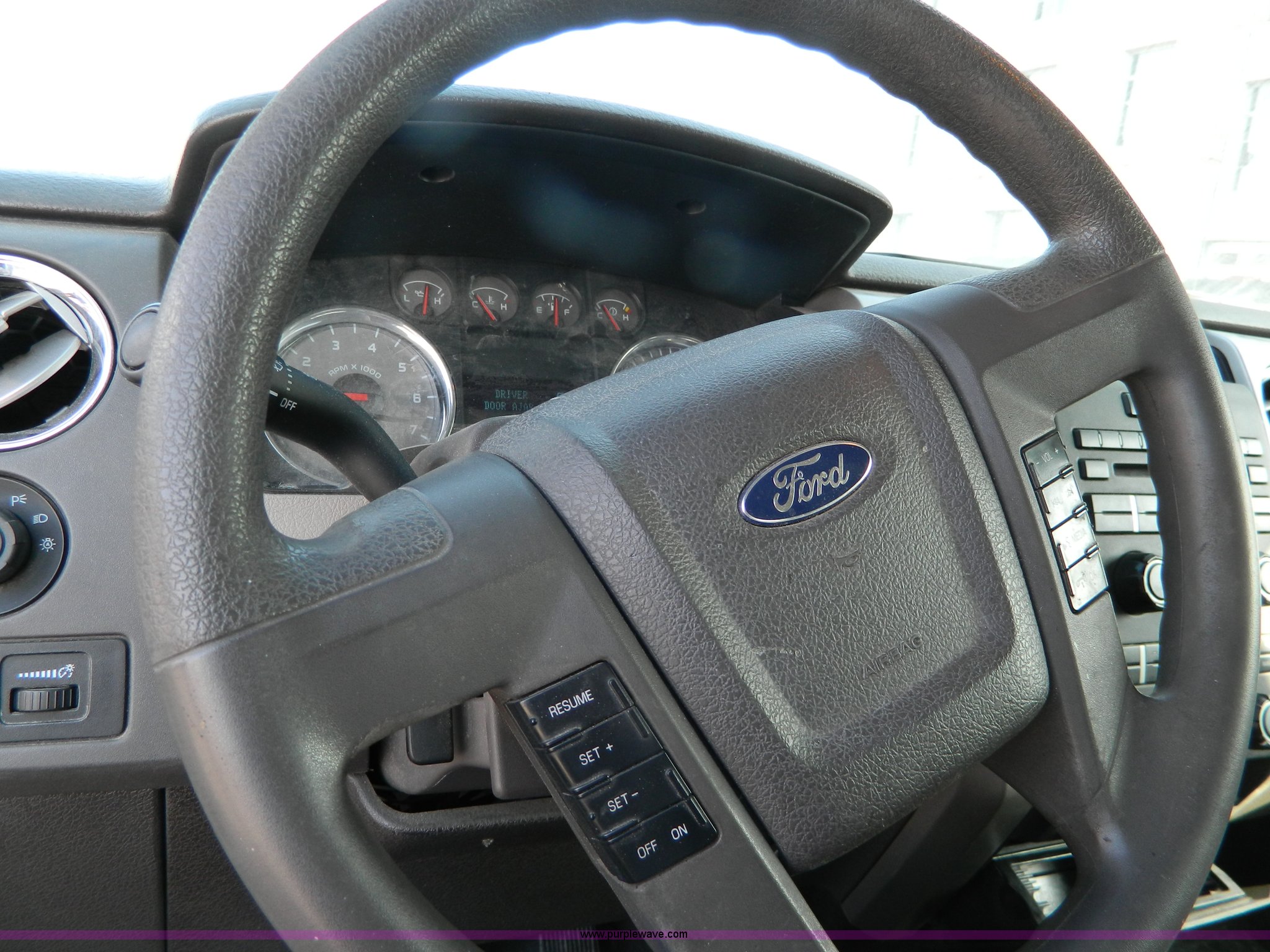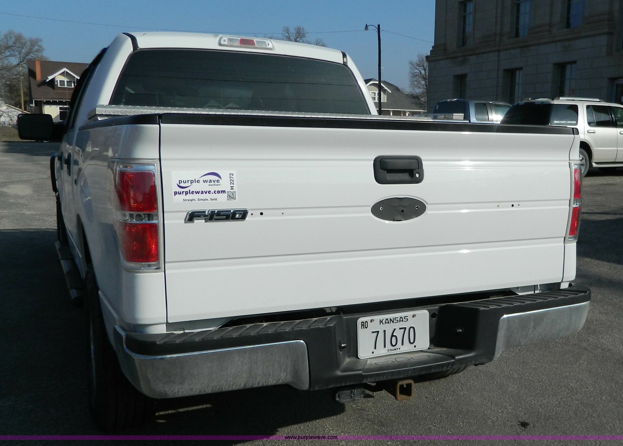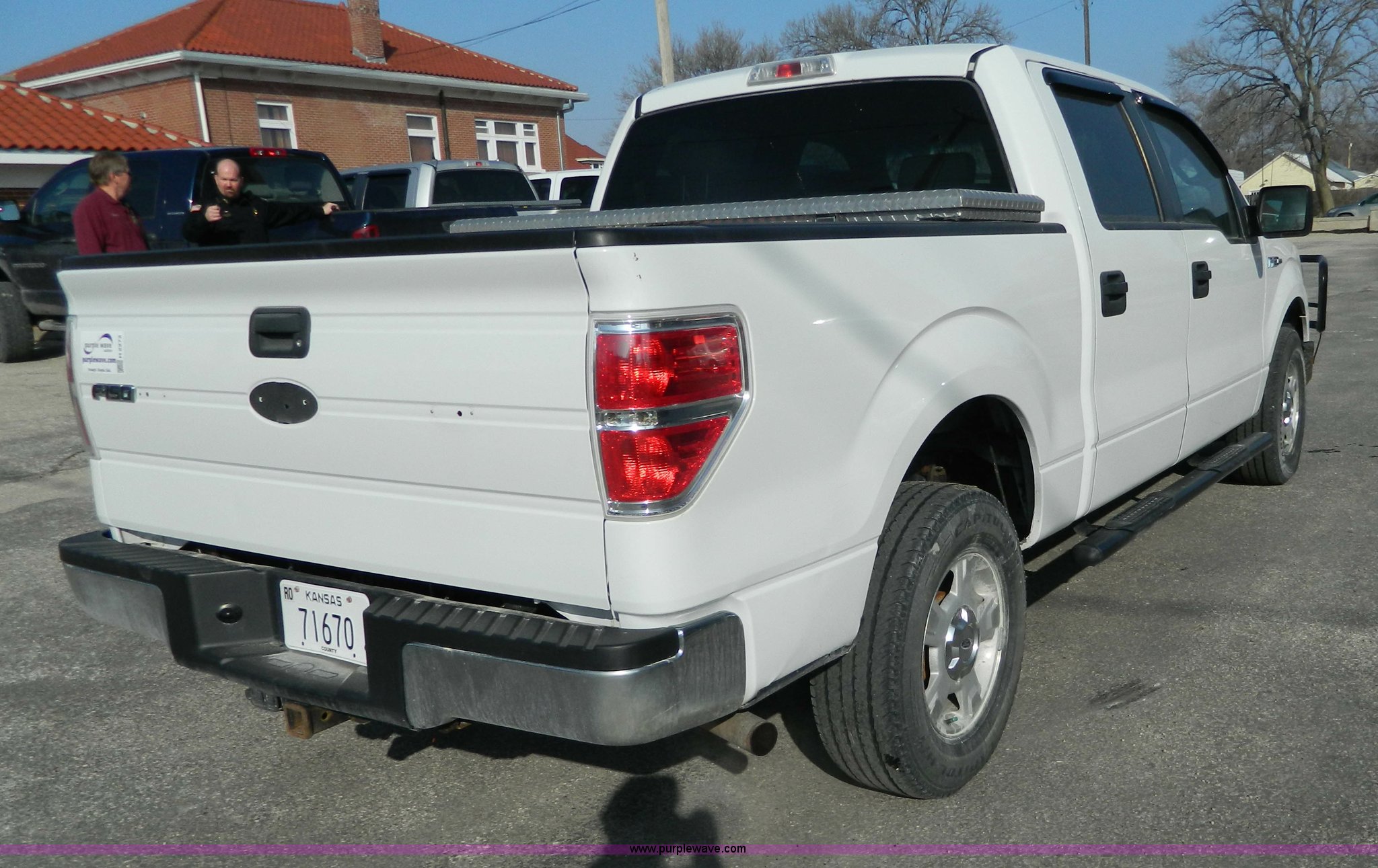 Purple Wave is selling a used 1/2 Ton Pickup or Van in Kansas. This item is a 2009 Ford F150 XLT SuperCrew pickup truck with the following: 142,161 miles on odometer, 4.6L V8 gas engine, Automatic transmission, Four wheel drive, AC and heat, Tilt, Cruise, AM/FM/CD, Power windows, locks, mirrors, and seats, Cloth interior, Thunderstruck grill guard, Keyless entry, Remote start, Toolbox, Receiver hitch, Trailer wiring, LT265/70R17 tires, Cosmetic damage, Decal residue, CD compartment latch broken