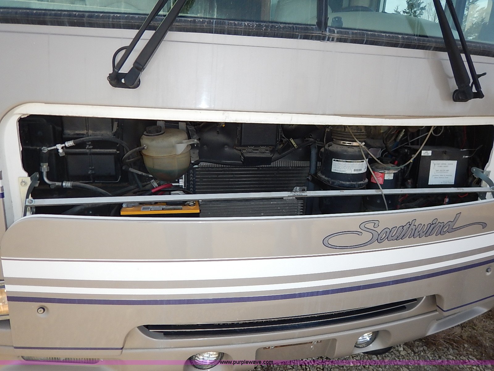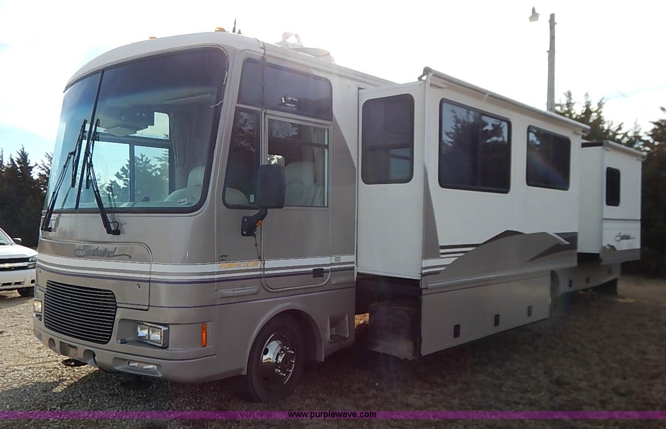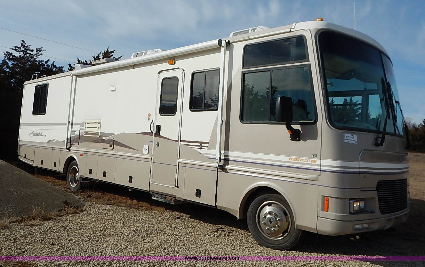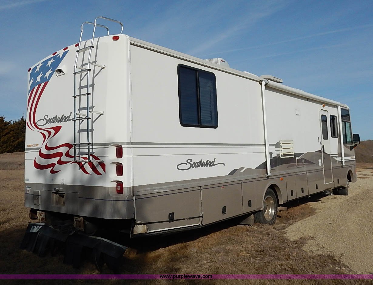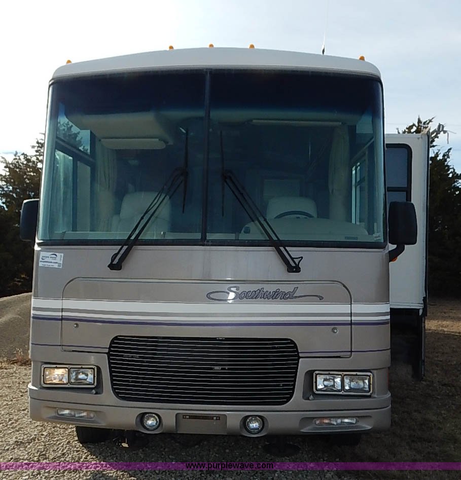 Purple Wave is selling a used RV in Kansas. This item is a 2000 Ford 36T Fleetwood Southwind RV with the following: 44,556 miles on odometer, 6.8L V10 EFI-SOHC gas engine, Automatic transmission, AC and heat, Tilt, Cruise, AM/FM/CD, Manual windows and locks, Leather interior, Fog lights, Panasonic 20" television, Onan Marquis 5500 generator, 302 hours on meter, Carburetor needs rebuilt, Recliner, Couch, Carpeting, (2) Canopies, Cabinets, Table, Benches, Sink, Magic Chef oven, Sharp microwave, Refrigerator/freezer, Bathroom, Shower, Sink, Toilet, Bedroom, Bed, Cabinets, Panasonic 14" television, (2) fold outs and slide outs, Receiver hitch, Trailer wiring, 245/70R19.5 tires, Recently replaced battery, Winterized, Rear bumper missing, Exterior cosmetic damage, Cracked windshield