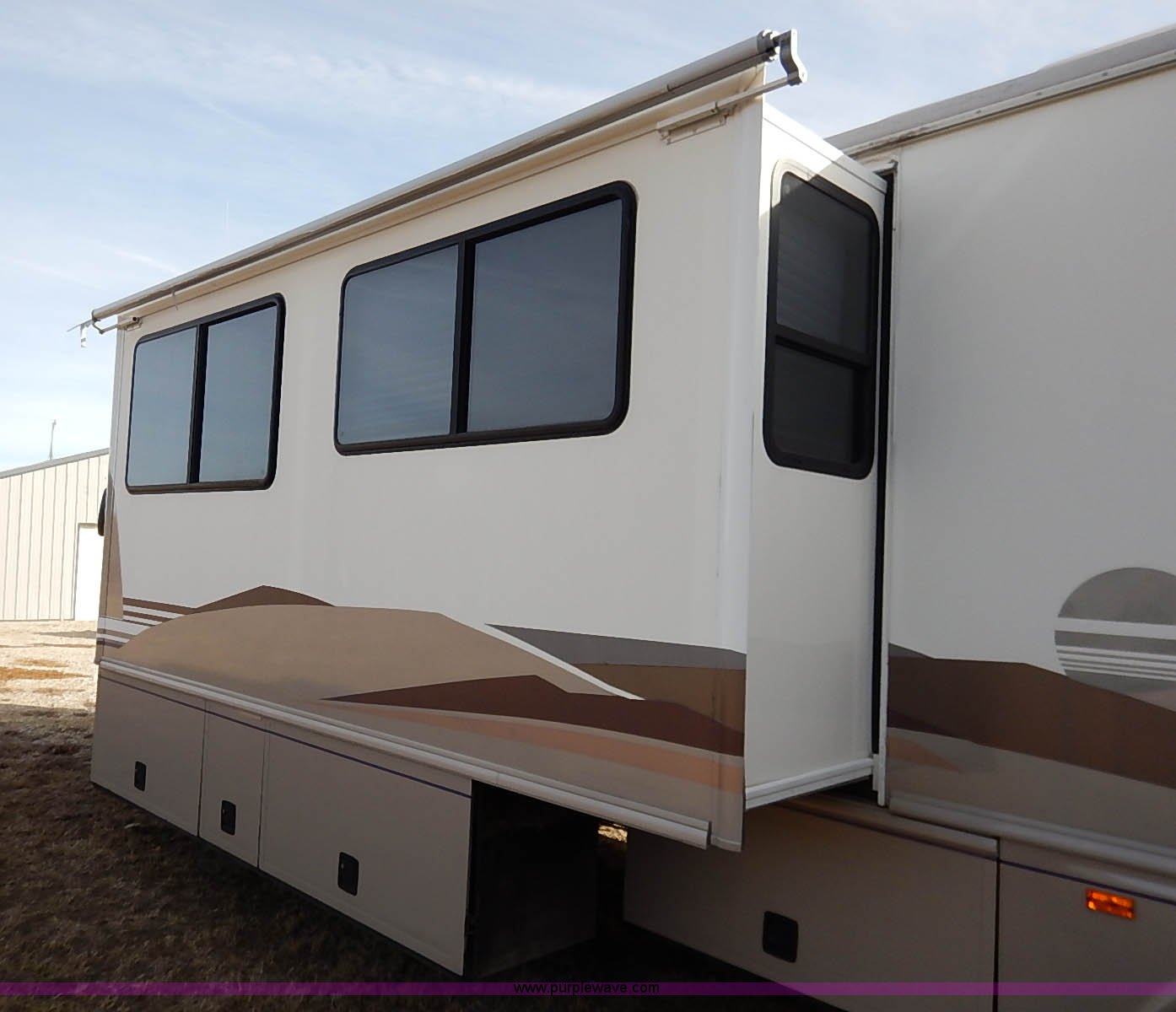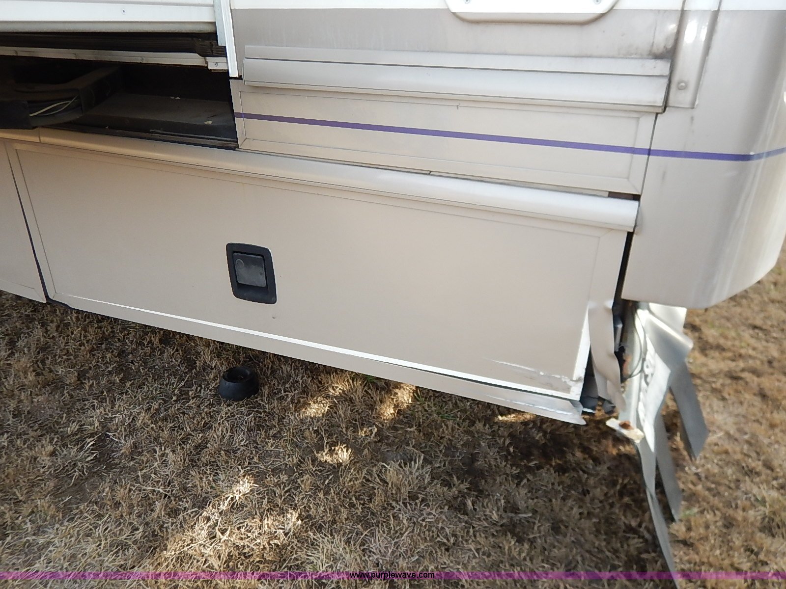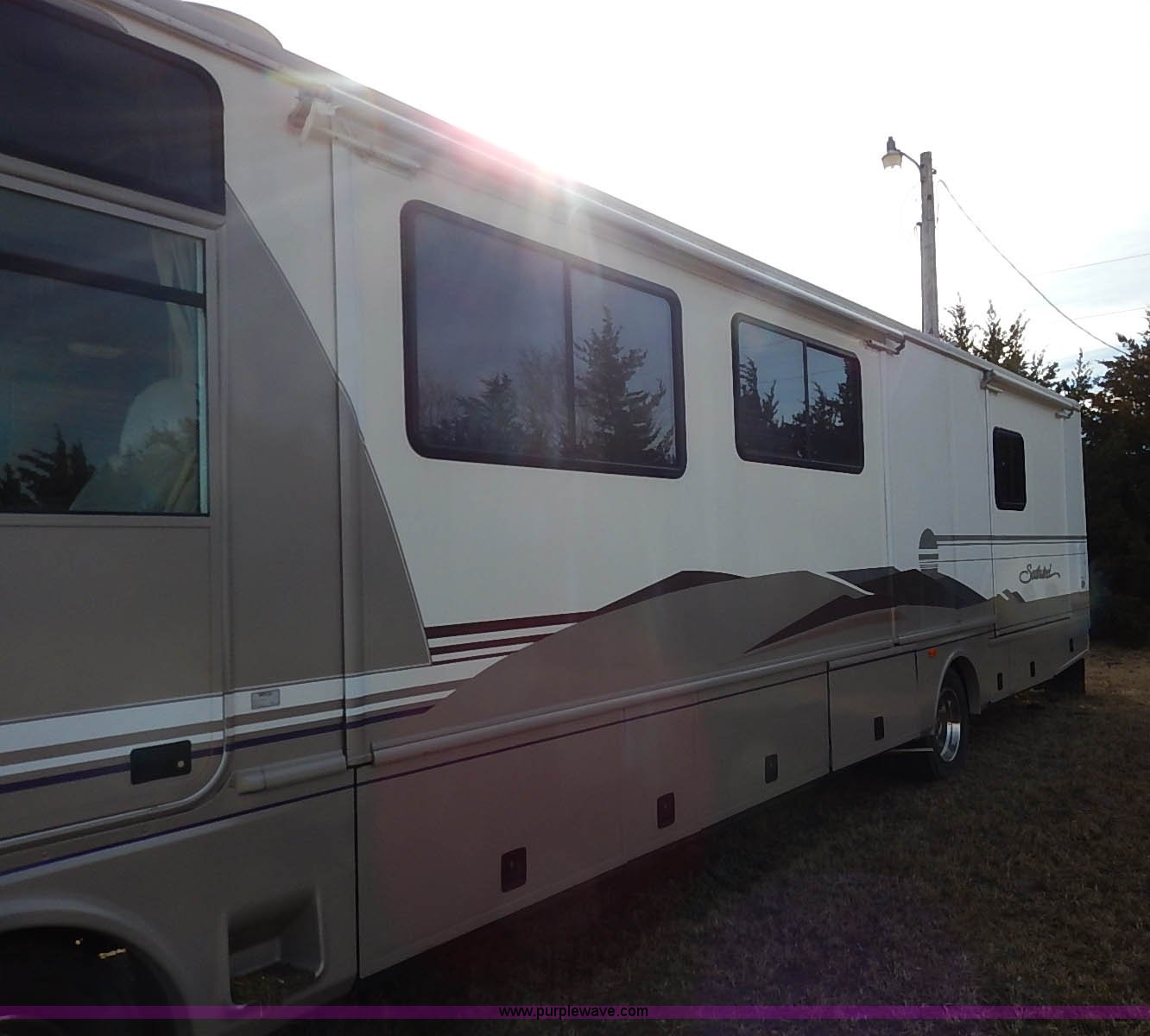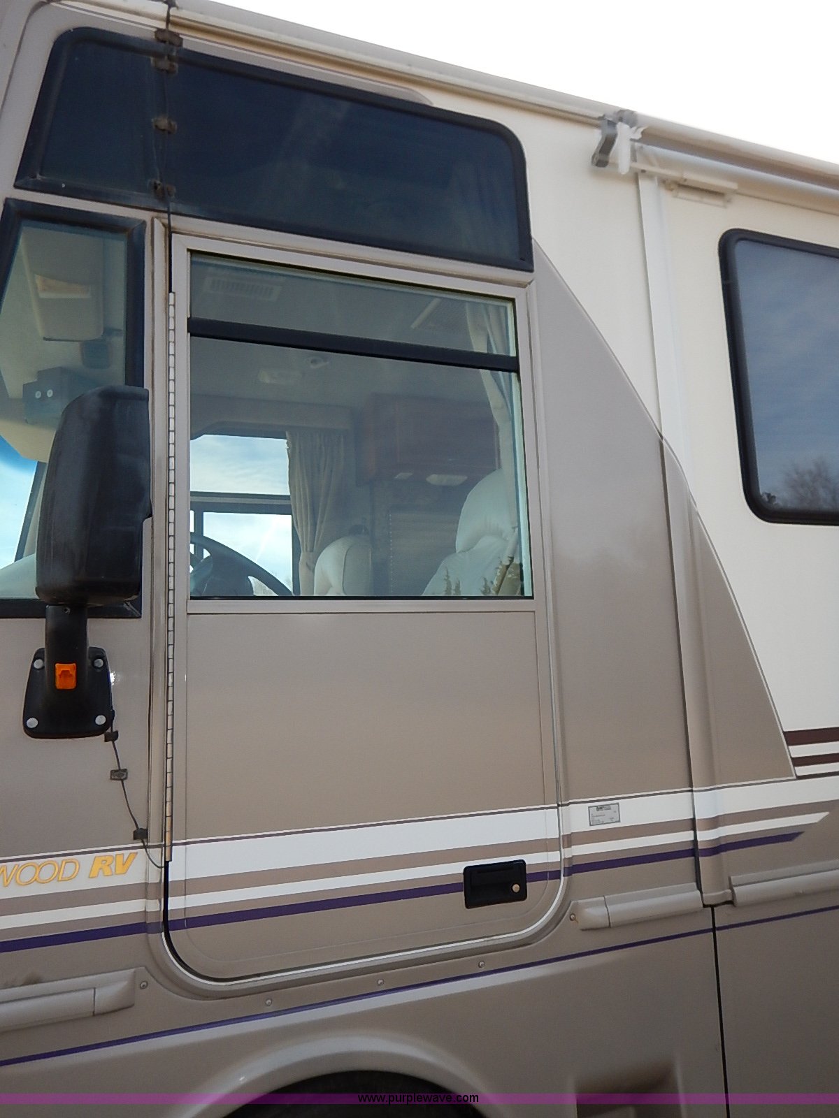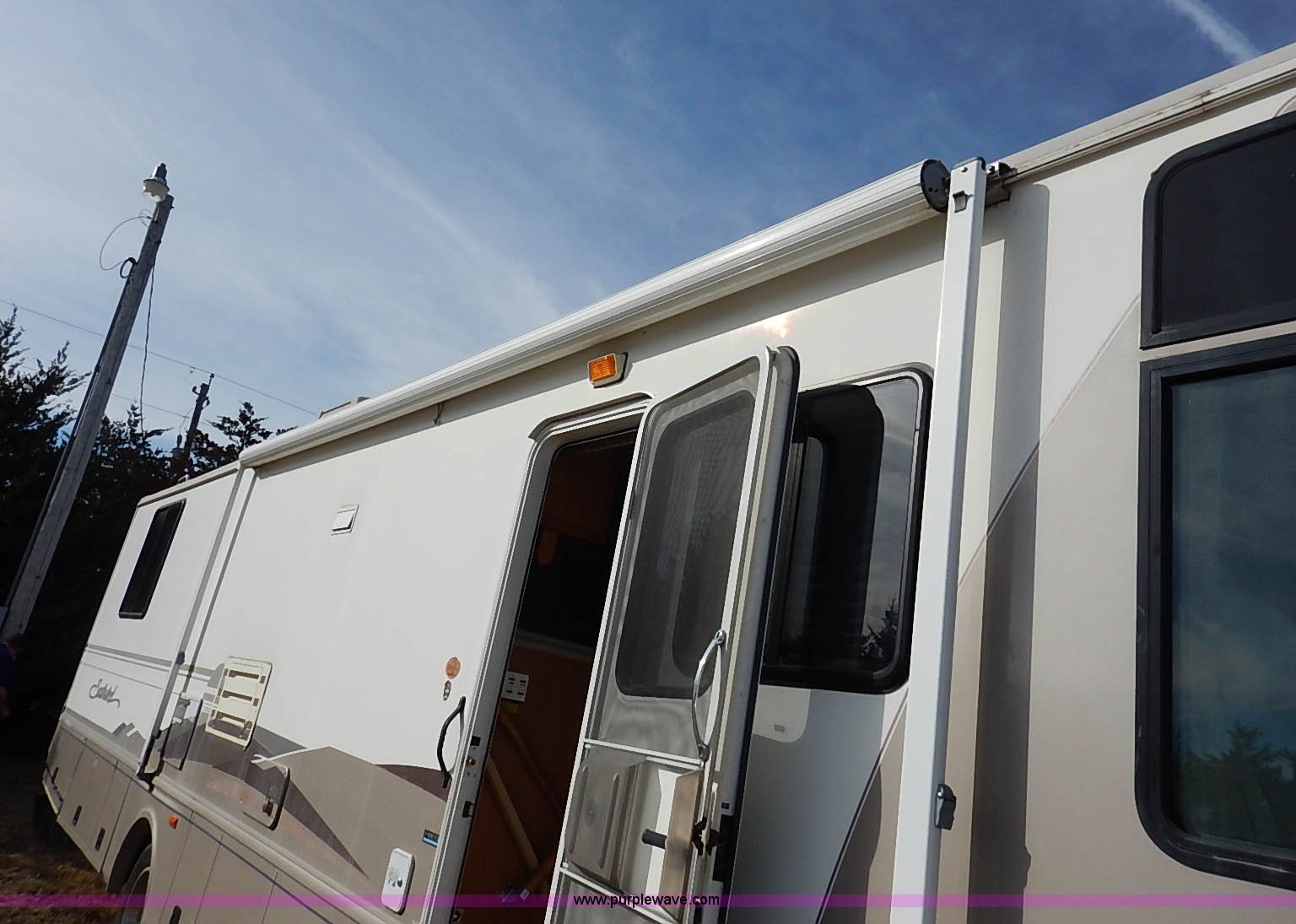 Purple Wave is selling a used RV in Kansas. This item is a 2000 Ford 36T Fleetwood Southwind RV with the following: 44,556 miles on odometer, 6.8L V10 EFI-SOHC gas engine, Automatic transmission, AC and heat, Tilt, Cruise, AM/FM/CD, Manual windows and locks, Leather interior, Fog lights, Panasonic 20" television, Onan Marquis 5500 generator, 302 hours on meter, Carburetor needs rebuilt, Recliner, Couch, Carpeting, (2) Canopies, Cabinets, Table, Benches, Sink, Magic Chef oven, Sharp microwave, Refrigerator/freezer, Bathroom, Shower, Sink, Toilet, Bedroom, Bed, Cabinets, Panasonic 14" television, (2) fold outs and slide outs, Receiver hitch, Trailer wiring, 245/70R19.5 tires, Recently replaced battery, Winterized, Rear bumper missing, Exterior cosmetic damage, Cracked windshield