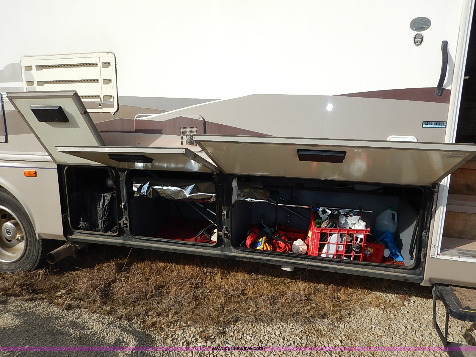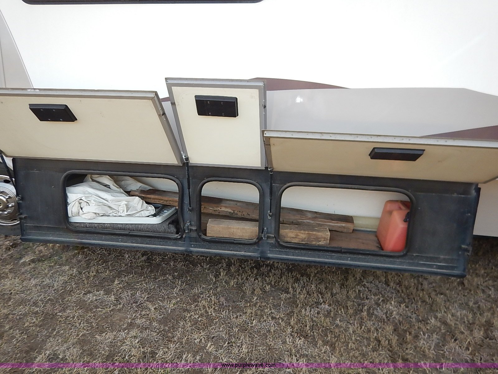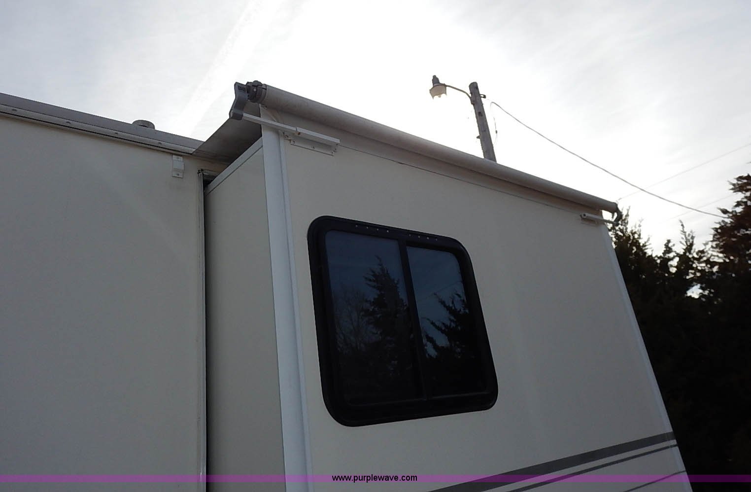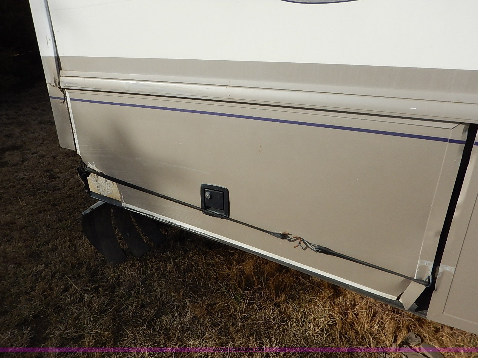 Purple Wave is selling a used RV in Kansas. This item is a 2000 Ford 36T Fleetwood Southwind RV with the following: 44,556 miles on odometer, 6.8L V10 EFI-SOHC gas engine, Automatic transmission, AC and heat, Tilt, Cruise, AM/FM/CD, Manual windows and locks, Leather interior, Fog lights, Panasonic 20" television, Onan Marquis 5500 generator, 302 hours on meter, Carburetor needs rebuilt, Recliner, Couch, Carpeting, (2) Canopies, Cabinets, Table, Benches, Sink, Magic Chef oven, Sharp microwave, Refrigerator/freezer, Bathroom, Shower, Sink, Toilet, Bedroom, Bed, Cabinets, Panasonic 14" television, (2) fold outs and slide outs, Receiver hitch, Trailer wiring, 245/70R19.5 tires, Recently replaced battery, Winterized, Rear bumper missing, Exterior cosmetic damage, Cracked windshield