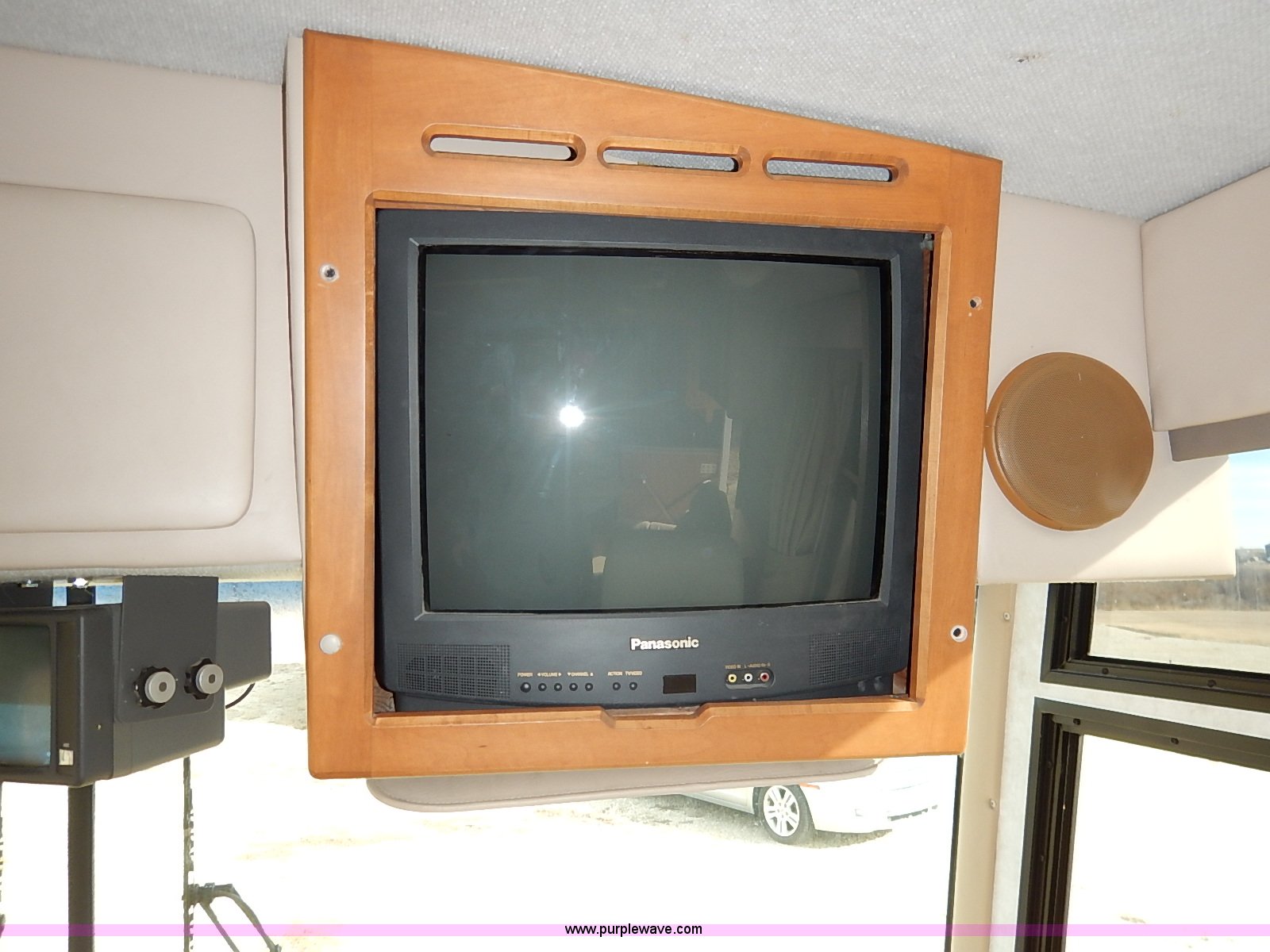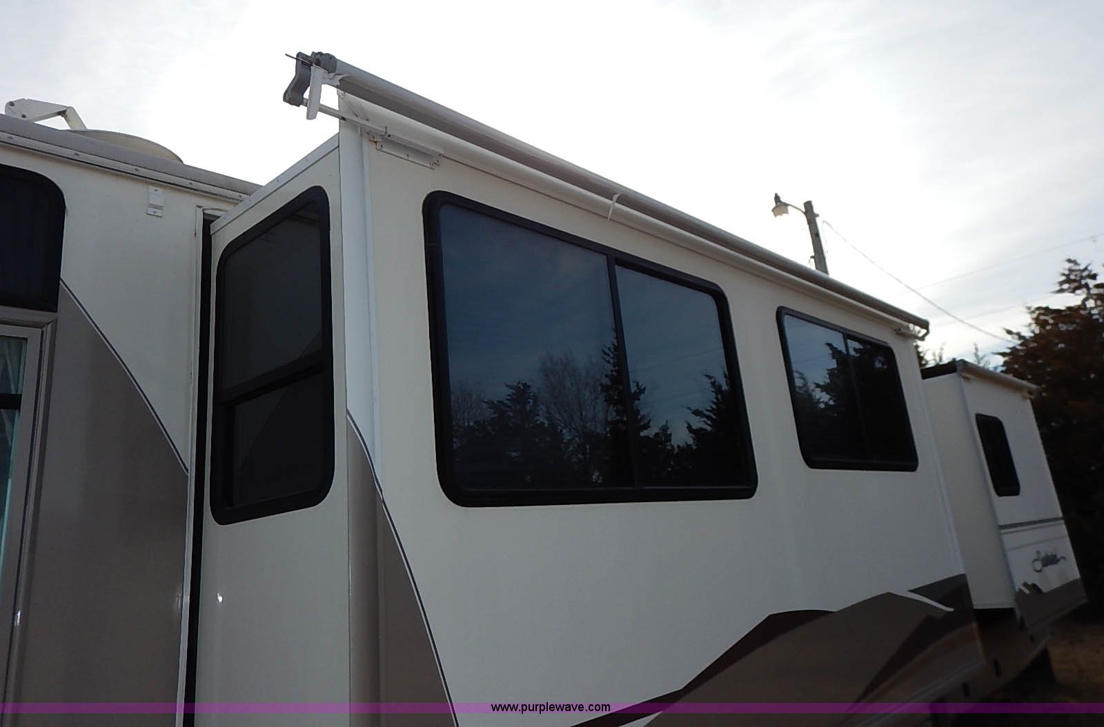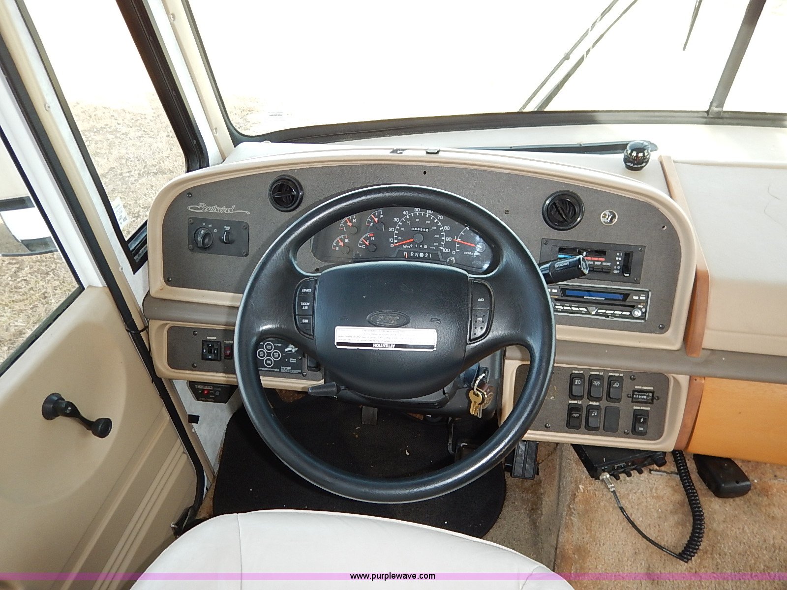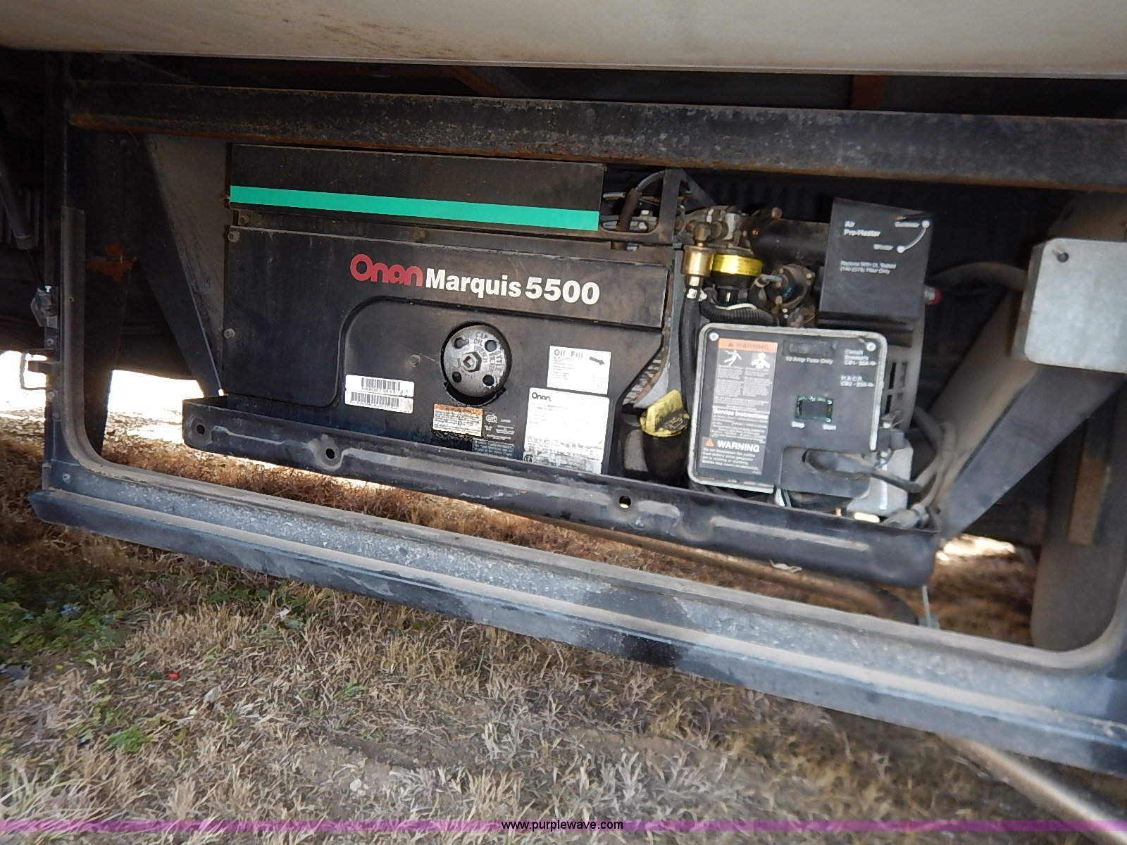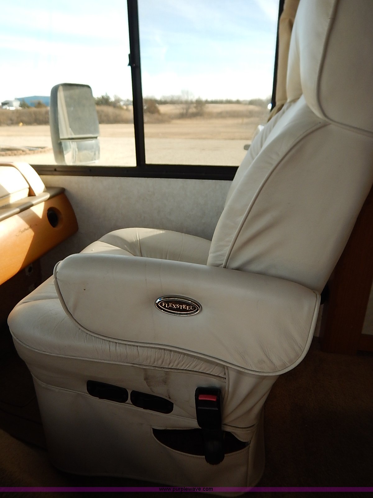 Purple Wave is selling a used RV in Kansas. This item is a 2000 Ford 36T Fleetwood Southwind RV with the following: 44,556 miles on odometer, 6.8L V10 EFI-SOHC gas engine, Automatic transmission, AC and heat, Tilt, Cruise, AM/FM/CD, Manual windows and locks, Leather interior, Fog lights, Panasonic 20" television, Onan Marquis 5500 generator, 302 hours on meter, Carburetor needs rebuilt, Recliner, Couch, Carpeting, (2) Canopies, Cabinets, Table, Benches, Sink, Magic Chef oven, Sharp microwave, Refrigerator/freezer, Bathroom, Shower, Sink, Toilet, Bedroom, Bed, Cabinets, Panasonic 14" television, (2) fold outs and slide outs, Receiver hitch, Trailer wiring, 245/70R19.5 tires, Recently replaced battery, Winterized, Rear bumper missing, Exterior cosmetic damage, Cracked windshield