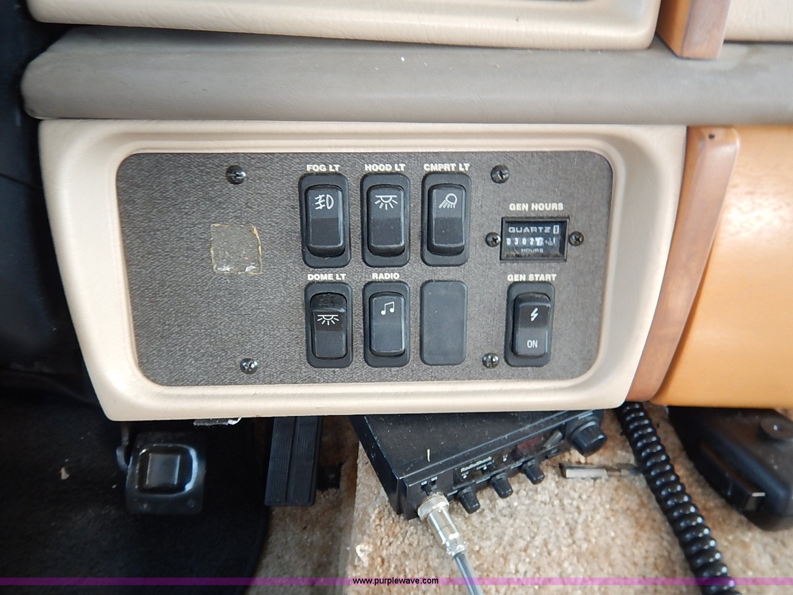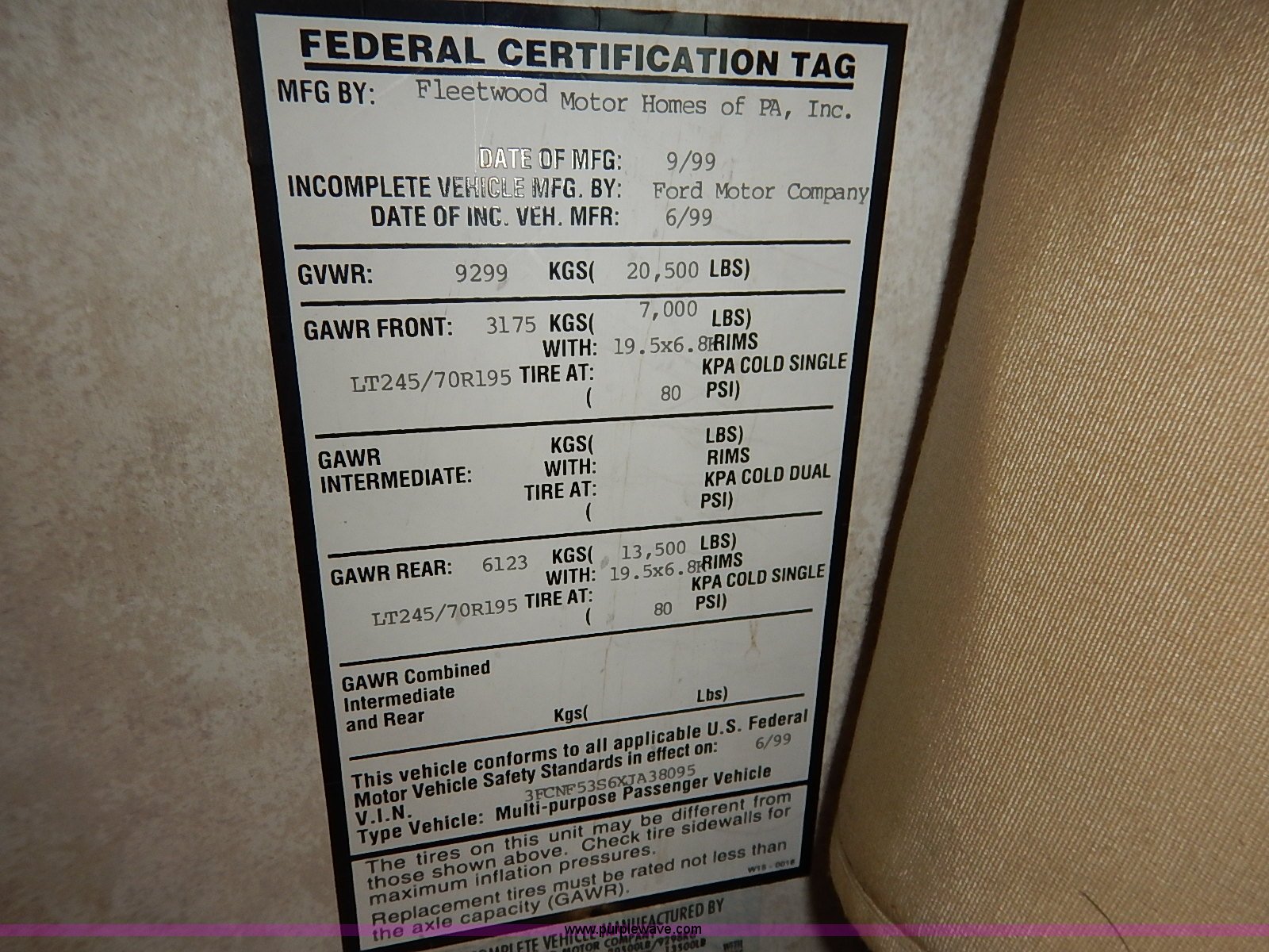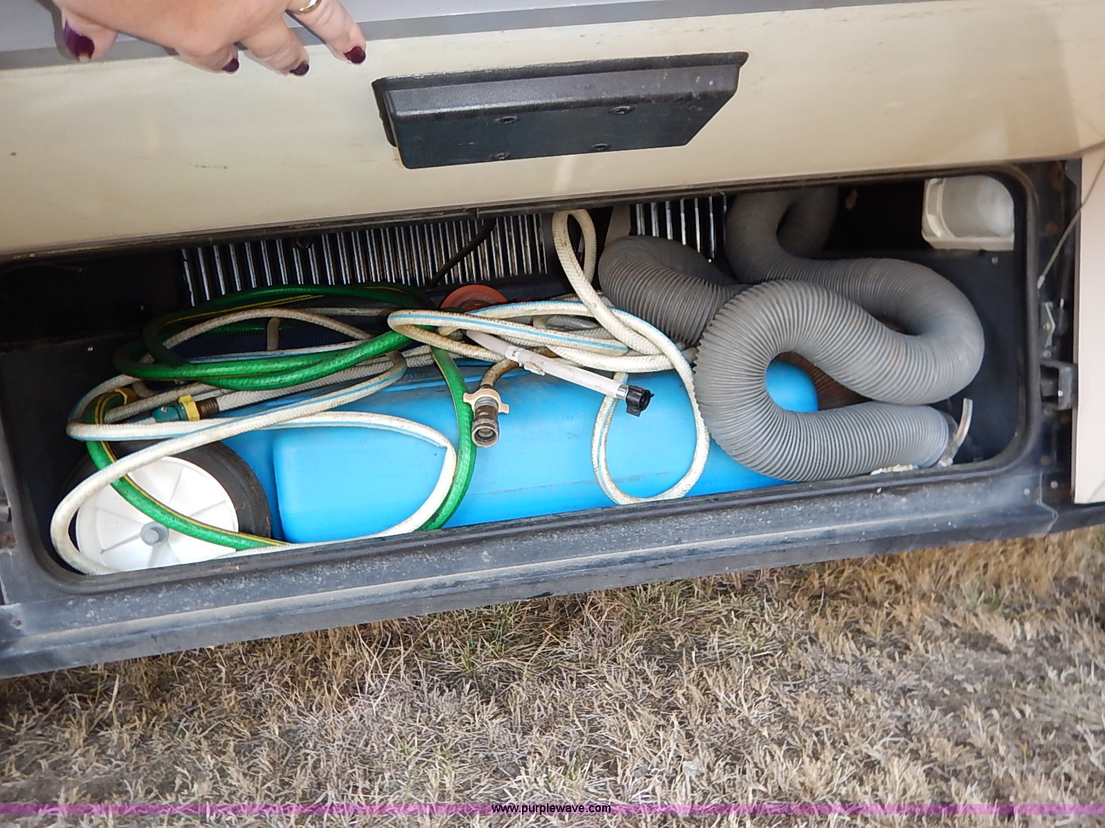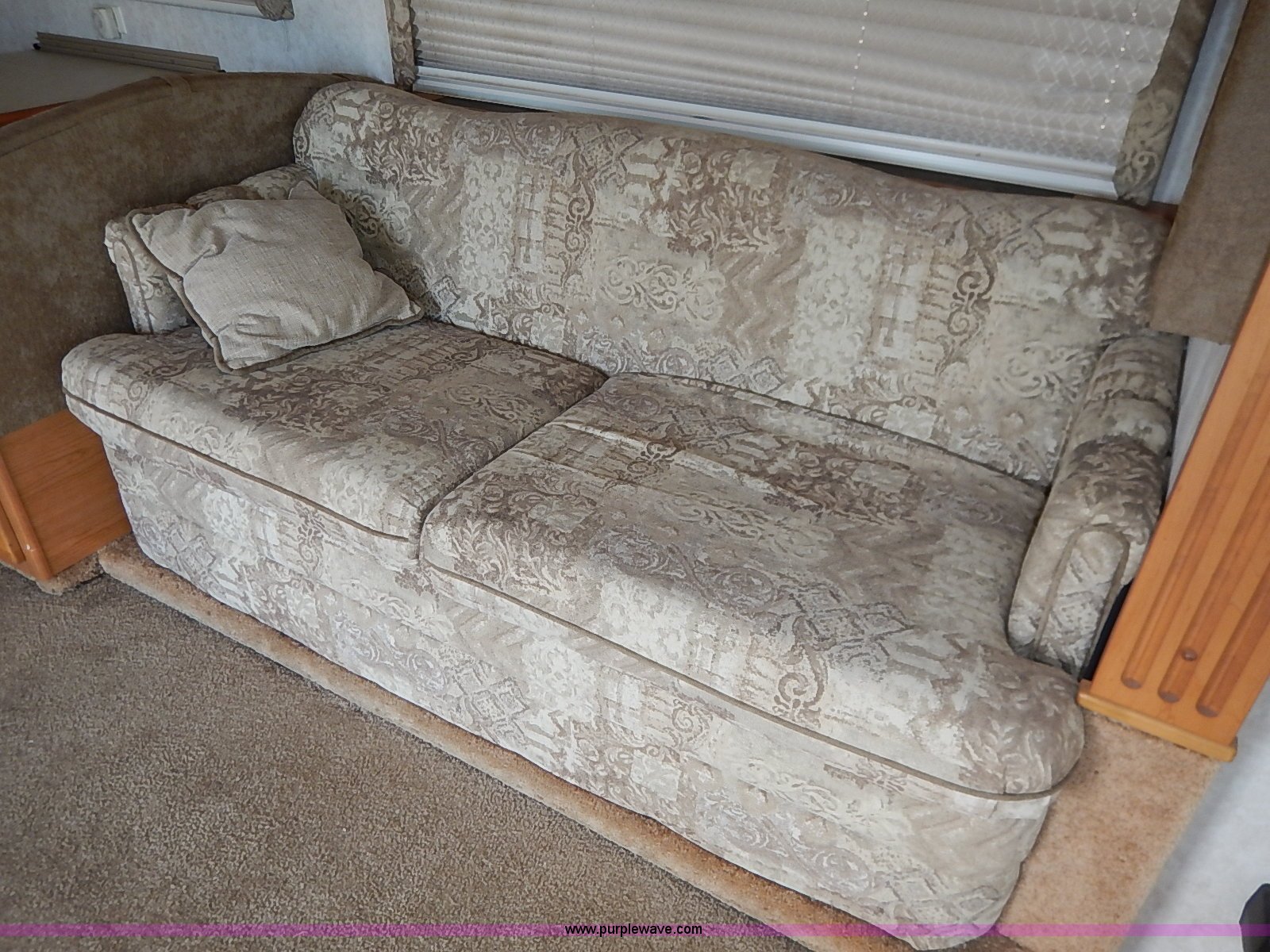 Purple Wave is selling a used RV in Kansas. This item is a 2000 Ford 36T Fleetwood Southwind RV with the following: 44,556 miles on odometer, 6.8L V10 EFI-SOHC gas engine, Automatic transmission, AC and heat, Tilt, Cruise, AM/FM/CD, Manual windows and locks, Leather interior, Fog lights, Panasonic 20" television, Onan Marquis 5500 generator, 302 hours on meter, Carburetor needs rebuilt, Recliner, Couch, Carpeting, (2) Canopies, Cabinets, Table, Benches, Sink, Magic Chef oven, Sharp microwave, Refrigerator/freezer, Bathroom, Shower, Sink, Toilet, Bedroom, Bed, Cabinets, Panasonic 14" television, (2) fold outs and slide outs, Receiver hitch, Trailer wiring, 245/70R19.5 tires, Recently replaced battery, Winterized, Rear bumper missing, Exterior cosmetic damage, Cracked windshield