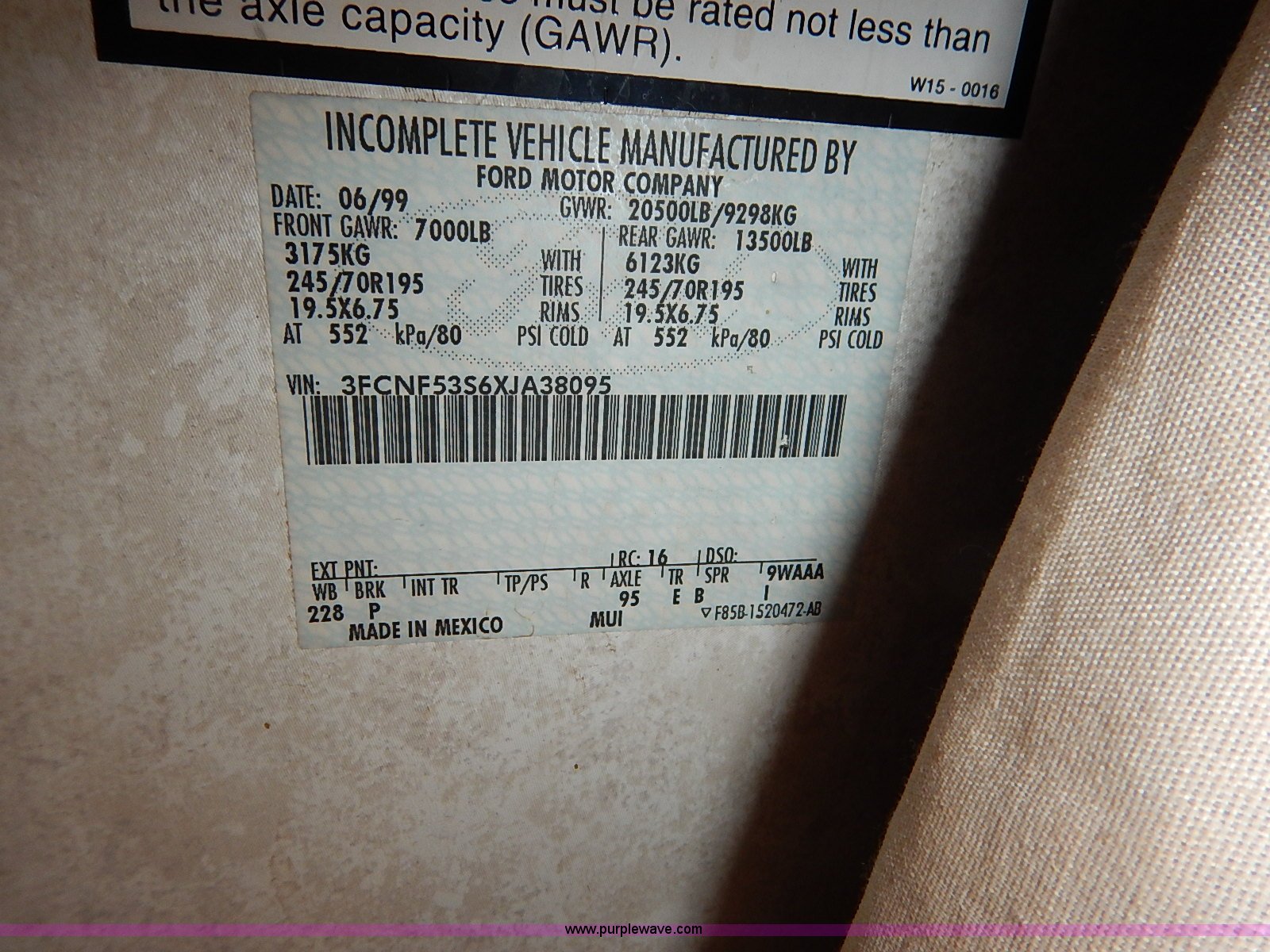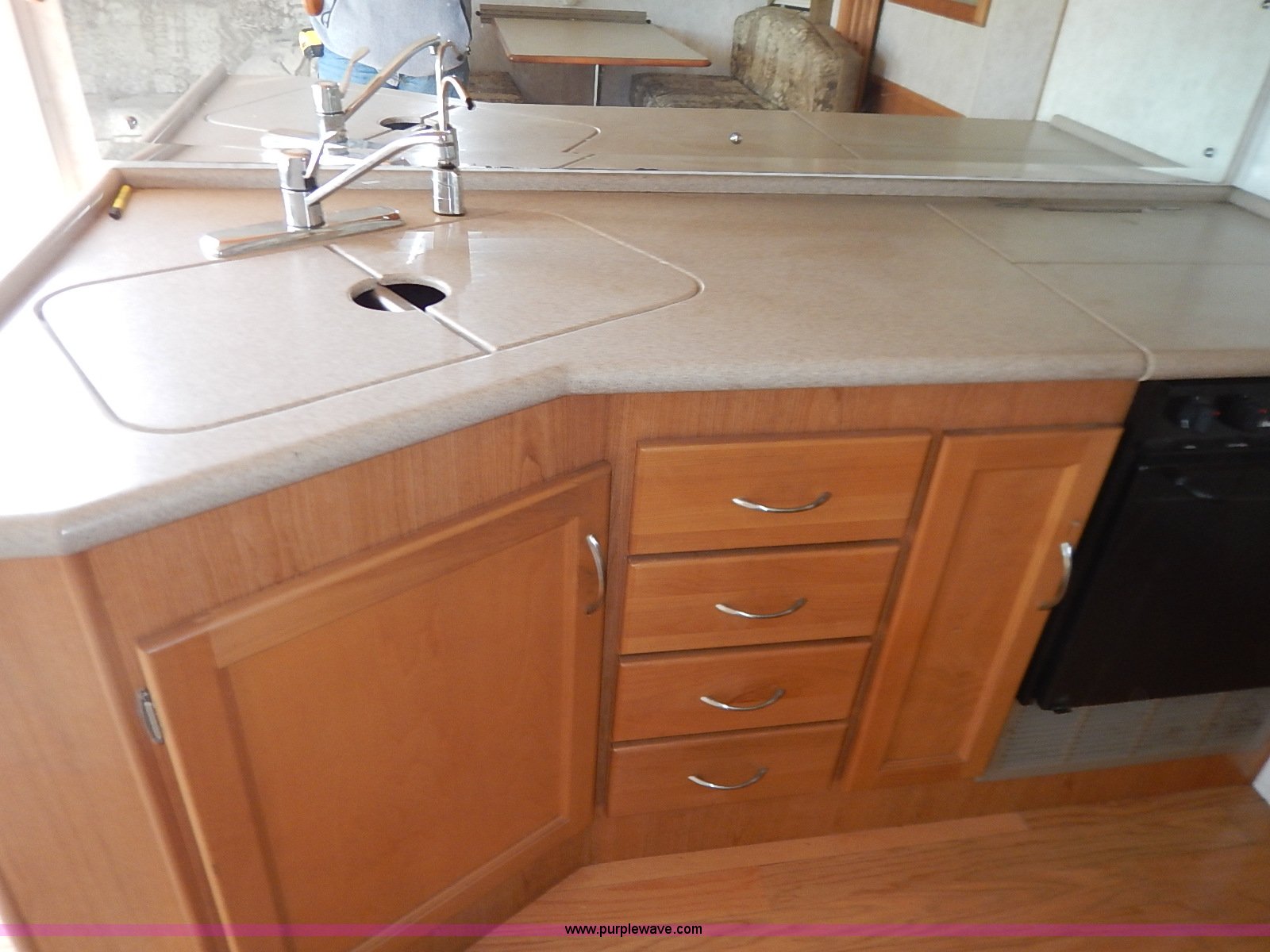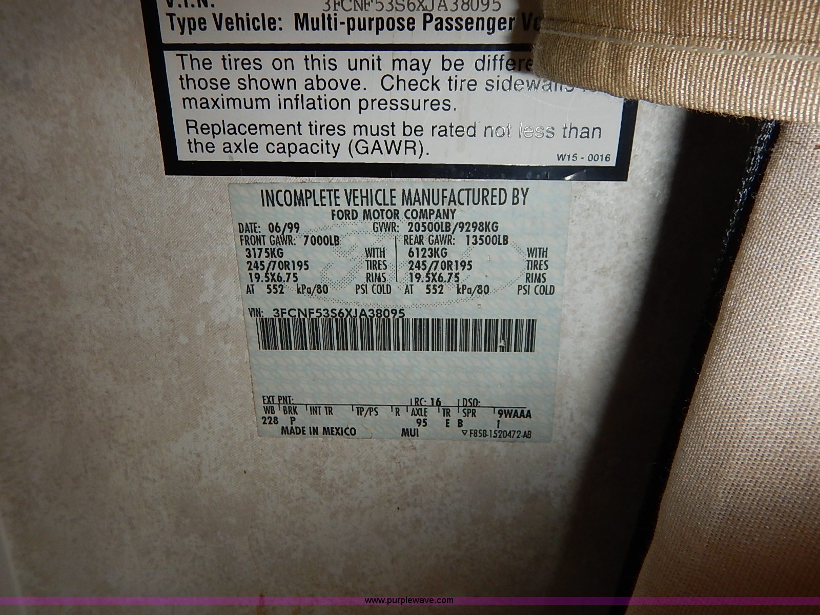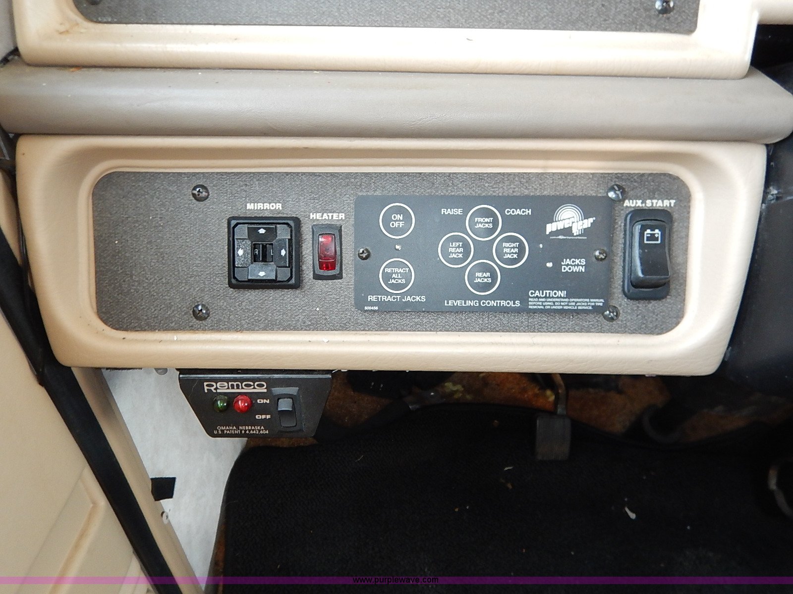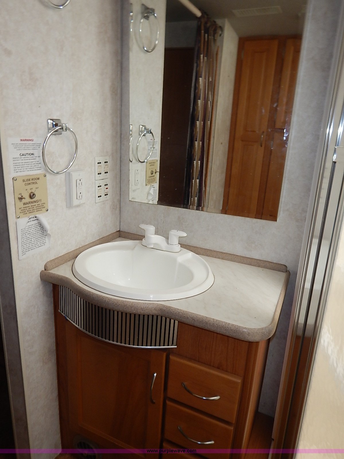 Purple Wave is selling a used RV in Kansas. This item is a 2000 Ford 36T Fleetwood Southwind RV with the following: 44,556 miles on odometer, 6.8L V10 EFI-SOHC gas engine, Automatic transmission, AC and heat, Tilt, Cruise, AM/FM/CD, Manual windows and locks, Leather interior, Fog lights, Panasonic 20" television, Onan Marquis 5500 generator, 302 hours on meter, Carburetor needs rebuilt, Recliner, Couch, Carpeting, (2) Canopies, Cabinets, Table, Benches, Sink, Magic Chef oven, Sharp microwave, Refrigerator/freezer, Bathroom, Shower, Sink, Toilet, Bedroom, Bed, Cabinets, Panasonic 14" television, (2) fold outs and slide outs, Receiver hitch, Trailer wiring, 245/70R19.5 tires, Recently replaced battery, Winterized, Rear bumper missing, Exterior cosmetic damage, Cracked windshield