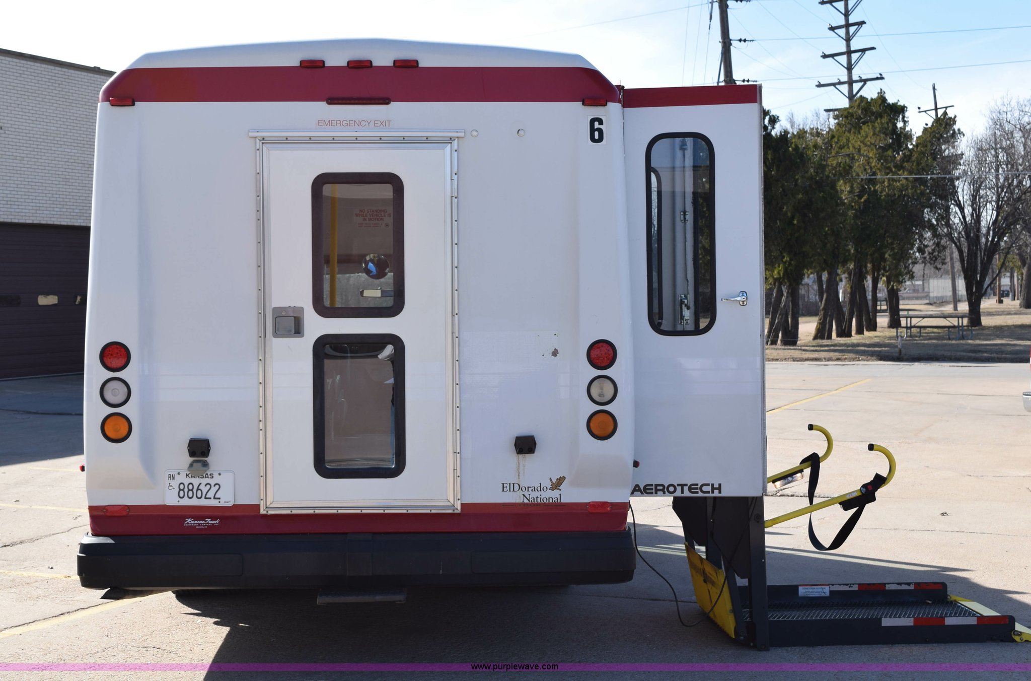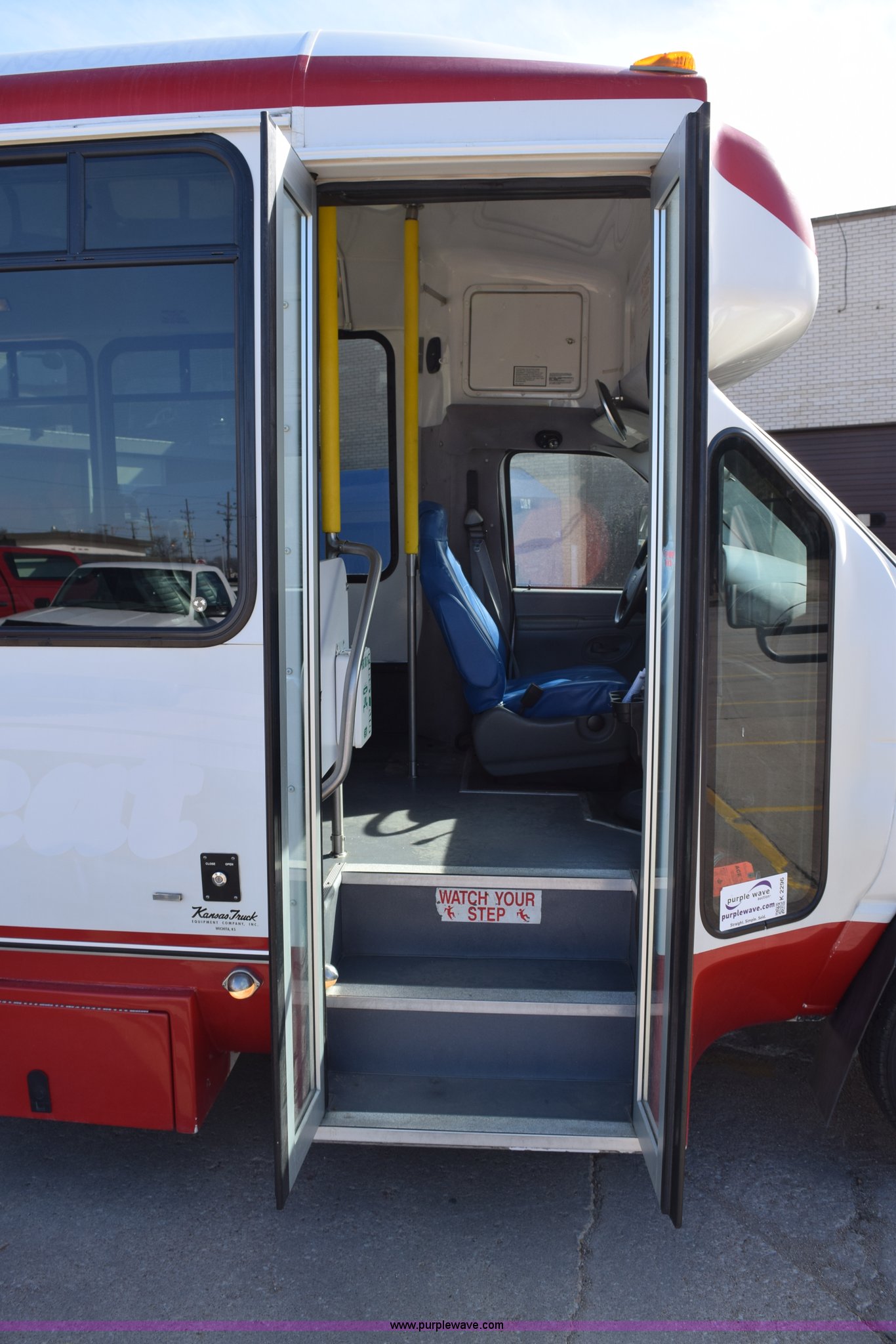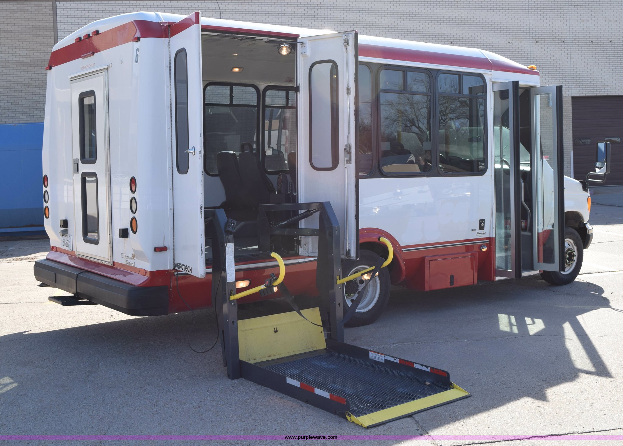 Purple Wave is selling a used Bus in Kansas. This item is a 2006 Ford E350 Super Duty bus with the following: 138,986 actual miles, 6.8L V10 SOHC 20V gas engine, Automatic transmission, AC and heat, Tilt, Cruise, AM/FM/CD, Manual windows and locks, Power seats, Vinyl interior, 10 passenger capacity, Ricon lift, Model S5510, Serial 00201873, Electric wheelchair lift, Electric folding passenger door, 225/75R16 tires, Unit# 6