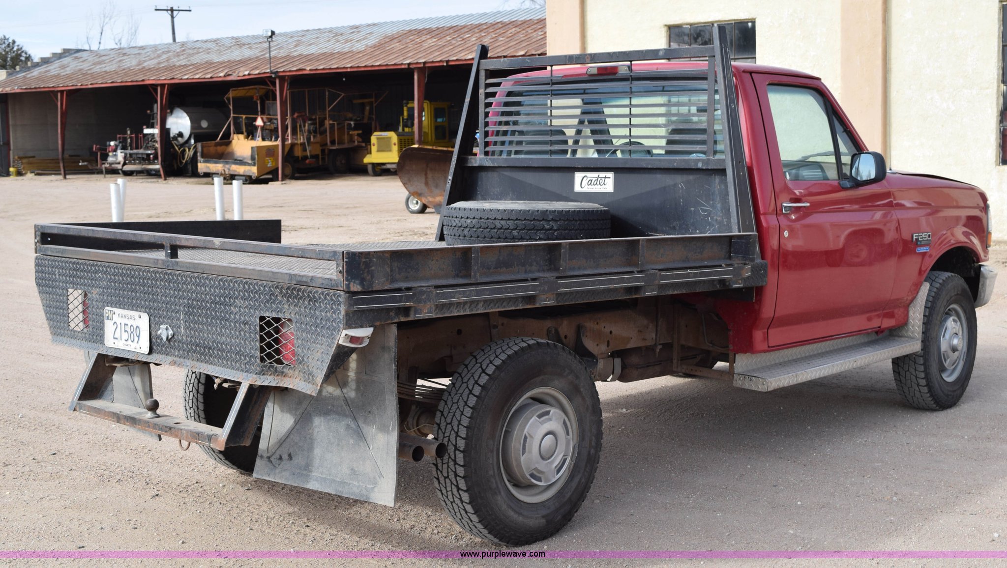 Purple Wave is selling a used 3/4 or 1 Ton Pickup or Van in Kansas. This item is a 1994 Ford F250 XL HD flatbed pickup truck with the following: 118,116 miles on odometer, 5.8L V8 OHV 16V gas engine, Automatic transmission, Four wheel drive, AC and heat, AM/FM, Manual windows and locks, Vinyl interior, Cadet flatbed, 8'L x 7'W x 5"H, Removable stake side rail, 235/85R16 tires, Interior/exterior cosmetic damage, Rear bed corner damage, Hood damage, Rust