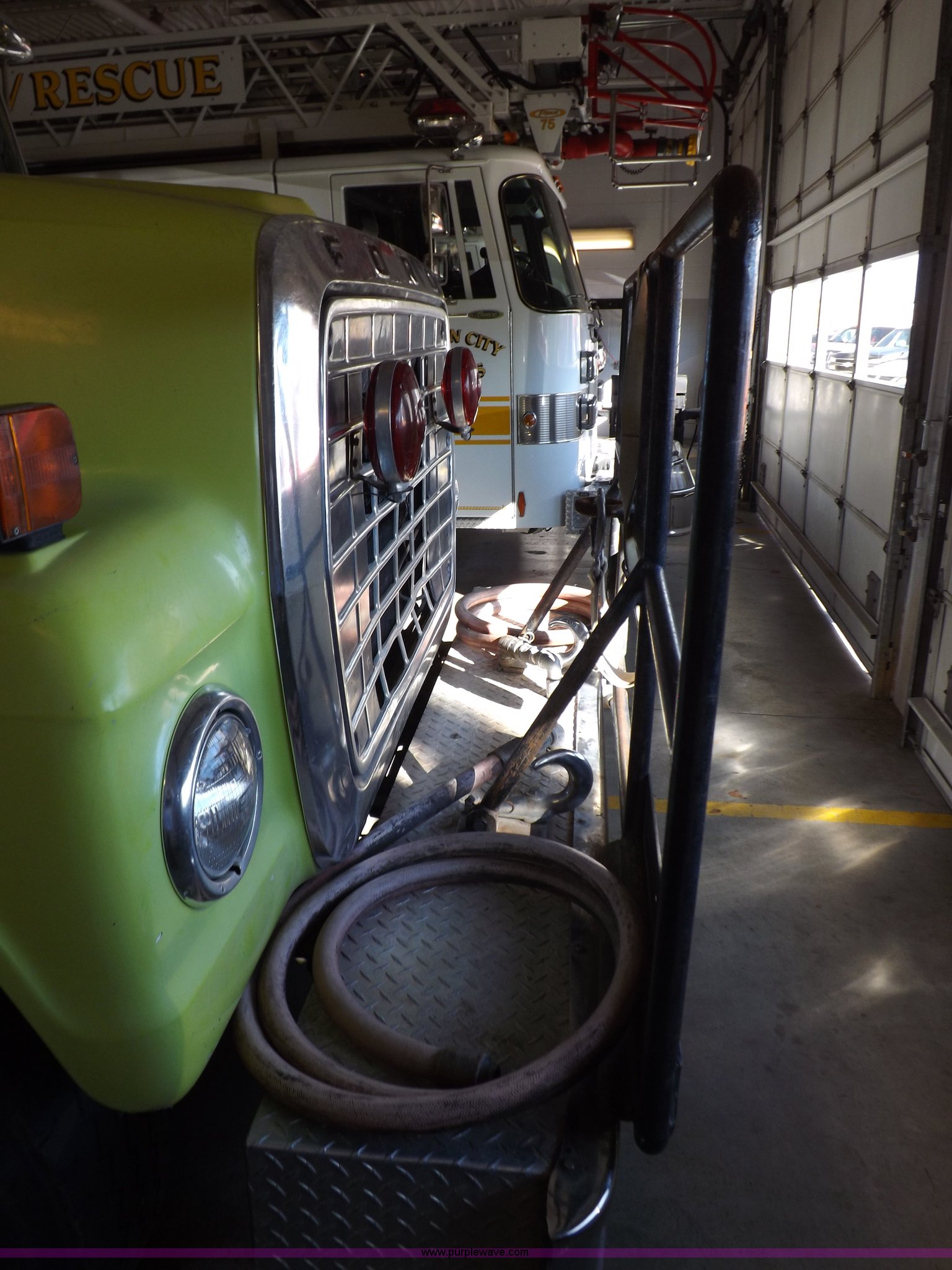 1980 Ford 700 fire truck. 48,107 actual miles, Ford 429 V8 gas engine, Five speed manual transmission, Two speed rear end, Heat, PTO, Emergency One bed (7) storage compartments, 500 gallon tank, Pump and roll capable, Approximately 100'L x 1" booster line Electric wind, Hale 250 gallon per minute PTO pump, Approximately 50 gallon fuel tank, Spring suspension, Hydraulic brakes, 148" wheelbase, 10.00R20 tires, Needs water manifold. N70KVGG5257. Garden City Fire Department. 302 N 9th Street. Garden City, KS 67846