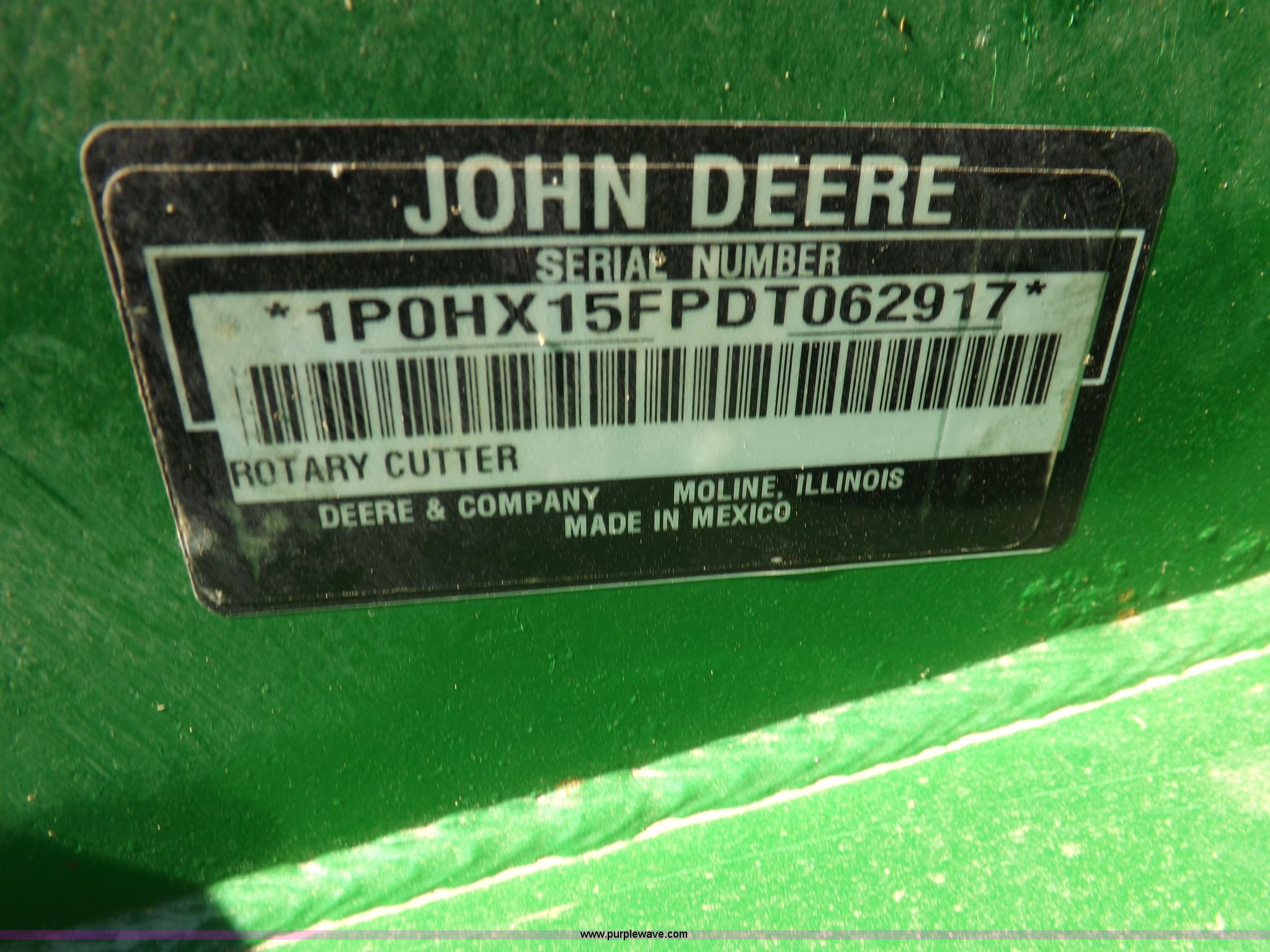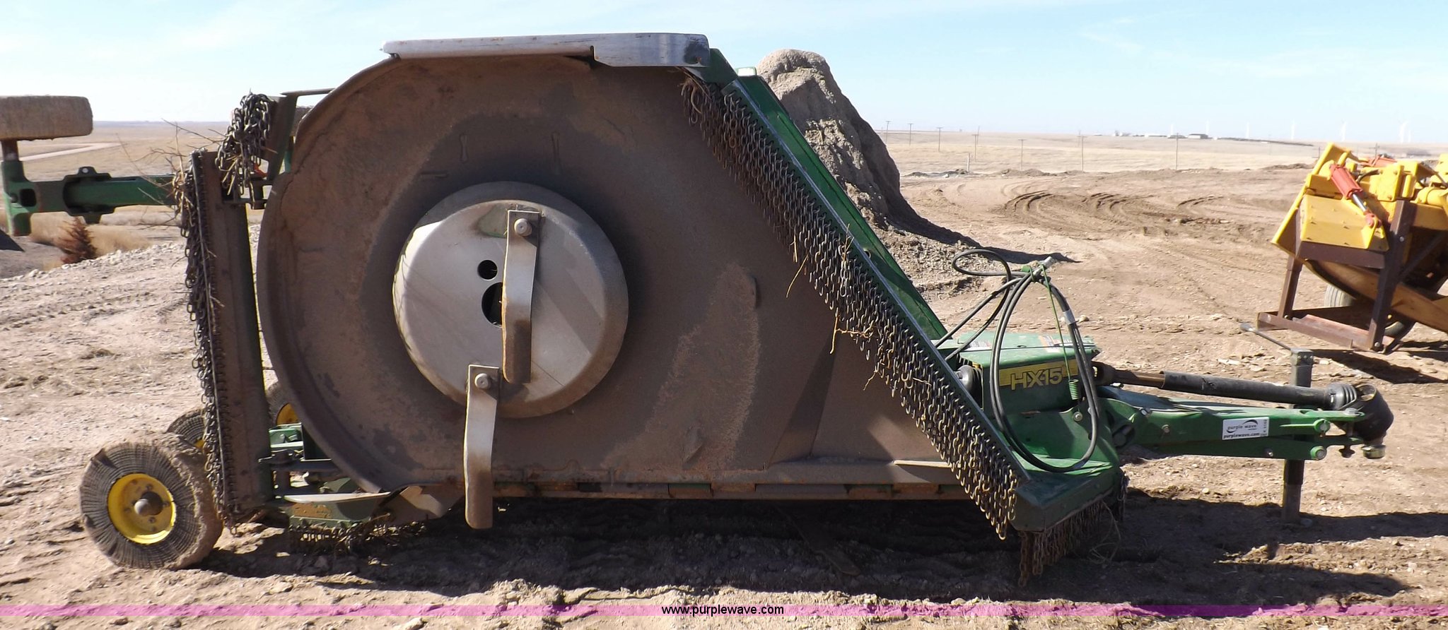 Purple Wave is selling a used Mower, Cutter, Shredder in Kansas. This item is a John Deere HX15 batwing rotary mower with the following: 15' cutting capacity, Dual chain guards, 5,000 lbs jack, Small 1000 PTO, 5" x 20" laminated tires, Serial 1P0HX15FP0T062917