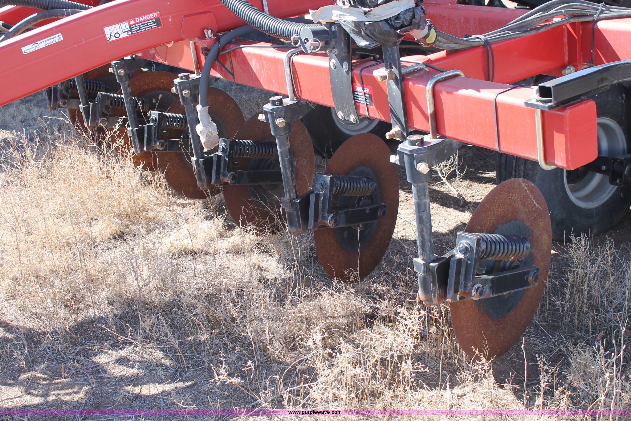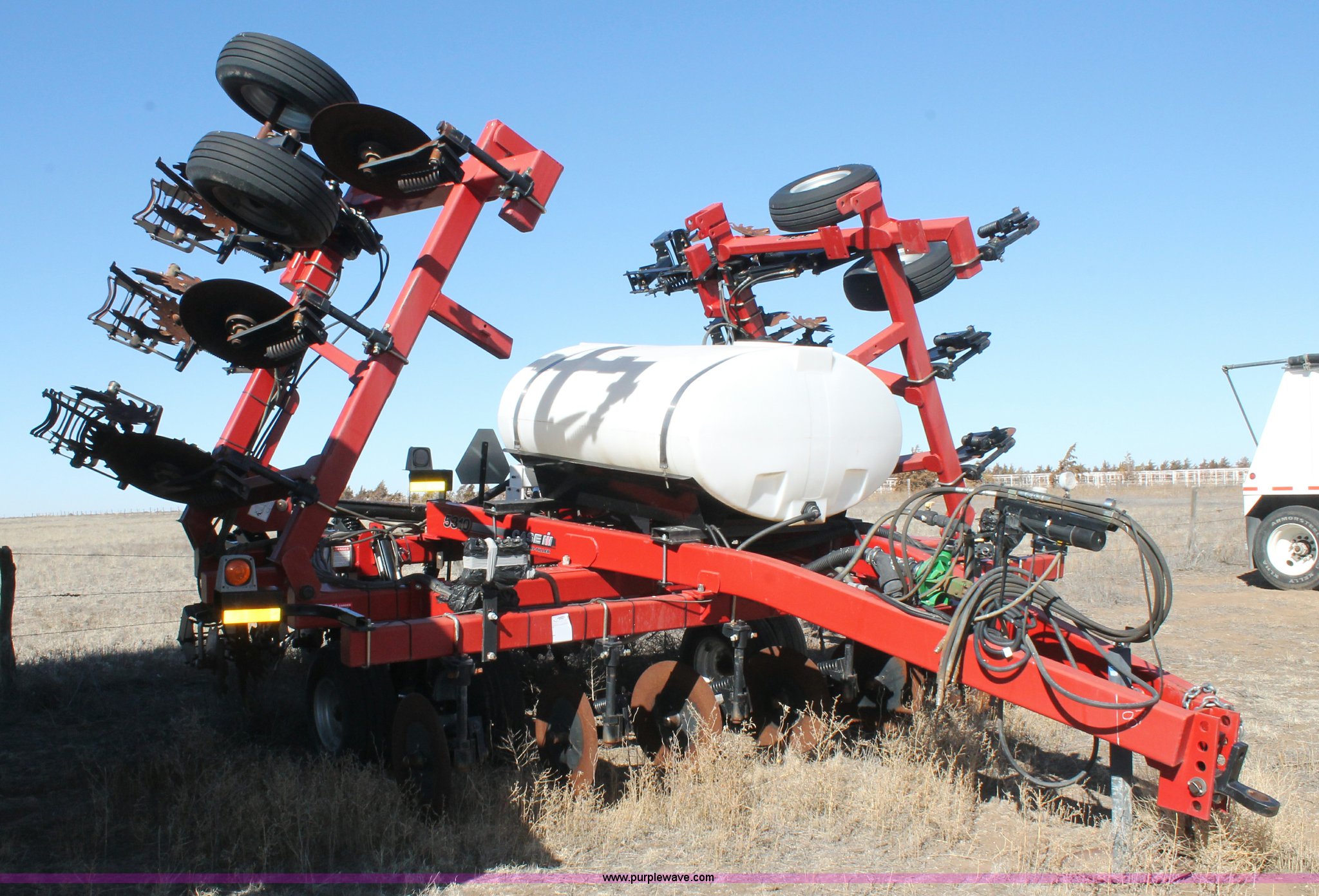 Purple Wave is selling a used Strip-Till in Texas. This item is a 2009 Case IH DMI5310 strip-till with the following: 12 rows, 30" row spacing, 23 3/4" front spring down pressure coulters, Sunco trash disks, Spring loaded, 18" closing disks, Double tube knives with points, Spring loaded bed conditioners, John Blue liquid ball system, 500 gallon fertilizer tank, Hydraulic raise and lower, Hydraulic fold, Raven NH3 super cooler, Rear anhydrous hose, (2) Raven controls, SCS 450, SCS 440, 4" x 6" square tubing, Clevis and pin hitch, 9.5L-15 wing tires, 12.5L-15 main tires, Serial JFH0038295