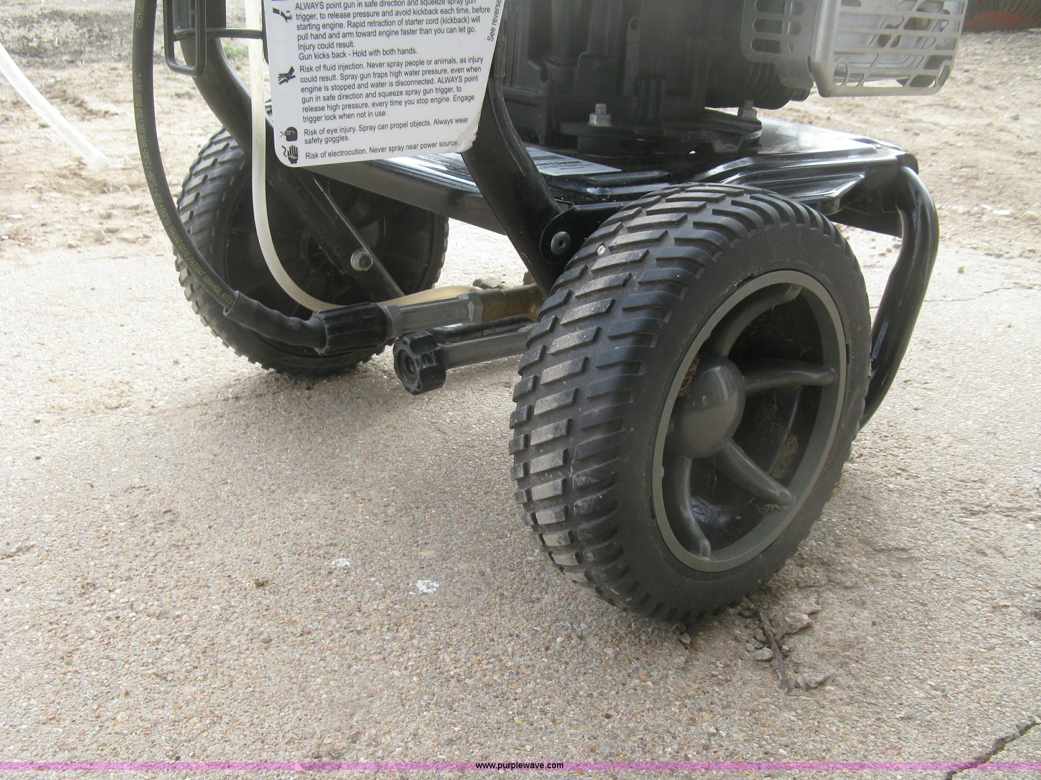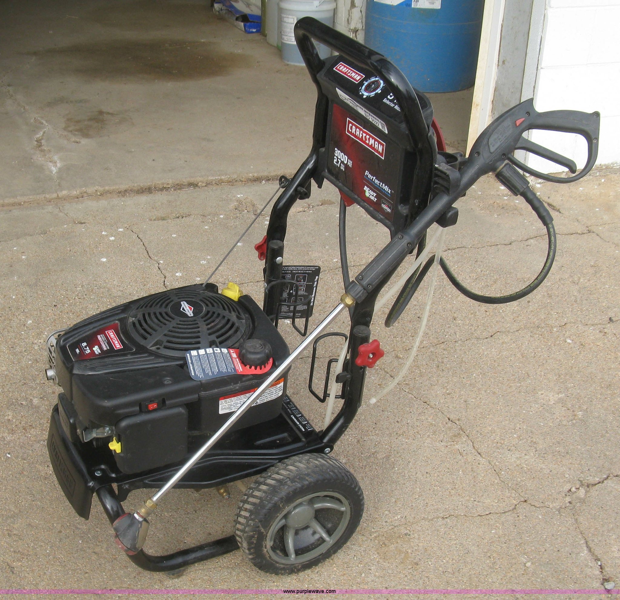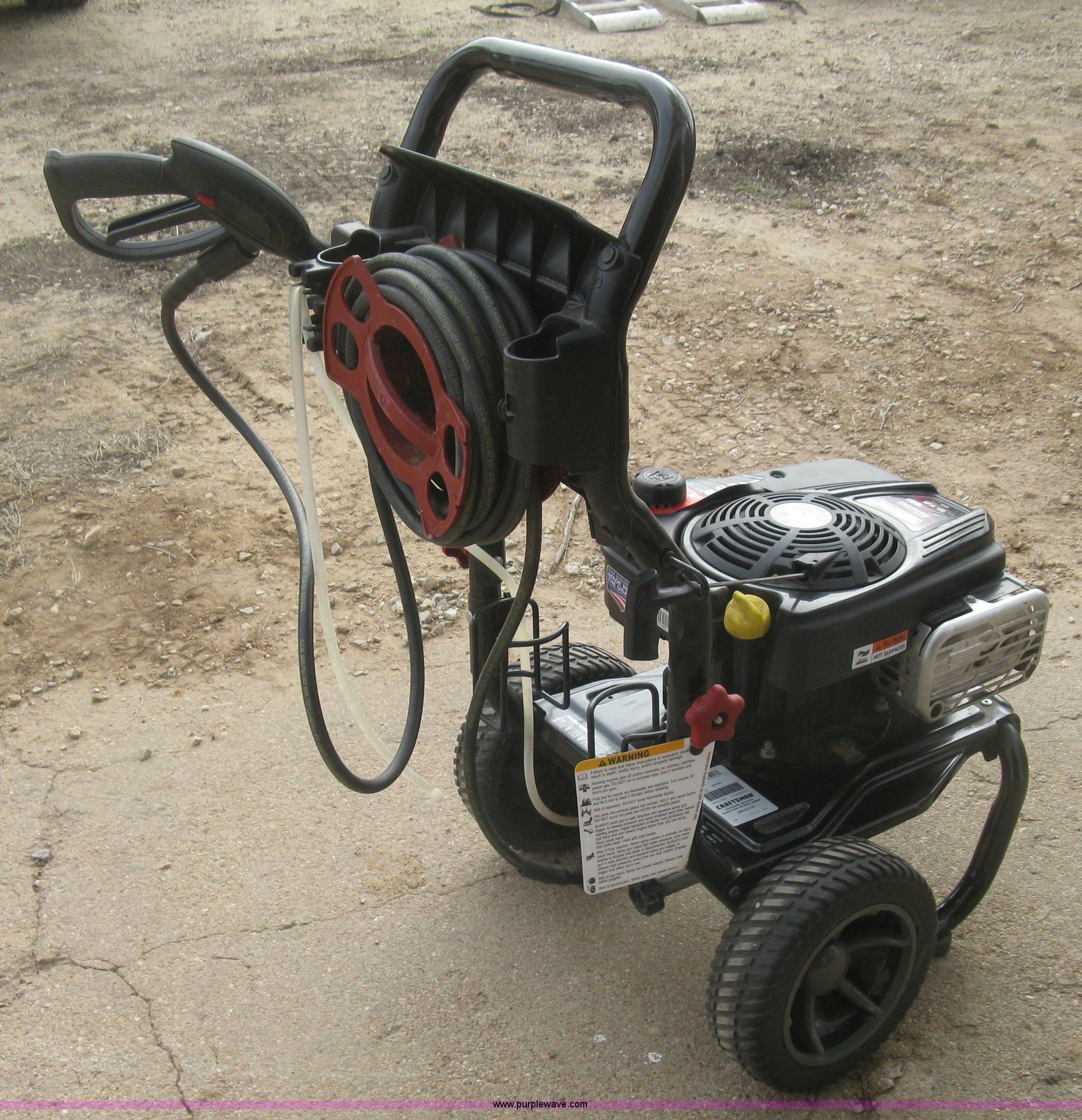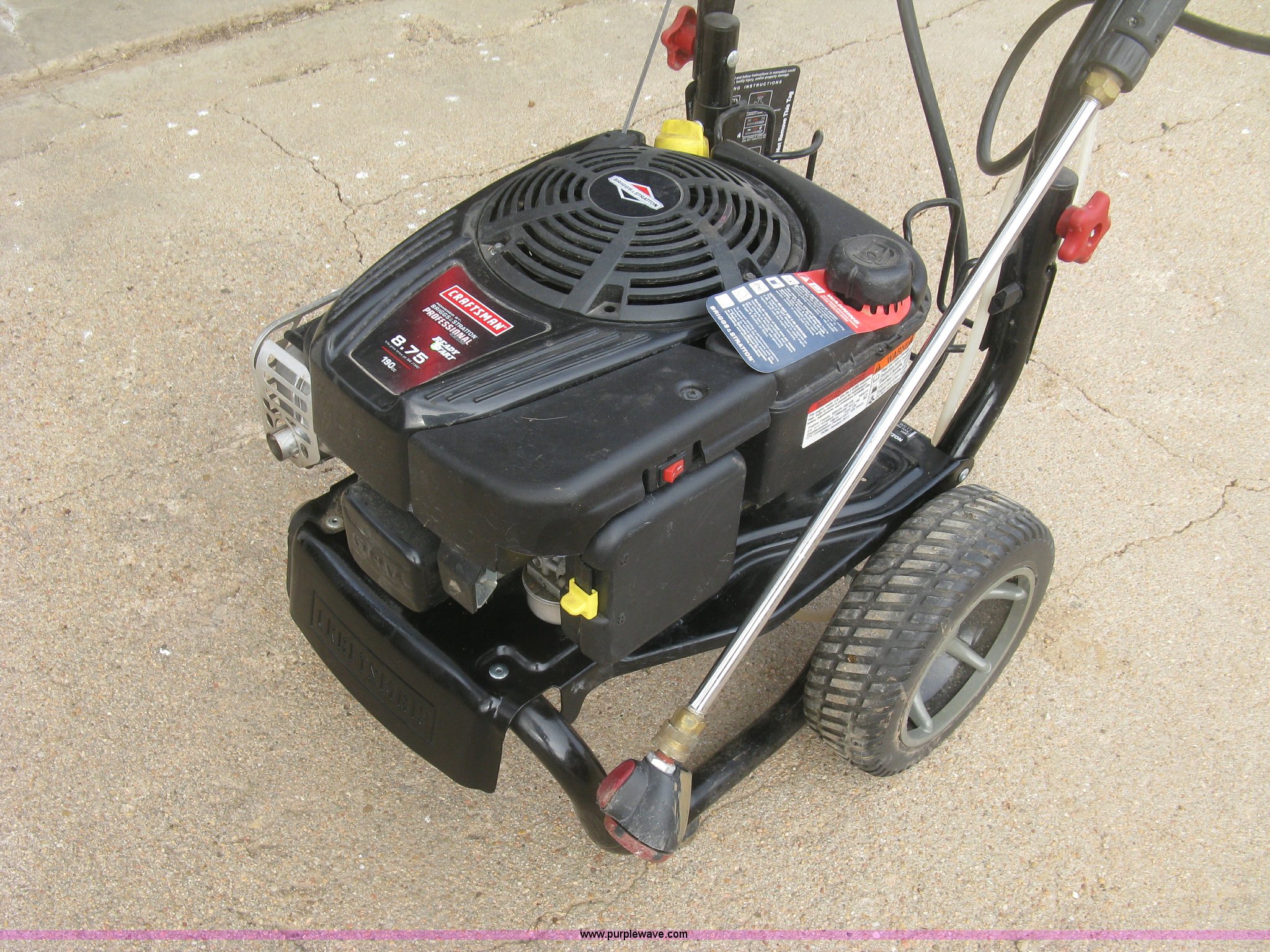 Purple Wave is selling a used Pressure Washer in Kansas. This item is a Craftsman high pressure washer with the following: Briggs & Stratton gas engine, 8.75 HP, 3,000 max psi, 2.7 max gpm, Five in one selector nozzle, Hose and wand, Two wheel dolly cart mounted
