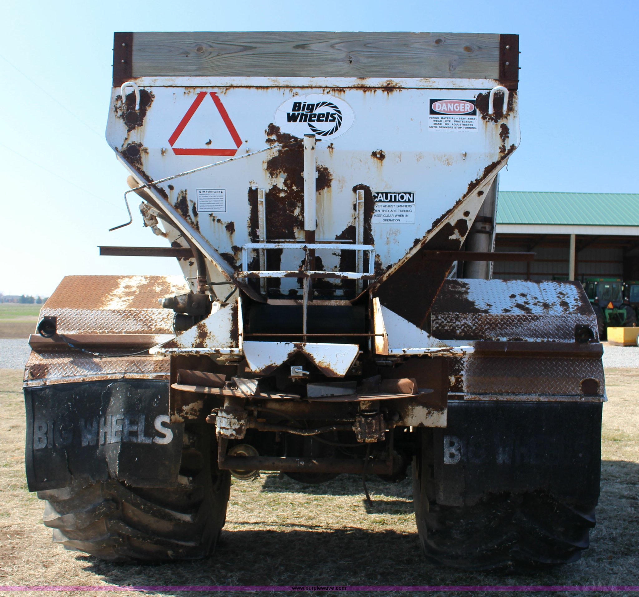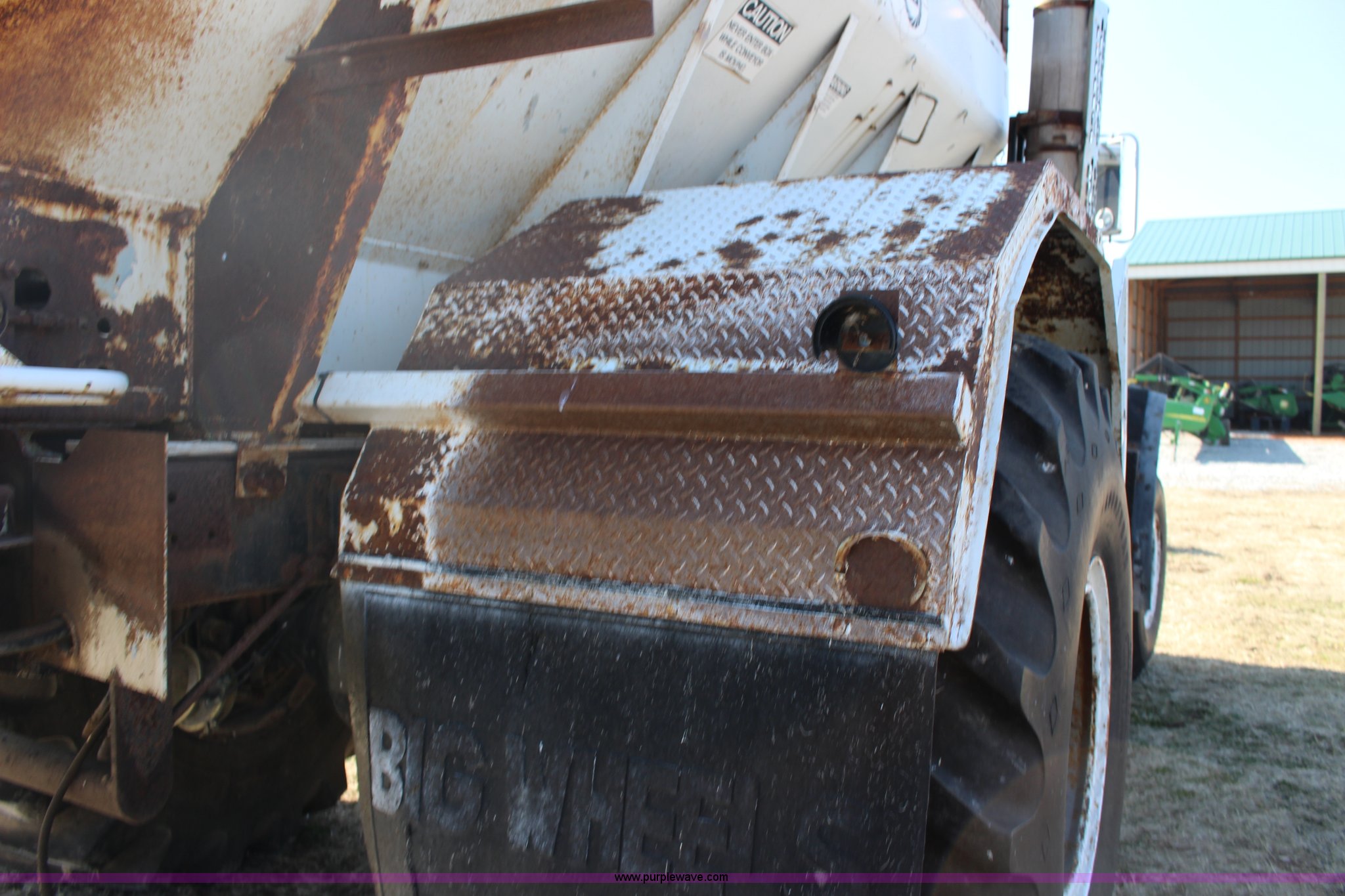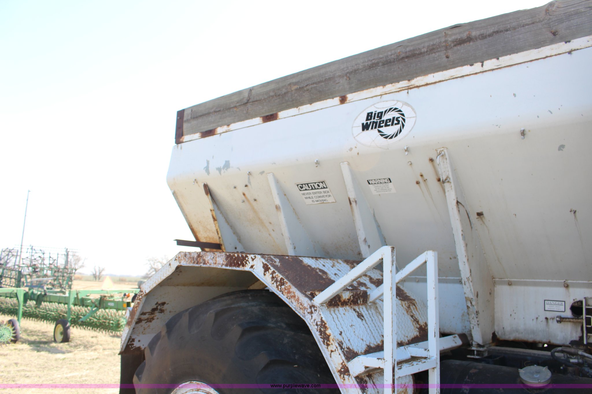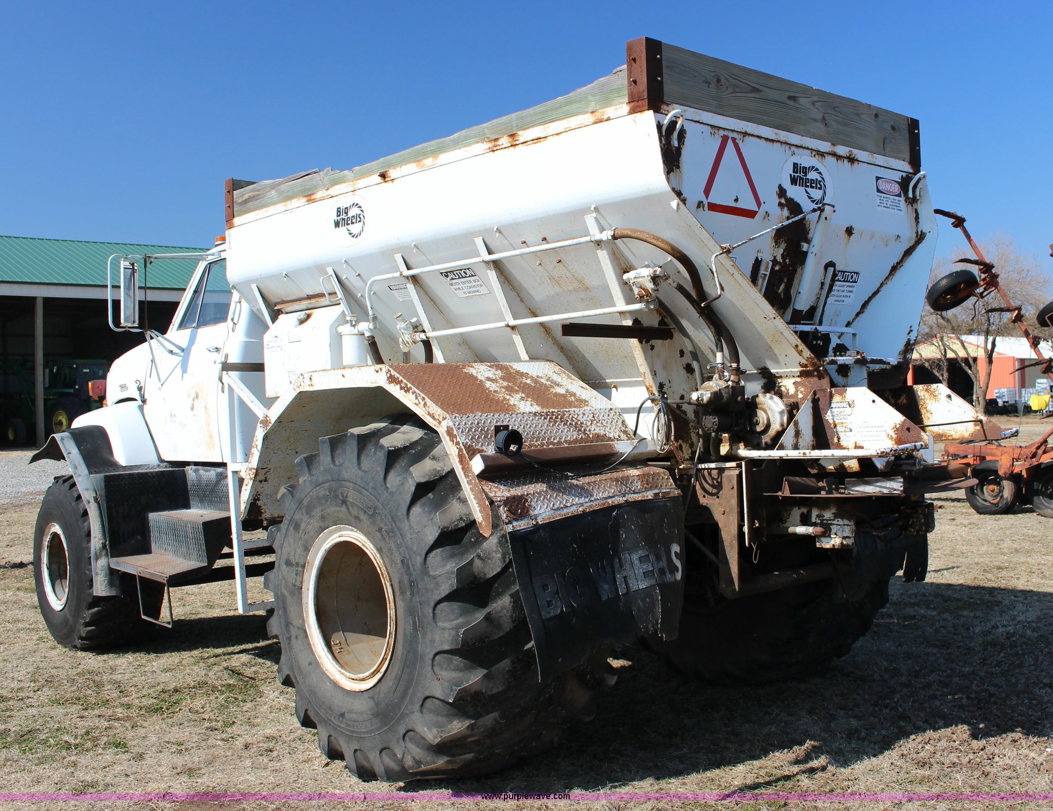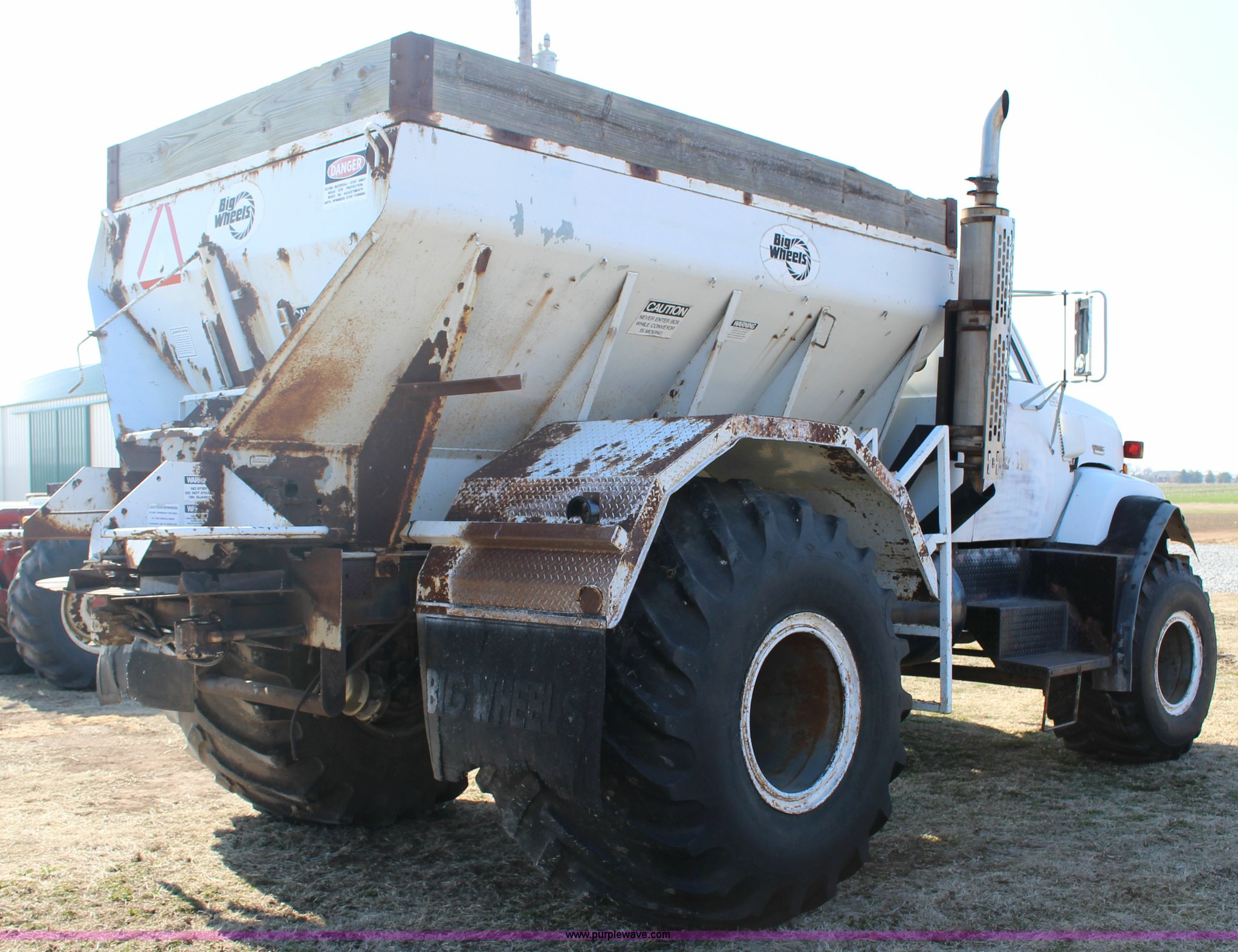 1978 GMC 7500 Big Wheels applicator. 79,796 miles on odometer, 2,997 hours on meter, General Motors V6 diesel engine, Allison automatic transmission, Eight ton spreader bed, 18x25.00-20 front tires, 66x43.00-25 rear tires, Operational when parked five years ago, Will not start. THV738V583925. Conway Springs, KS 67031