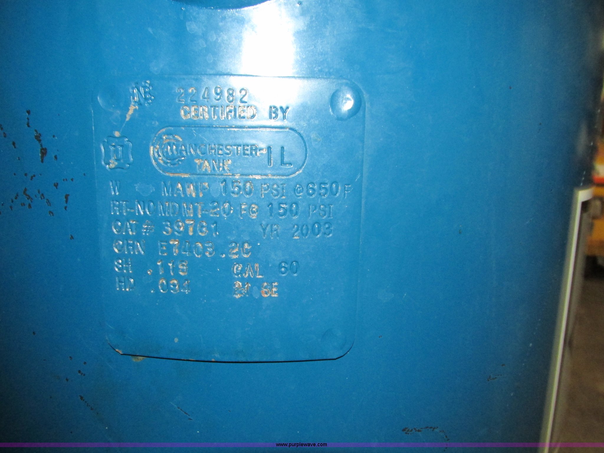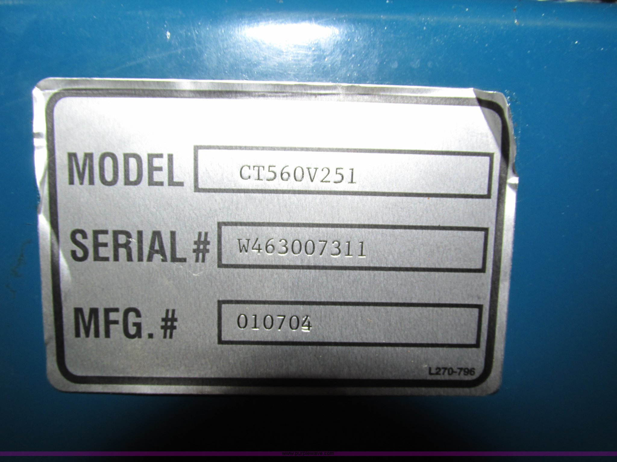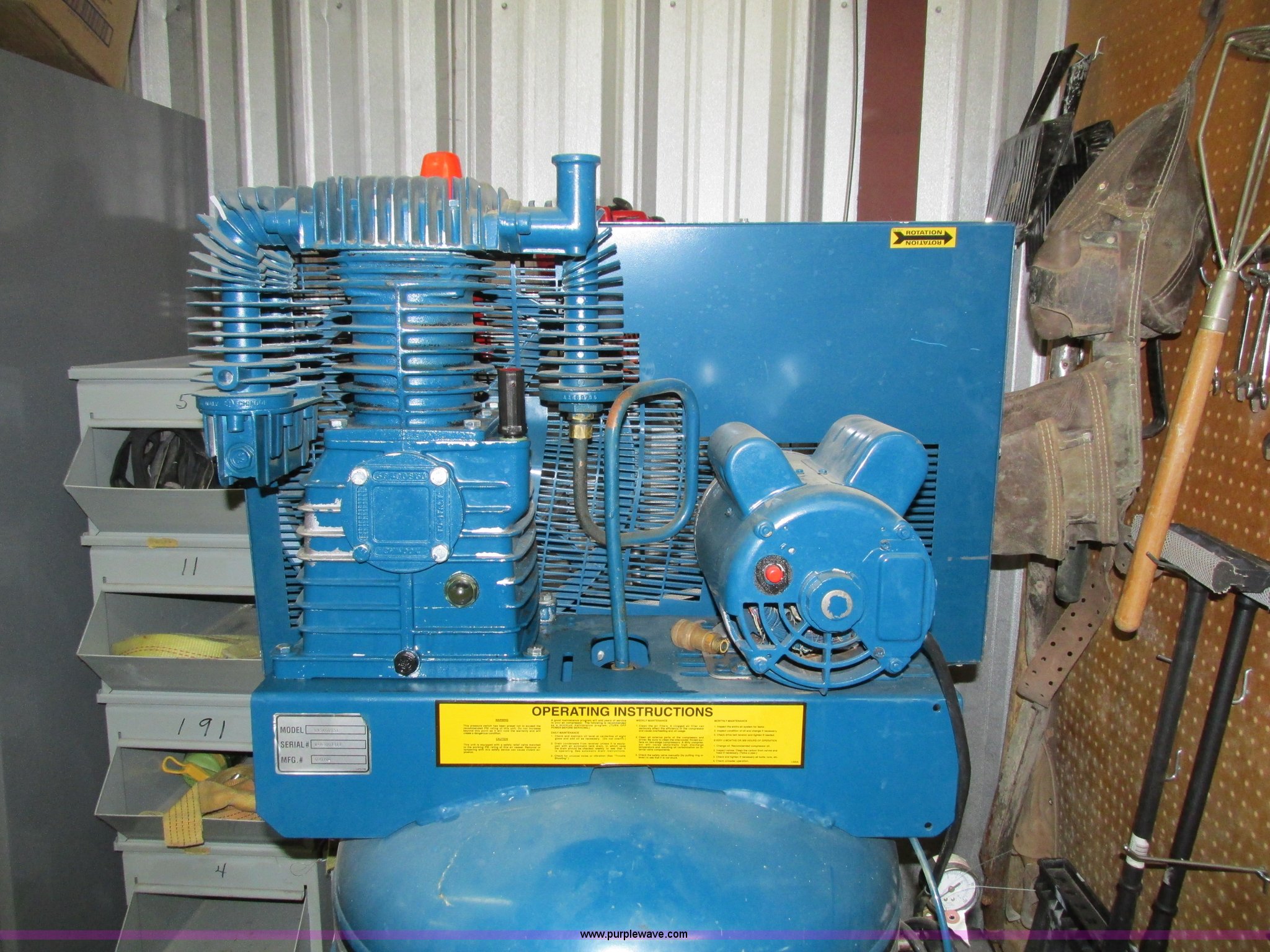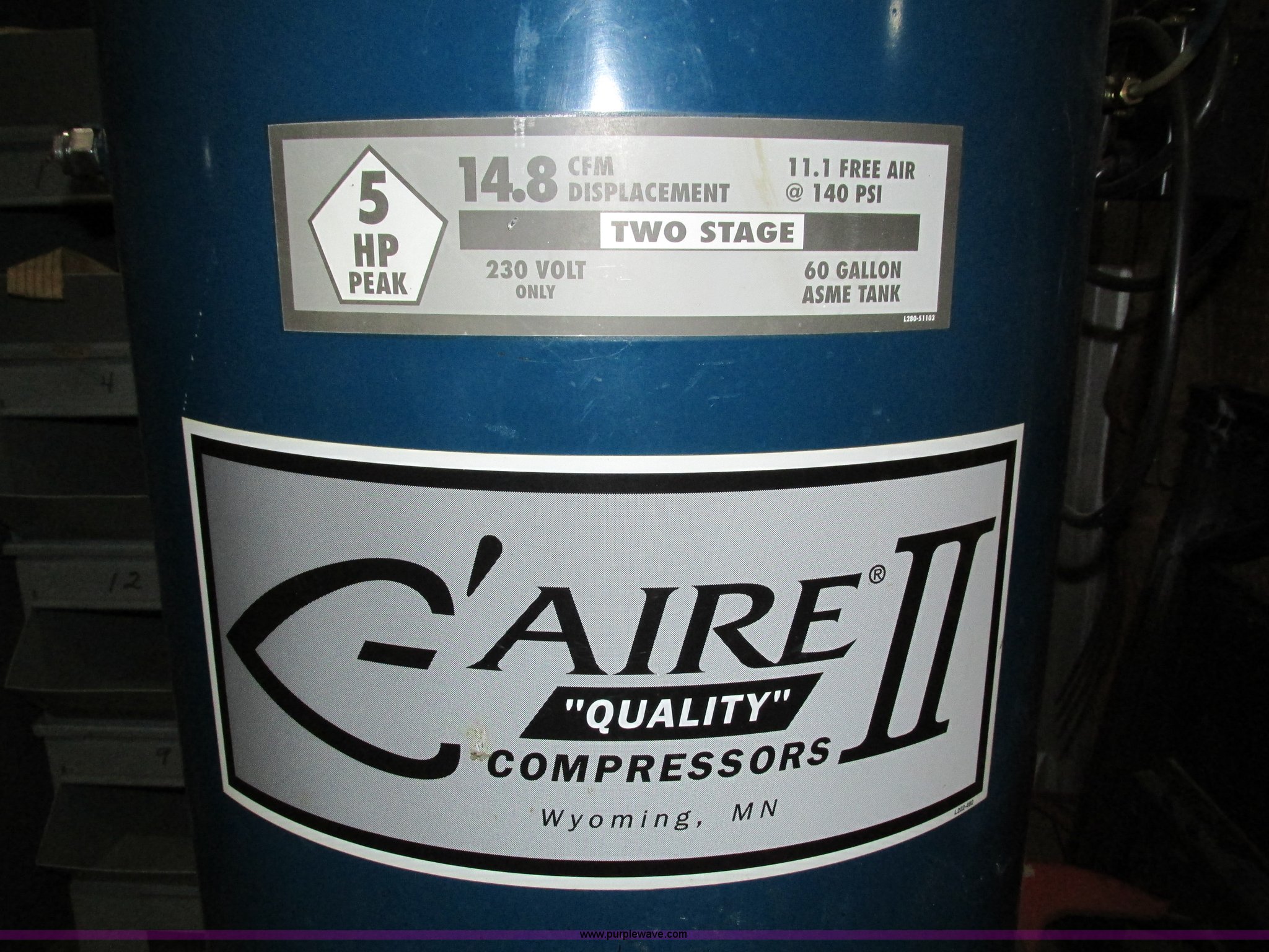 Purple Wave is selling a used Air Compressor in Iowa. This item is a Aire Quality air compressor with the following: Model CT560V251, Electric motor, 5 HP, 14.8 cfm, 230V, 60 gallon tank capacity, Serial W463007311
